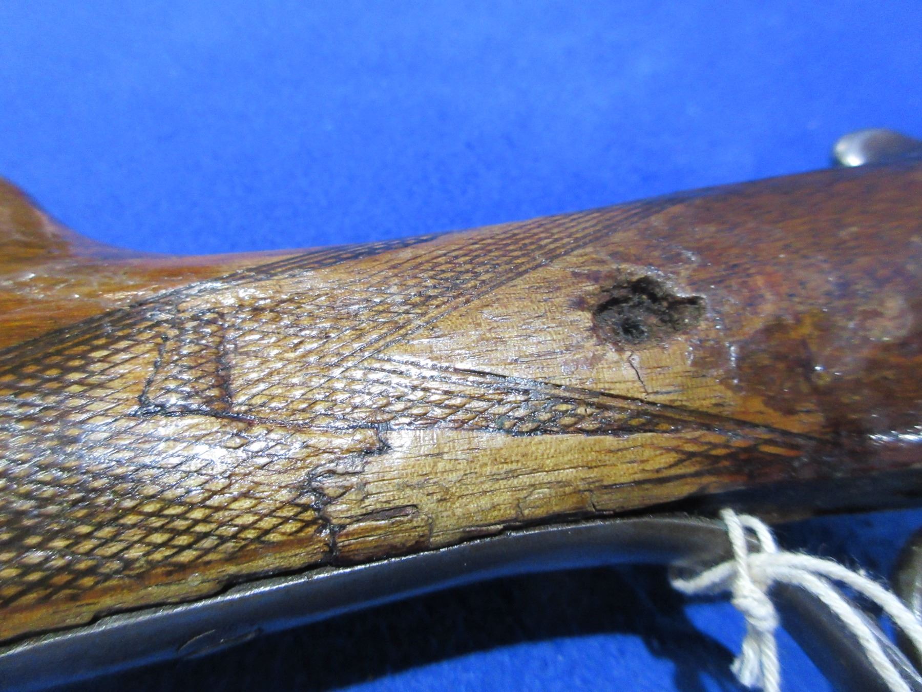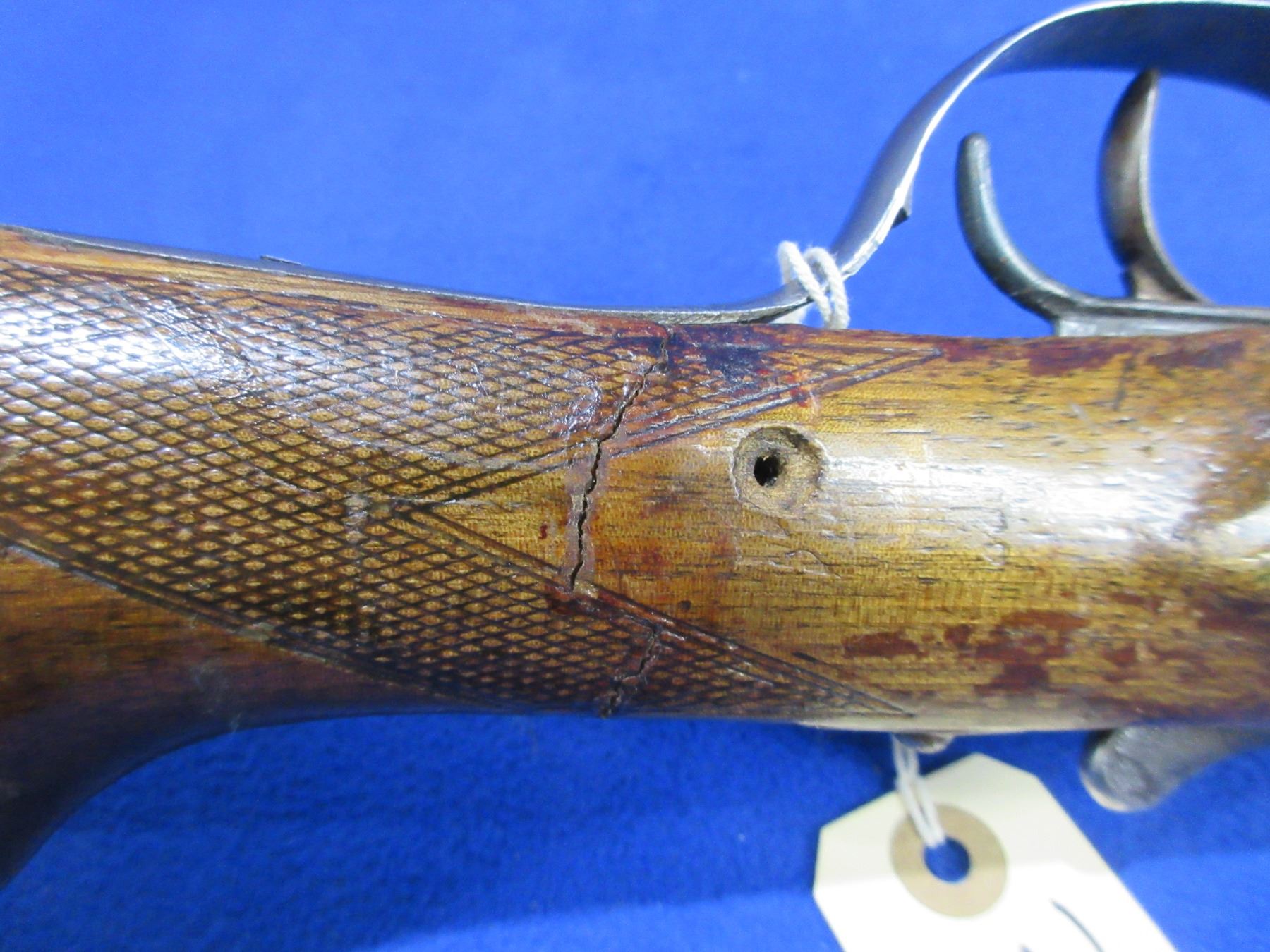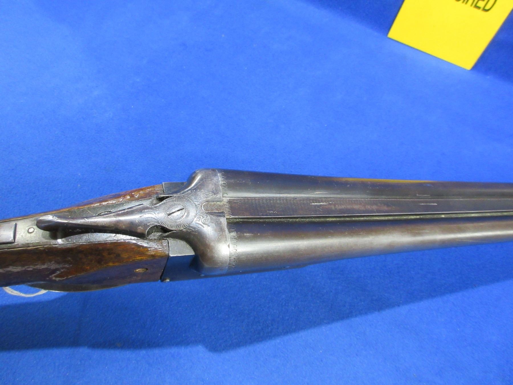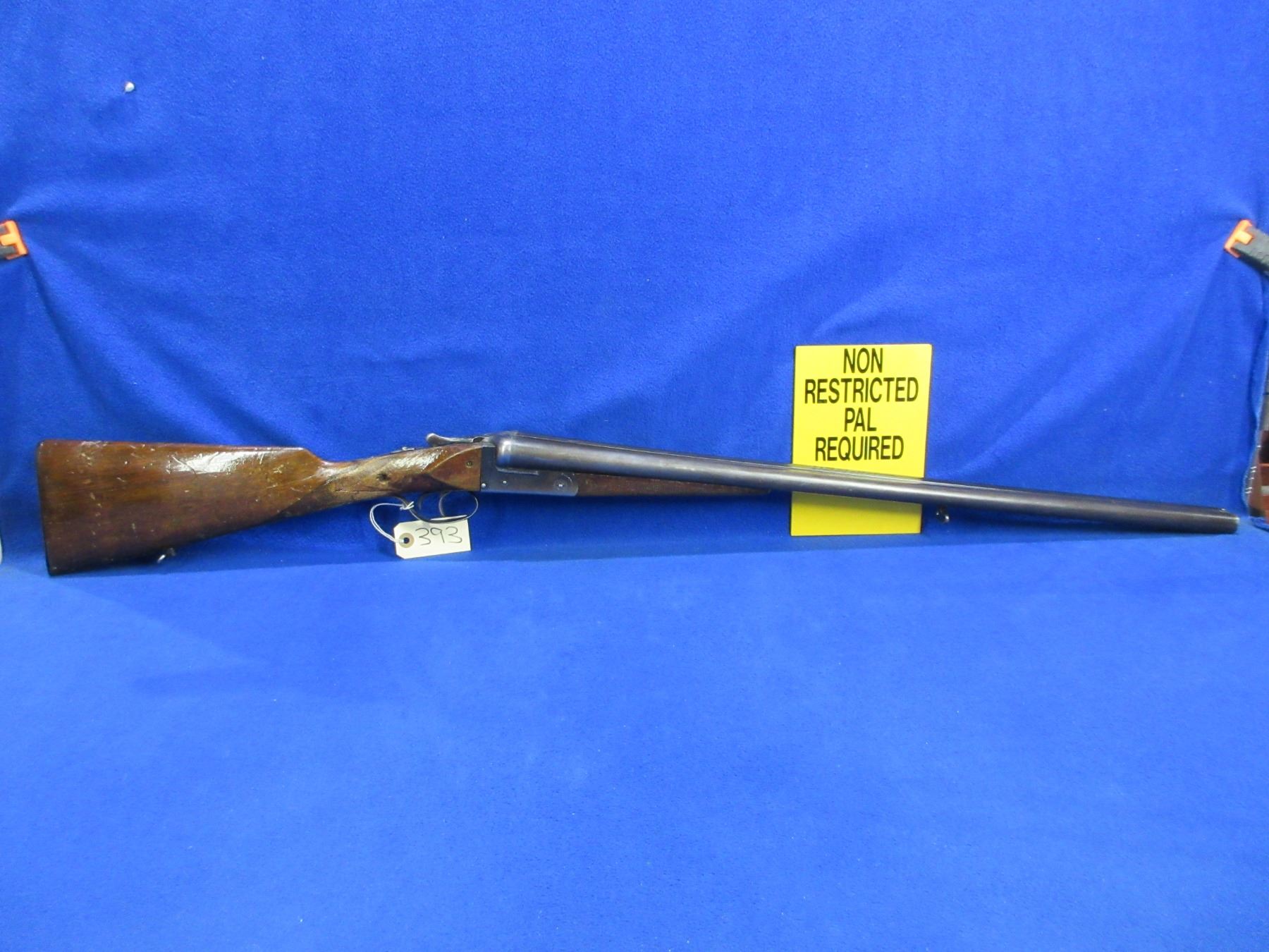 Non-Restricted - Aramberri Eibar SxS in 12 Ga. 2 3/4" - This tip up SXS shotgun appears to be in working order but should not be fired as stock is poorly repaired, action is tight. Barrels are 27 1/2", bores are good but both barrels have very small dents approx 12" from muzzle, bluing is turning brown with some light pitting, has bead front sight, stock is poorly repared in the wrist area and has been varnished or lacquered, forearm is good for age and varnished or lacquered, butt plate, comes with swivels. Ser # 22172