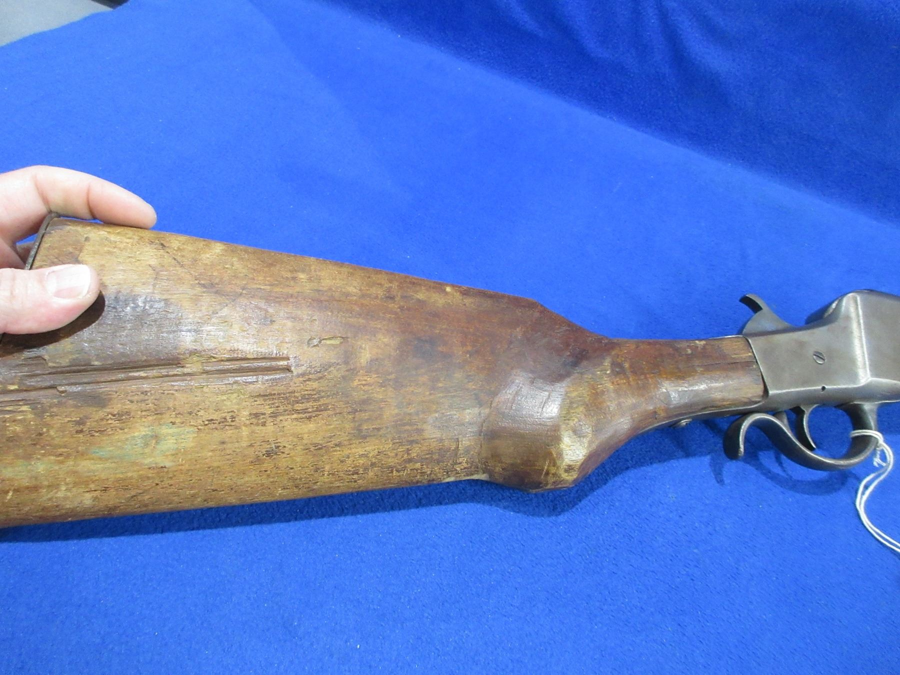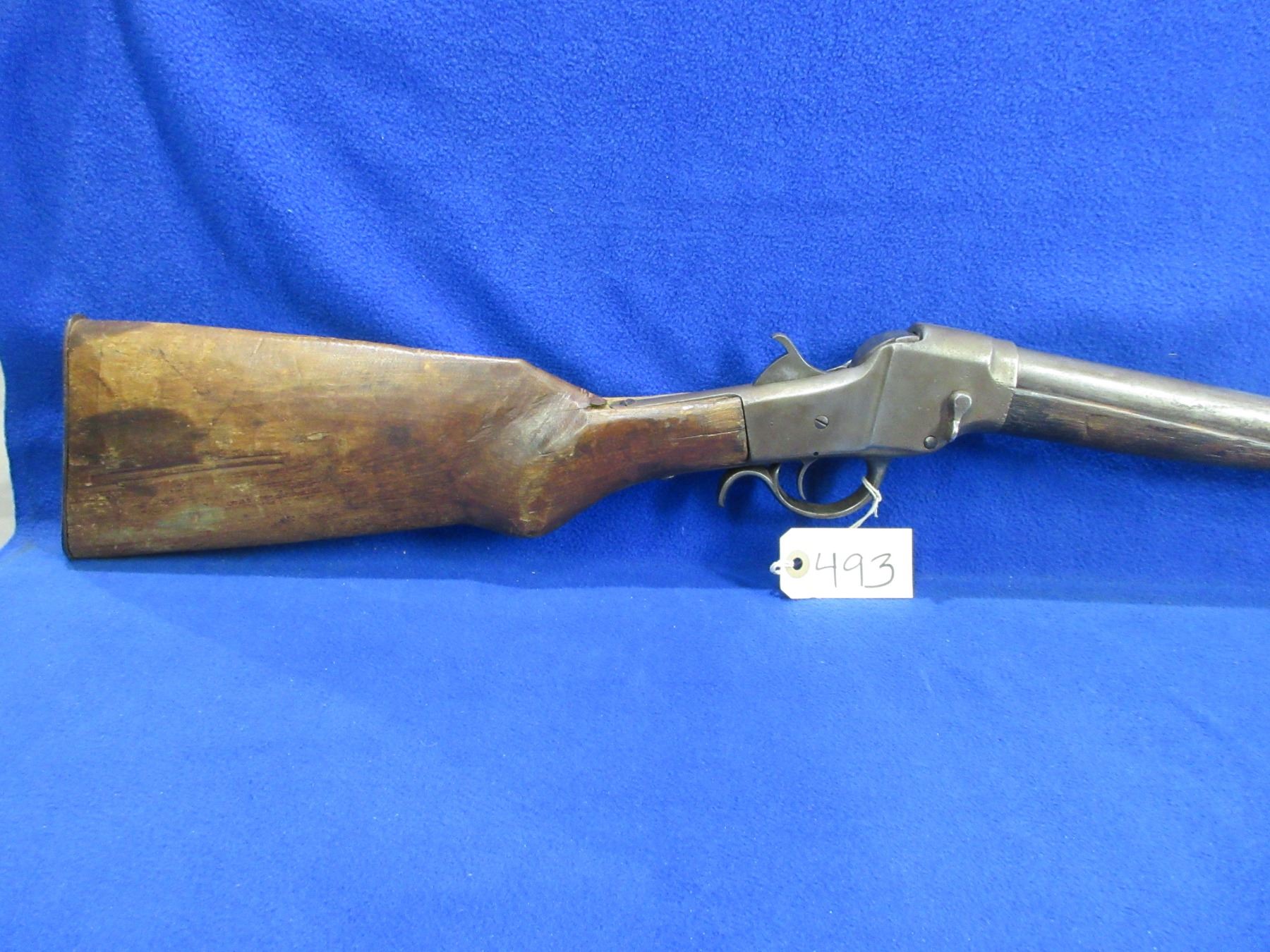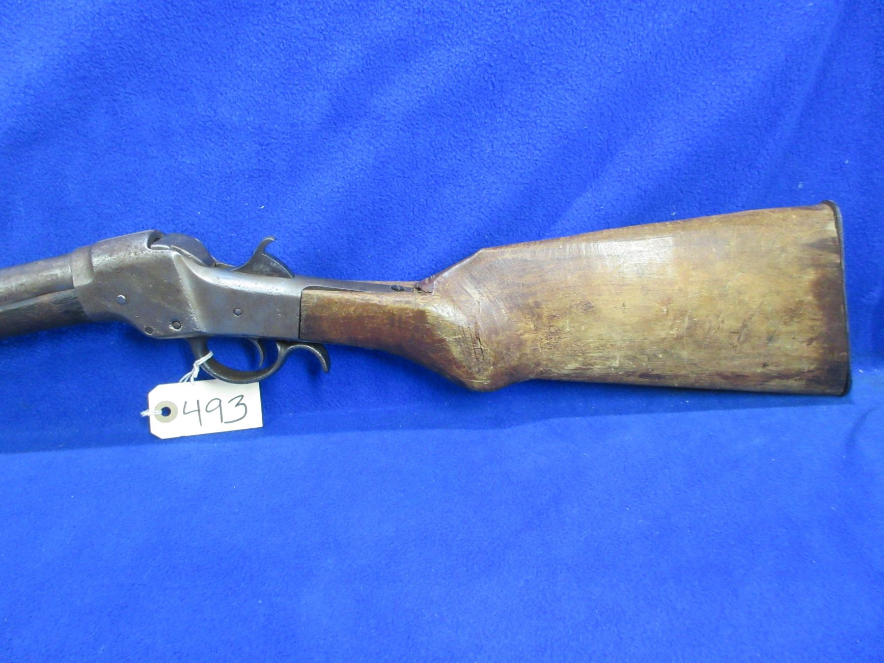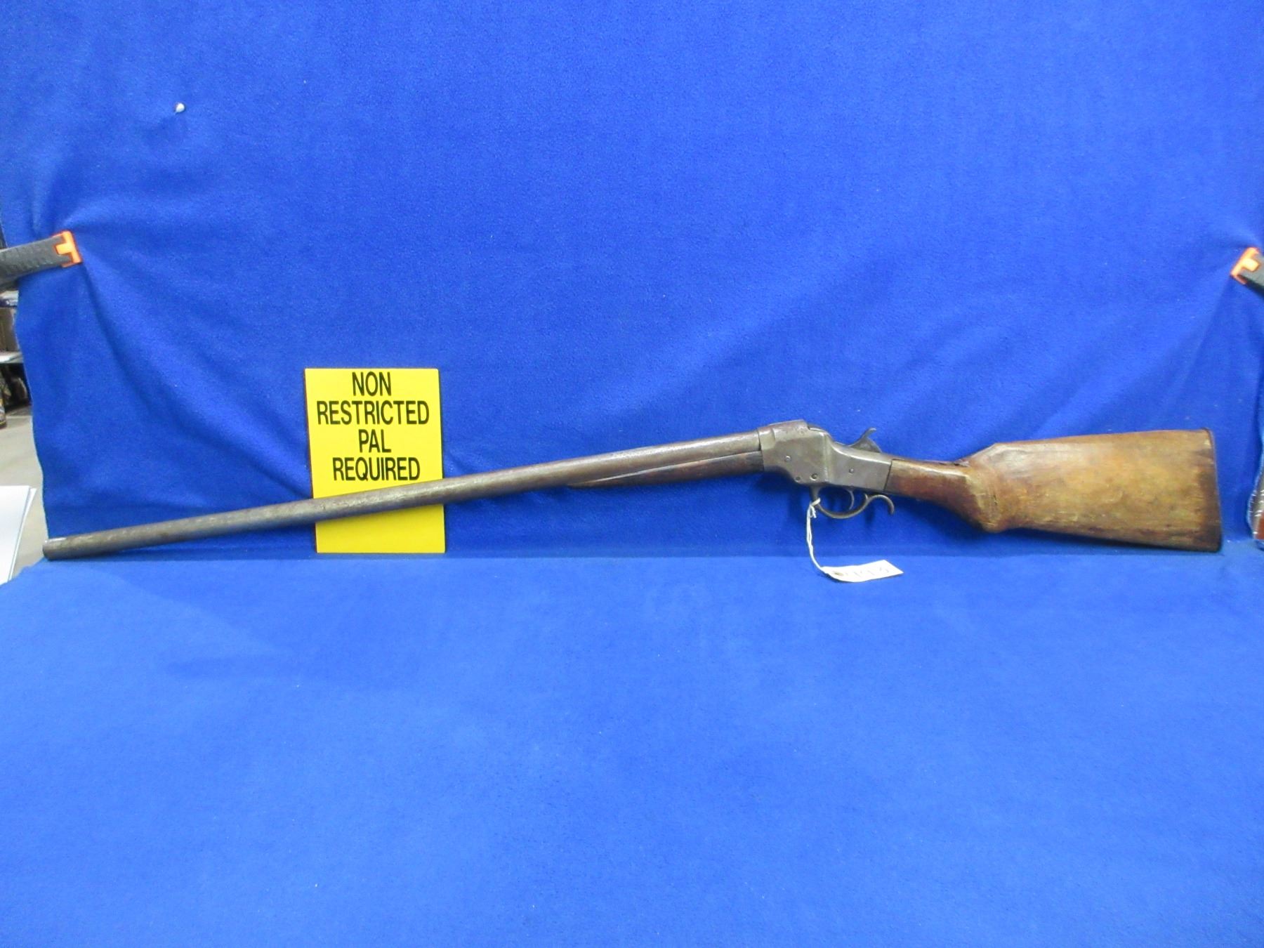 Non-Restricted - Hopkins & Allen 1885 in 12 Ga 3" - This single shot under lever falling block rifle appears to be in working order but would not recommend firing before checking with a gunsmith. Barrel is 30", bore is poor to fair with pitting, bluing is gone and has rust and pitting, has bead front sight, stock has a crack on right behind the action and appears handmade, metal butt plate. Ser # 1537