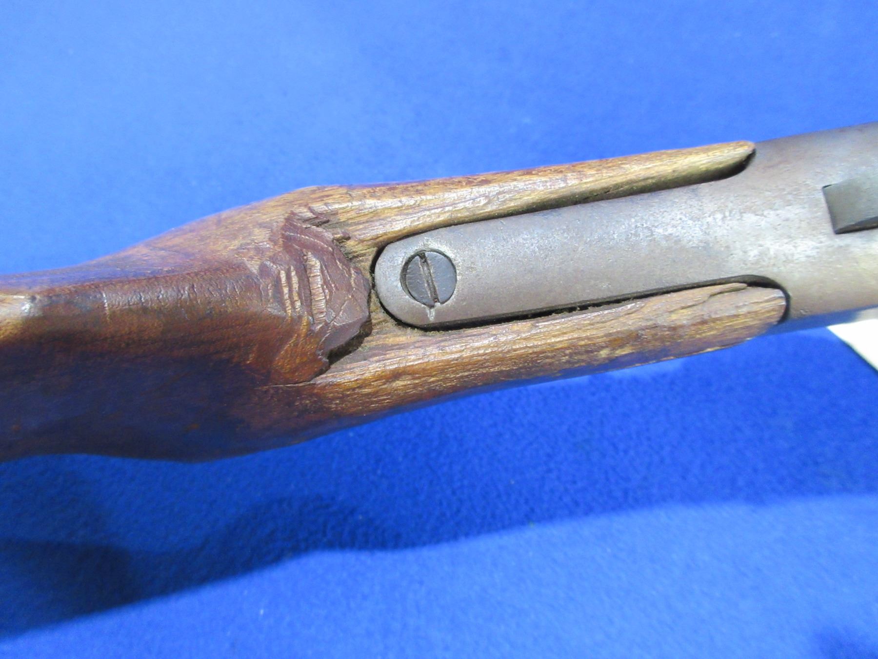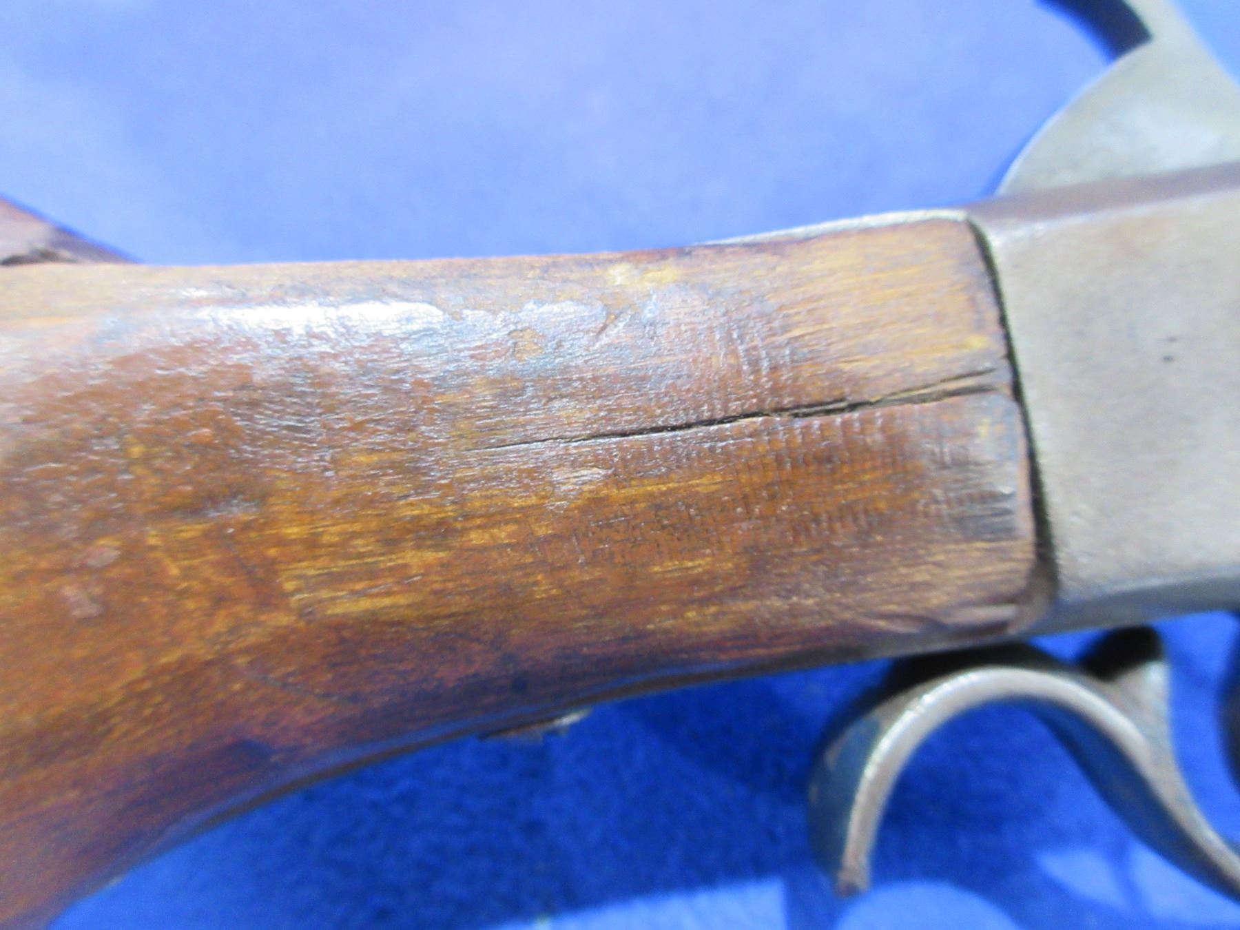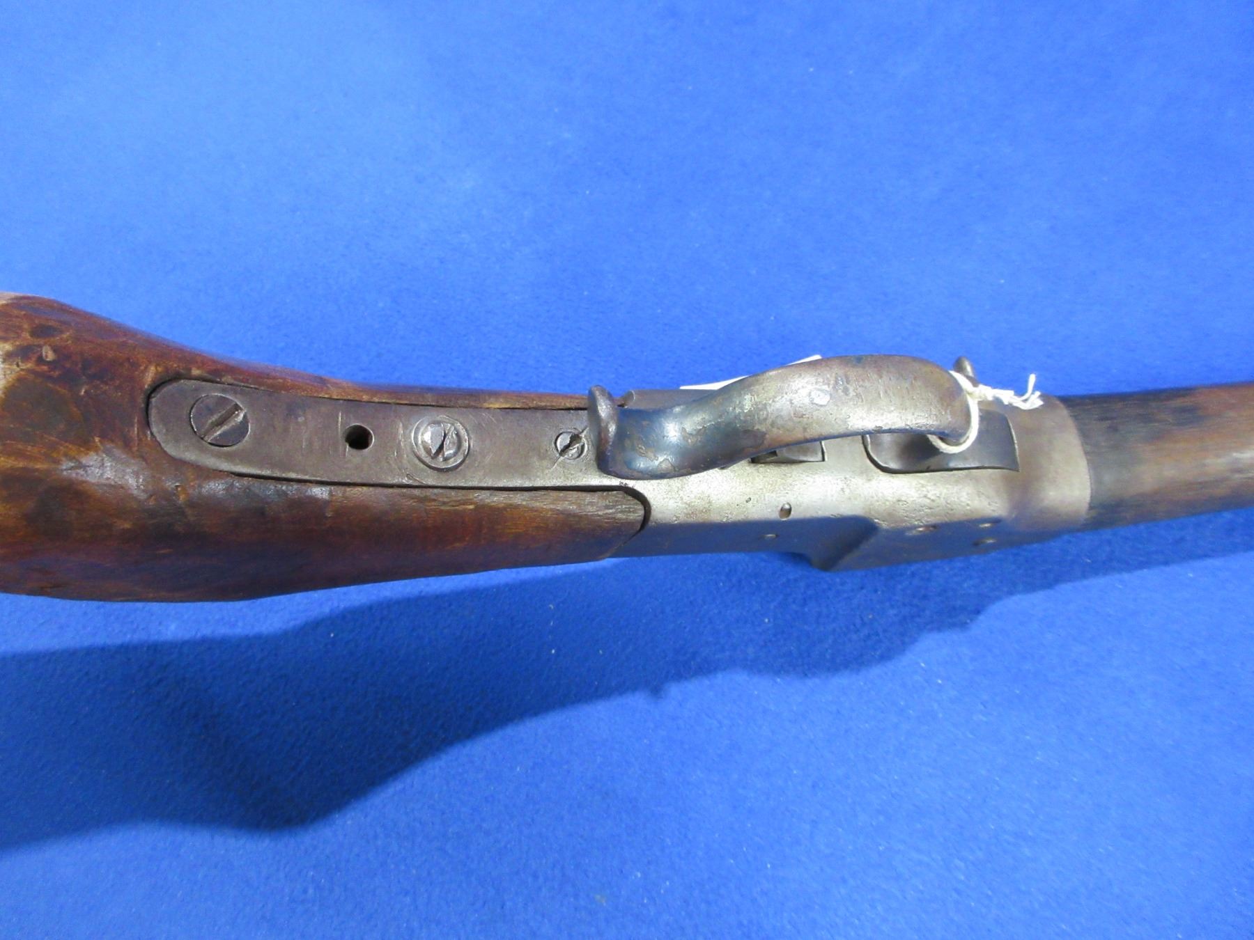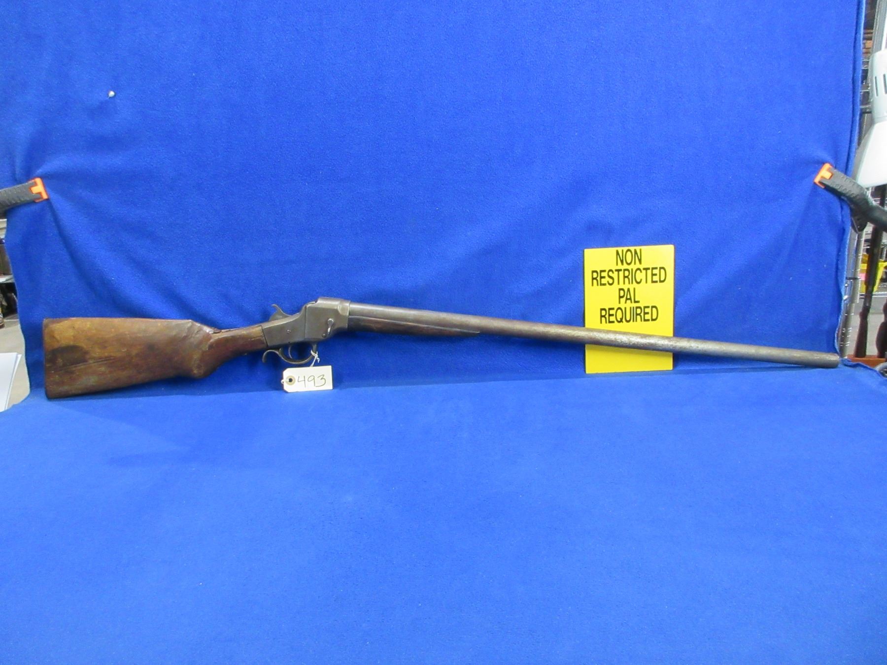 Non-Restricted - Hopkins & Allen 1885 in 12 Ga 3" - This single shot under lever falling block rifle appears to be in working order but would not recommend firing before checking with a gunsmith. Barrel is 30", bore is poor to fair with pitting, bluing is gone and has rust and pitting, has bead front sight, stock has a crack on right behind the action and appears handmade, metal butt plate. Ser # 1537