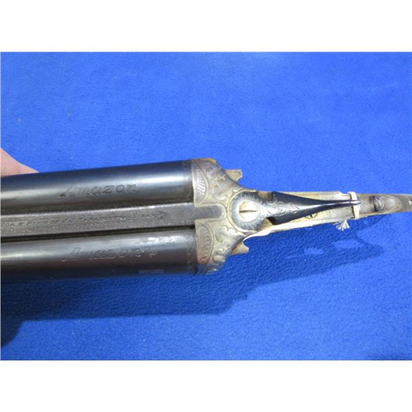 Non-Restricted - Barreled Action - Sarasqueta Amazon in 12 Ga 2 3/4"- This is a barrel and action with trigger assembly and forearm, action does cock and fire. Barrel is 27 5/8", bores are good but left barrel has a dent approx 8" from muzzle, bluing is good with some wear spots, has front bead sight, forearm is good for age with usage marks, comes with front swivel. Ser #109347