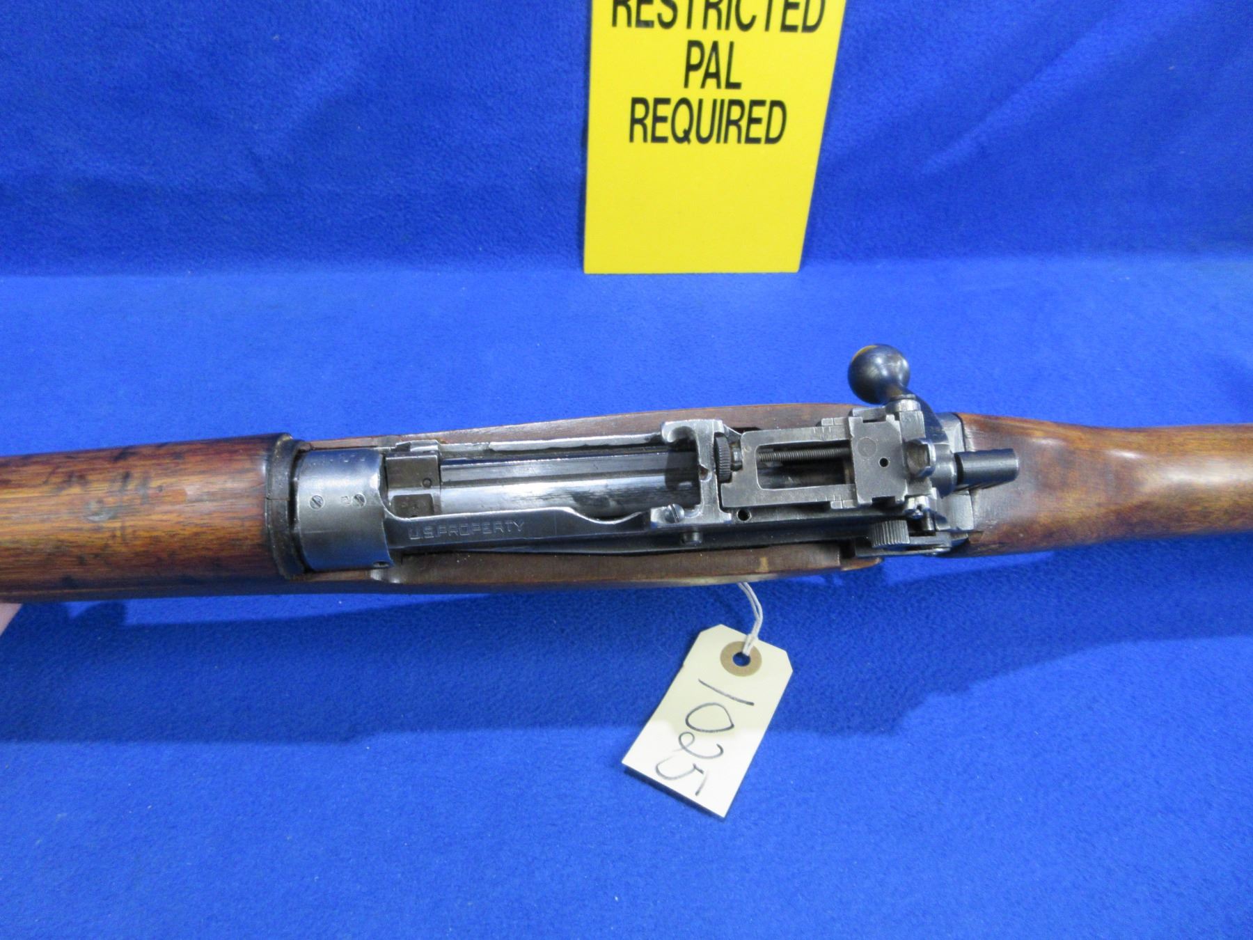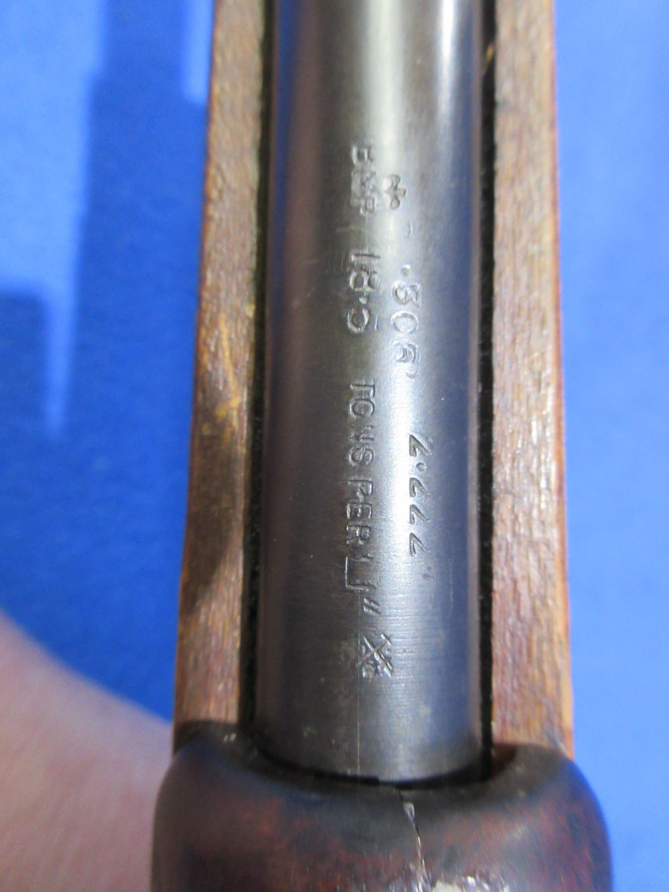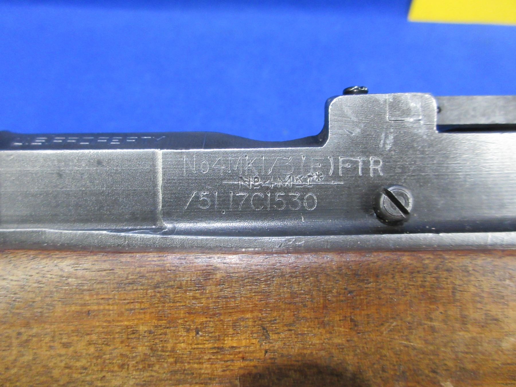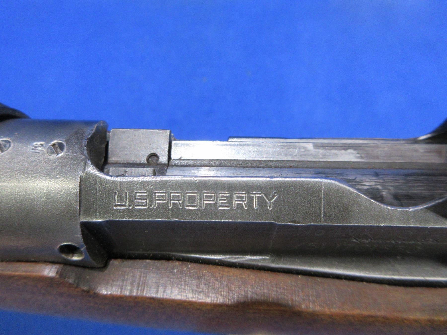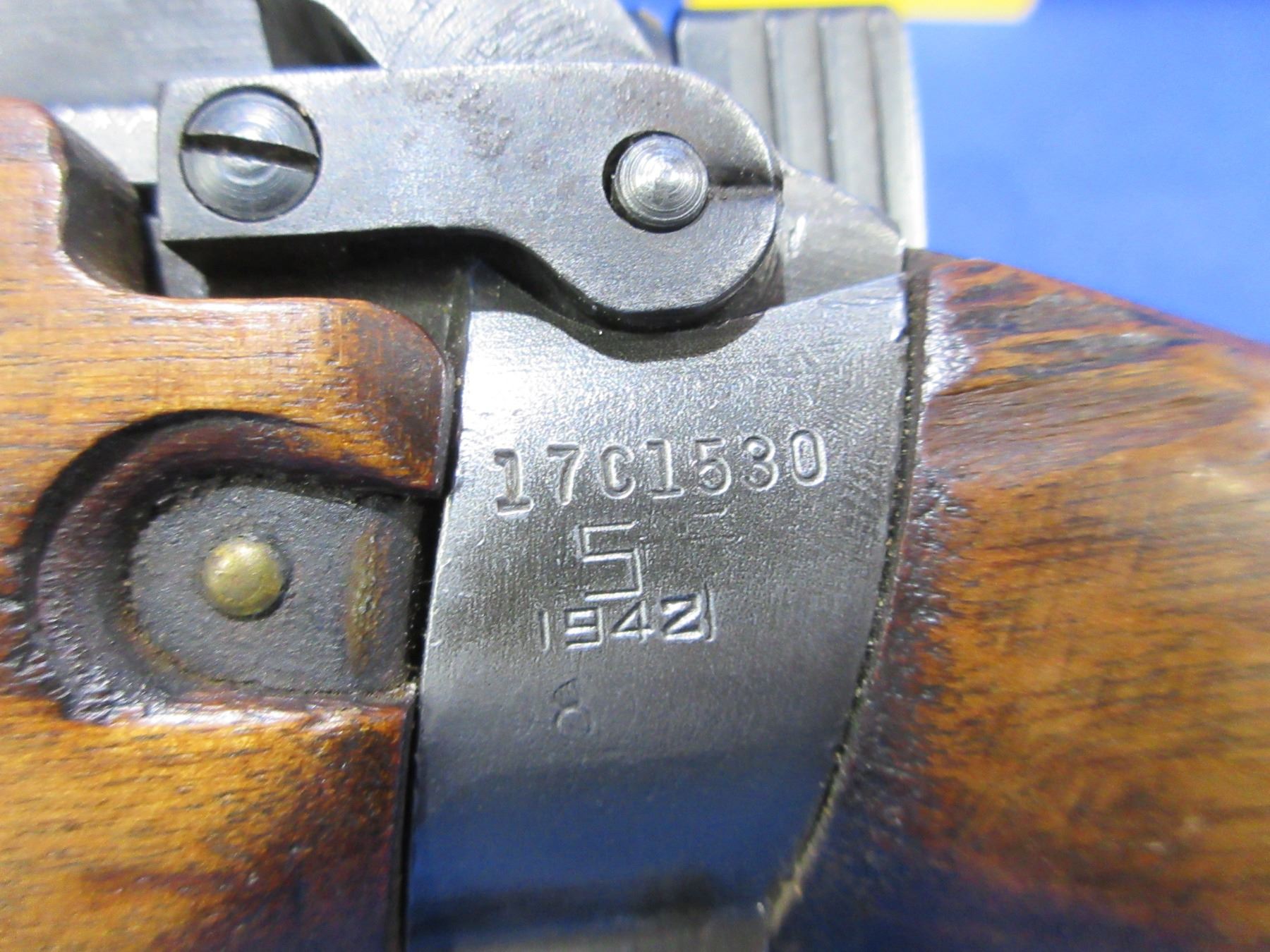 Non-Restricted - Lee Enfield No. 5 Mark I Jungle Carbine in 303 British - Action marked "US Property, No 4 Mk 1/3 (F) FTR, 1942"- This bolt action rifle with removable magazine appears to be in good to very good working order. Barrel is 19", rifling is good but dark - needs wet cleaning, bluing is good on barrel but action is turning grey, has both sights, full wood stock is good for age with usage marks, handguard is missing rear band and has a crack repair at the top rear, butt plate good, comes with swivels. Ser #17C1530