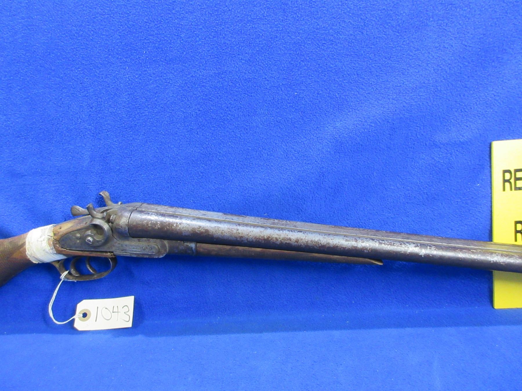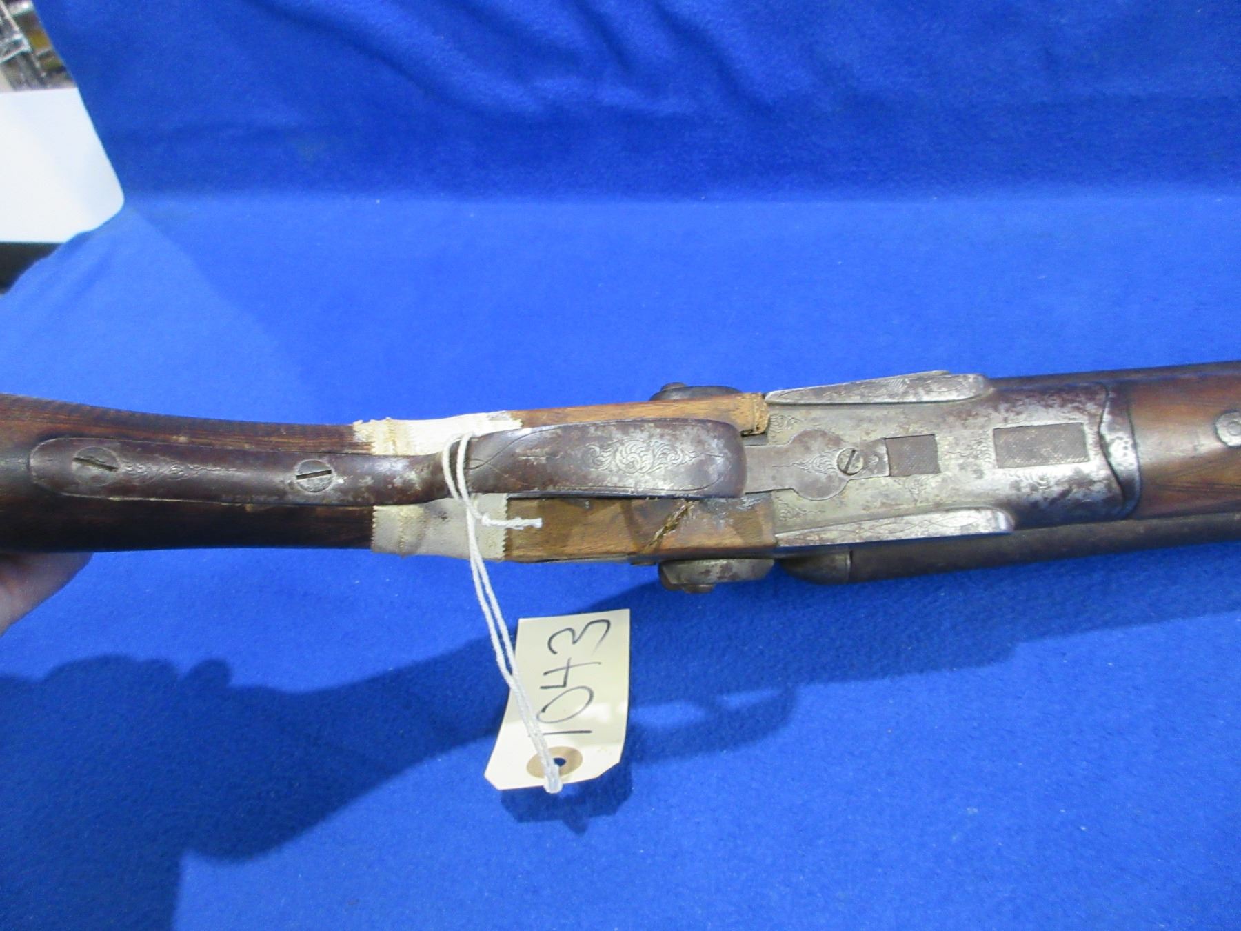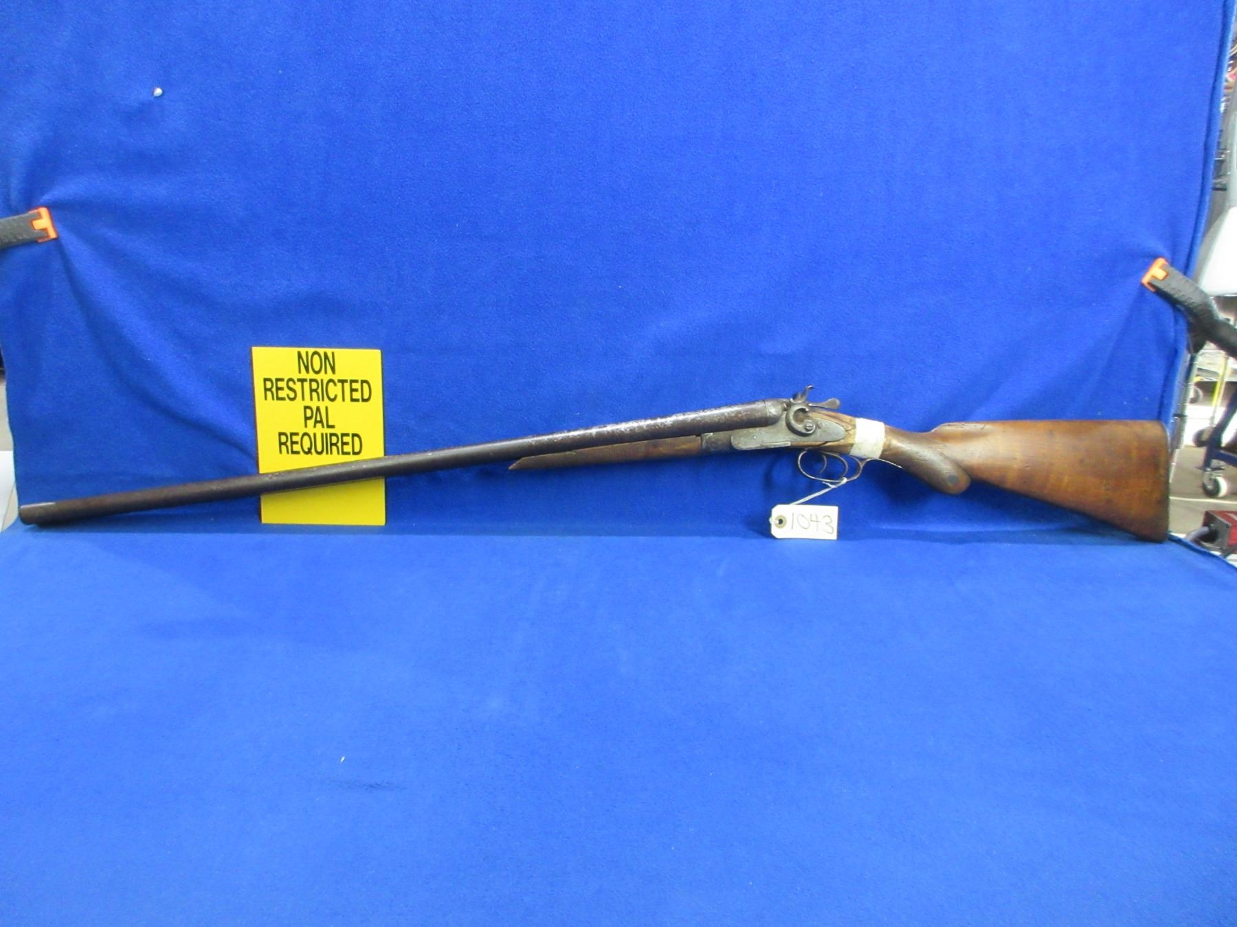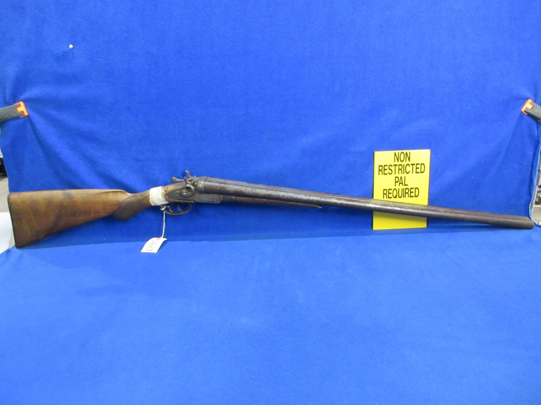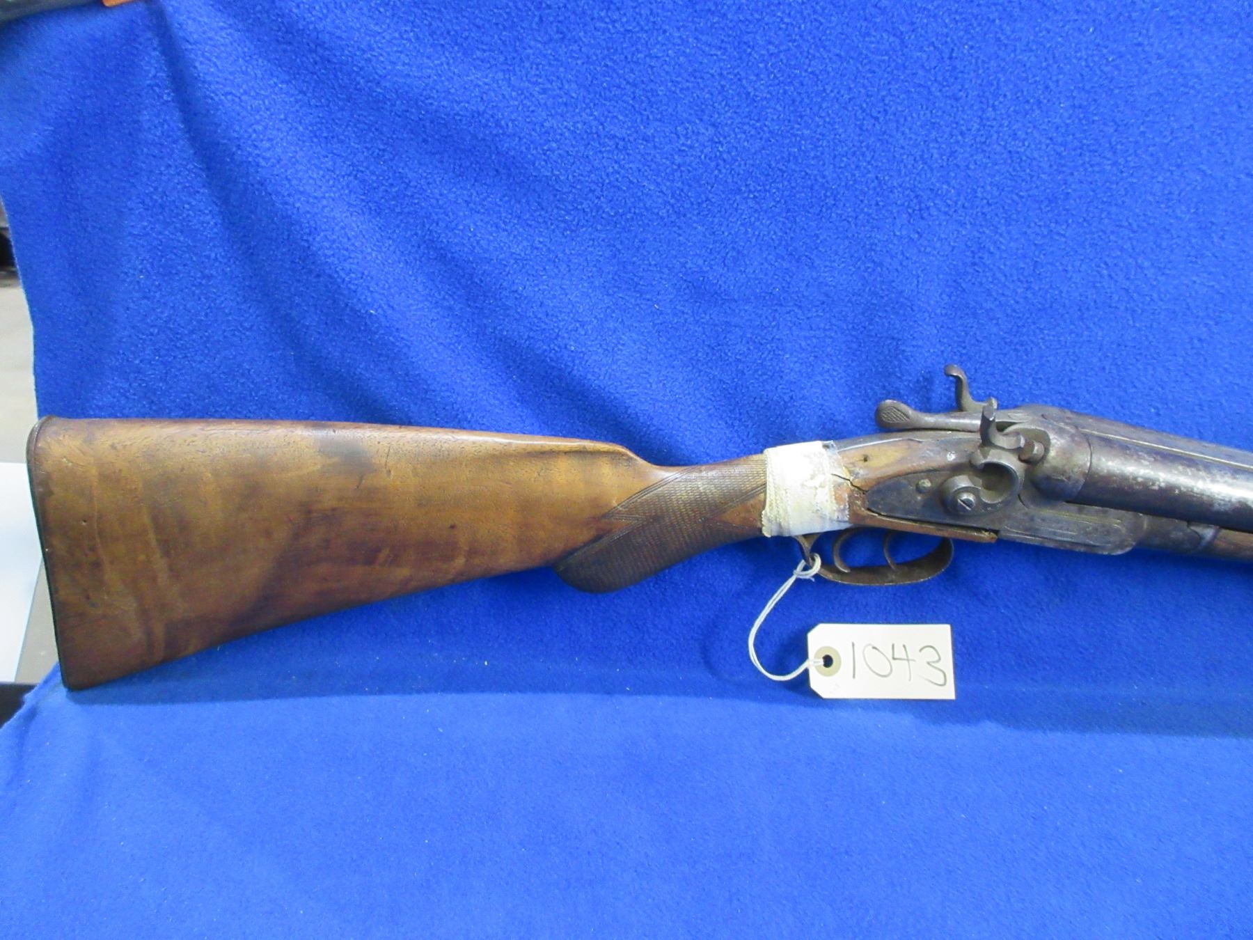 Non-Restricted - J. Manton & Co. in 12 Ga. 2 1/2" - This tip up SXS hammer shotgun is in non working order as stock is broken and action has play. Barrels are 30", bores are fair, bluing is rusty and pitted, has bead front sight, curved stock is broken at the wrist area, forearm is chipped in three places but no cracks, metal butt plate. Ser # 4868