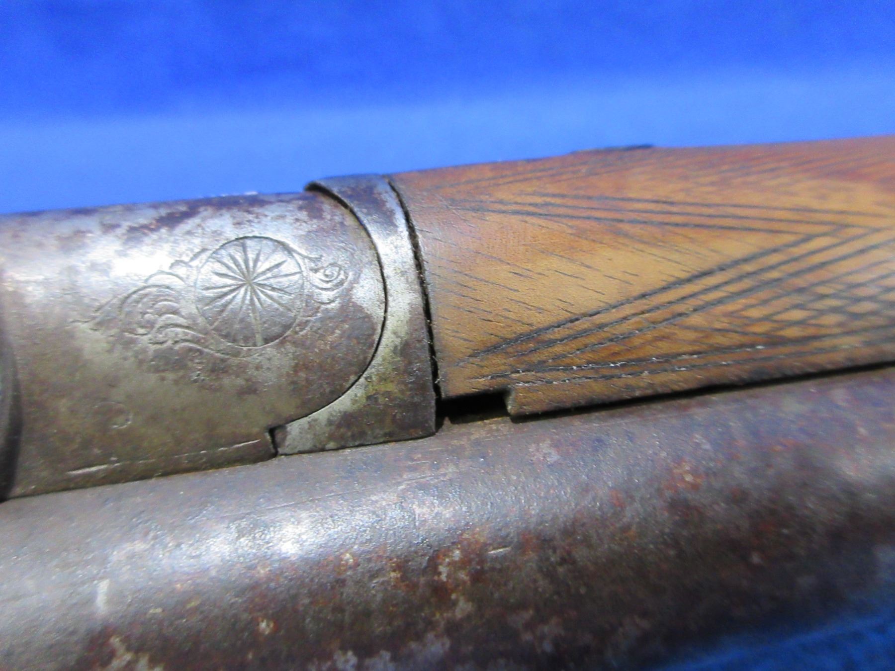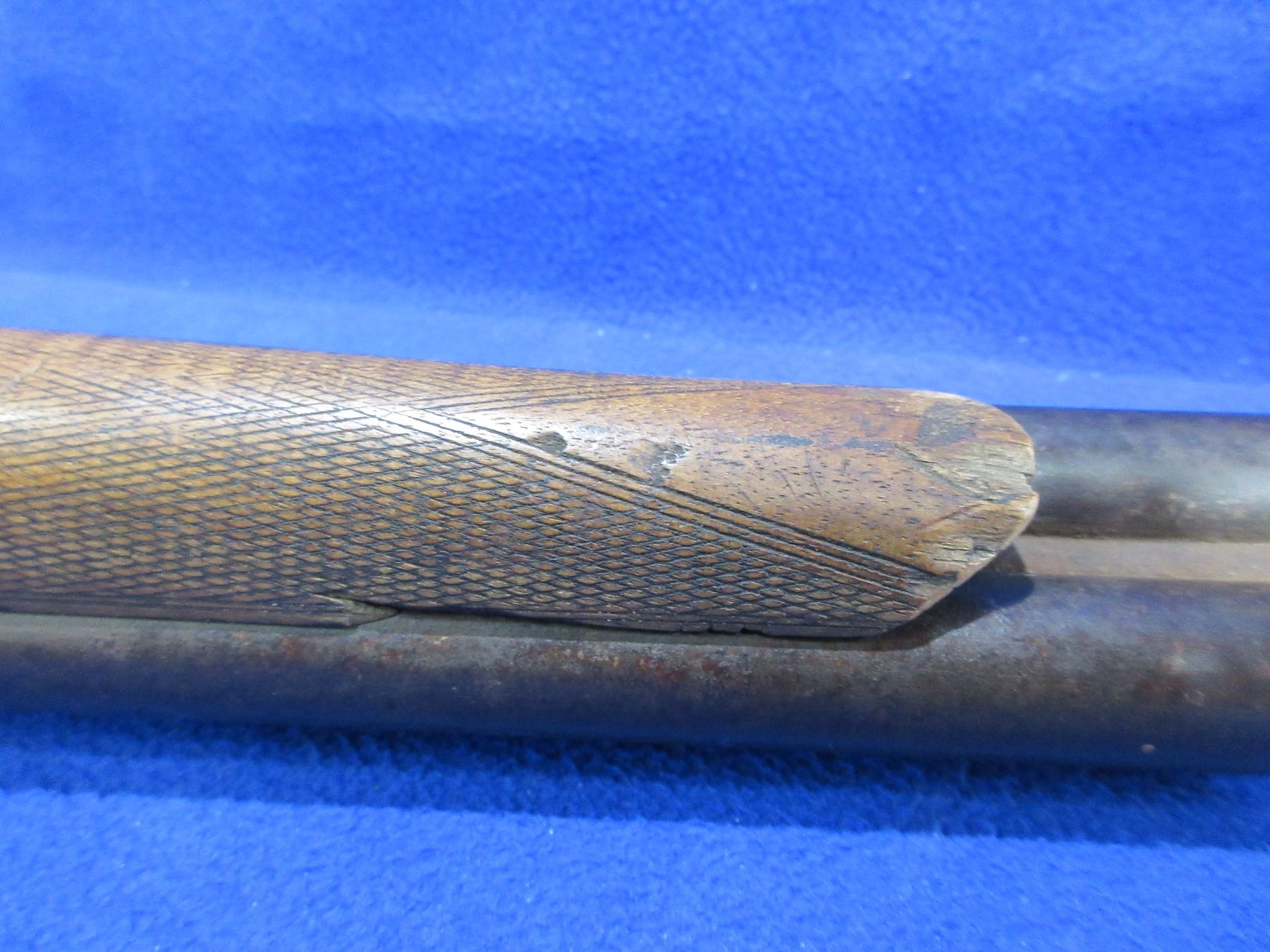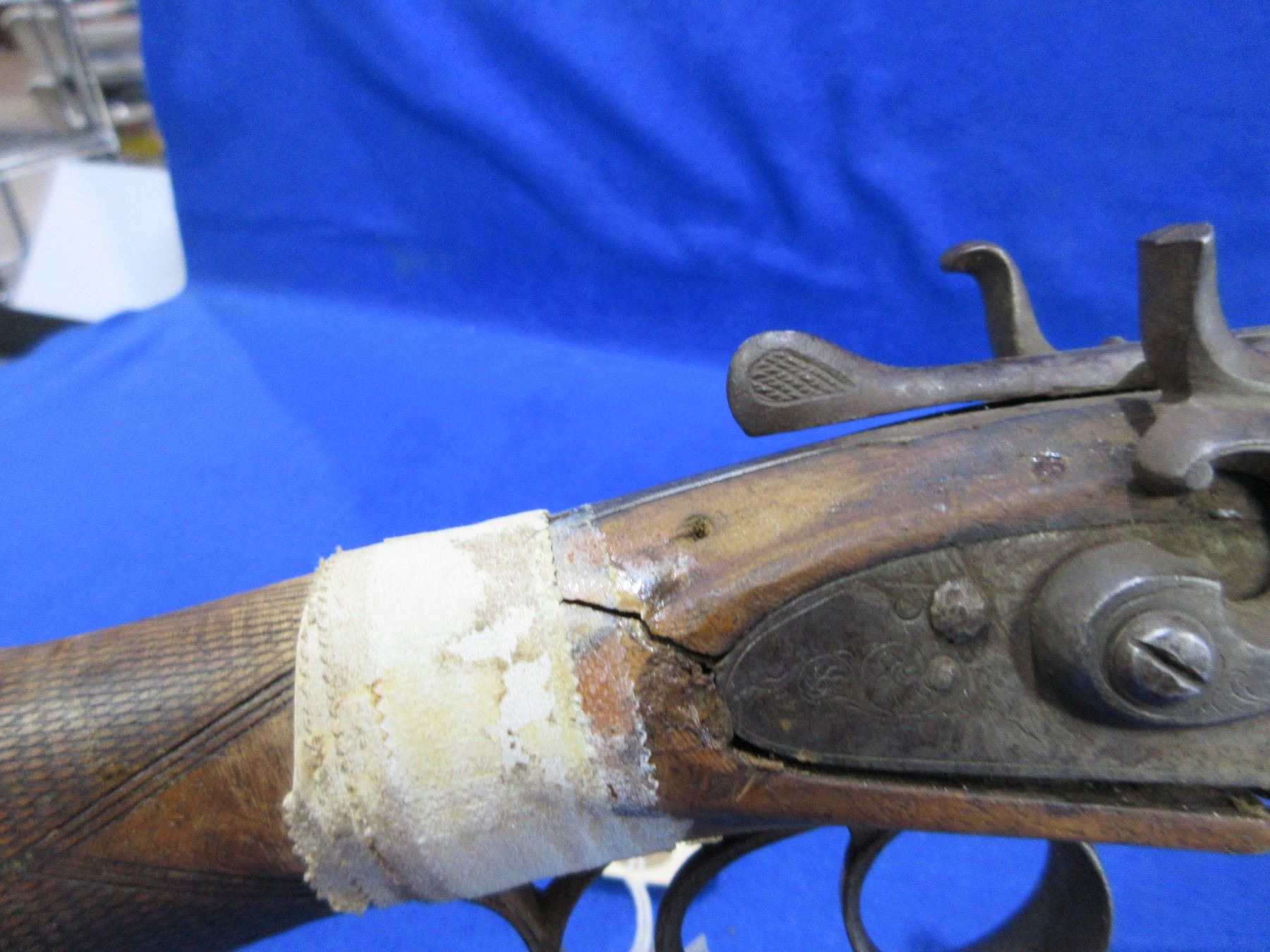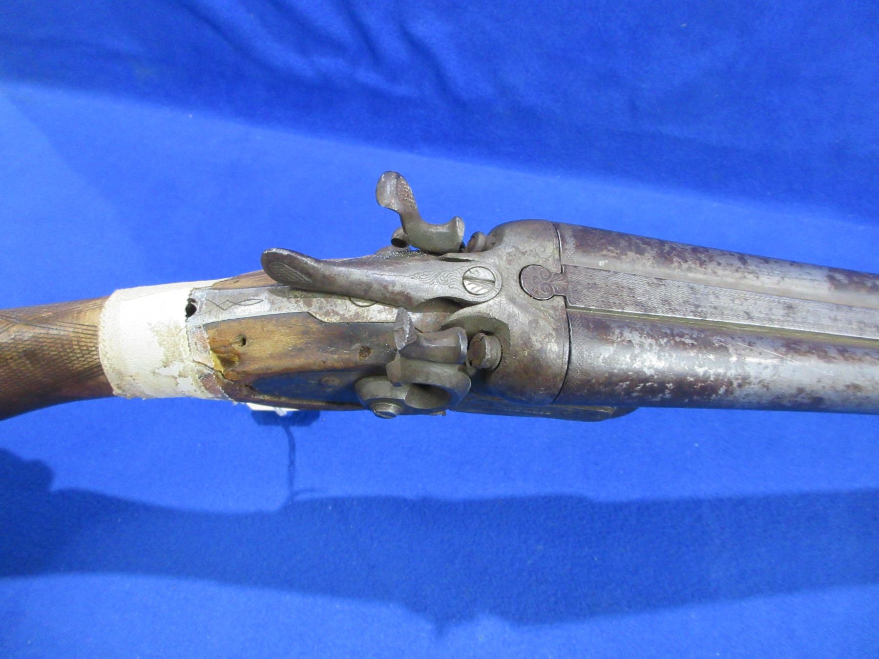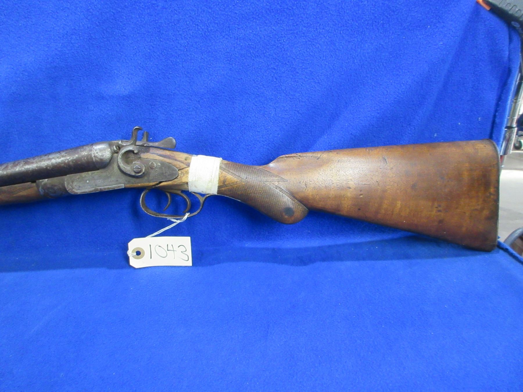Non-Restricted - J. Manton & Co. in 12 Ga. 2 1/2" - This tip up SXS hammer shotgun is in non working order as stock is broken and action has play. Barrels are 30", bores are fair, bluing is rusty and pitted, has bead front sight, curved stock is broken at the wrist area, forearm is chipped in three places but no cracks, metal butt plate. Ser # 4868