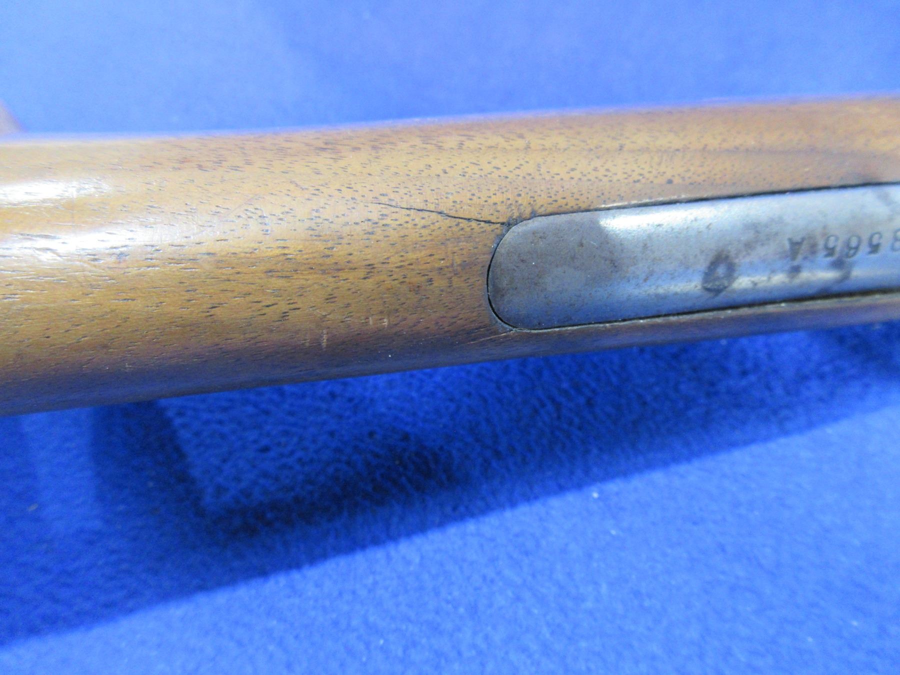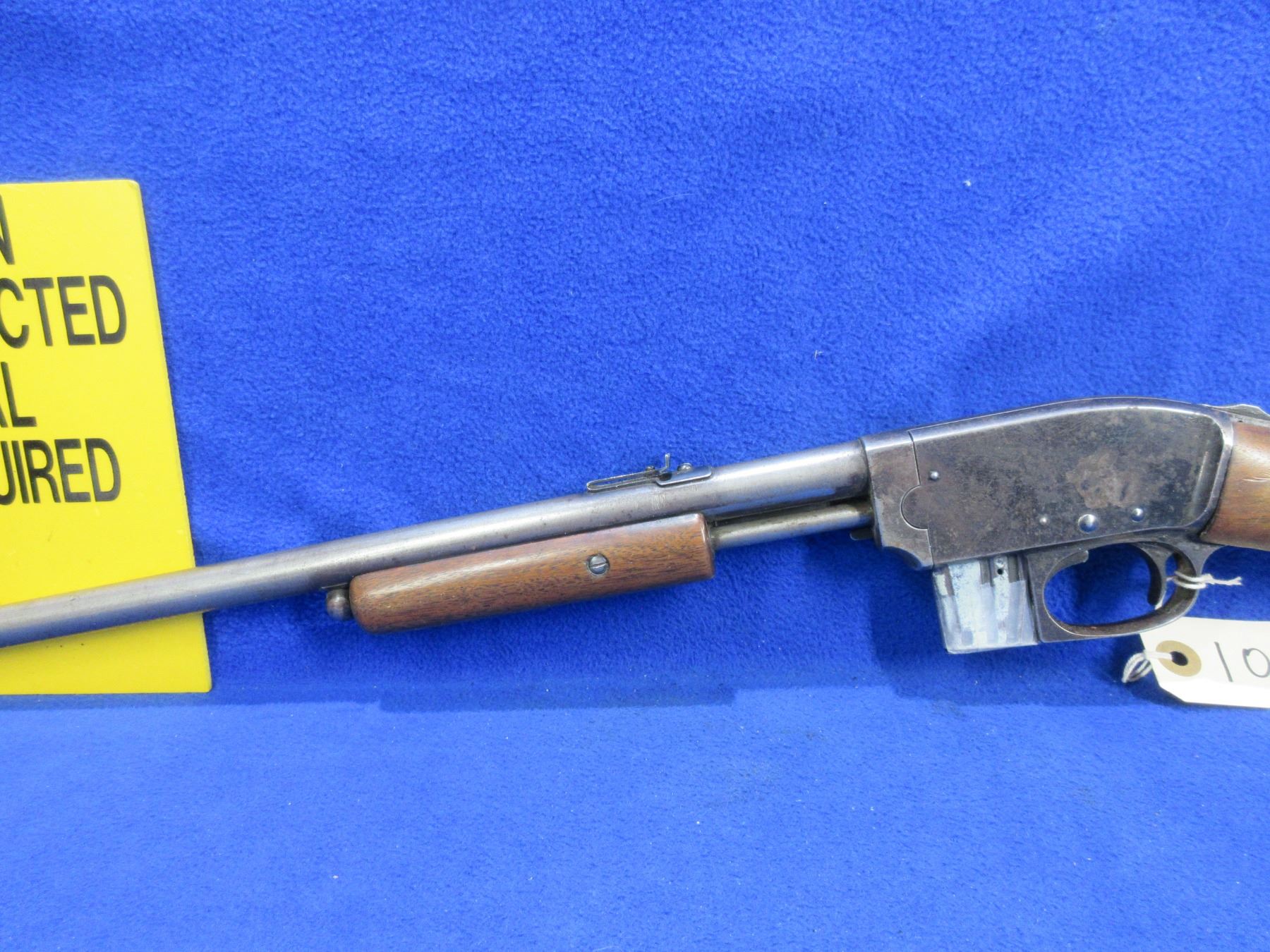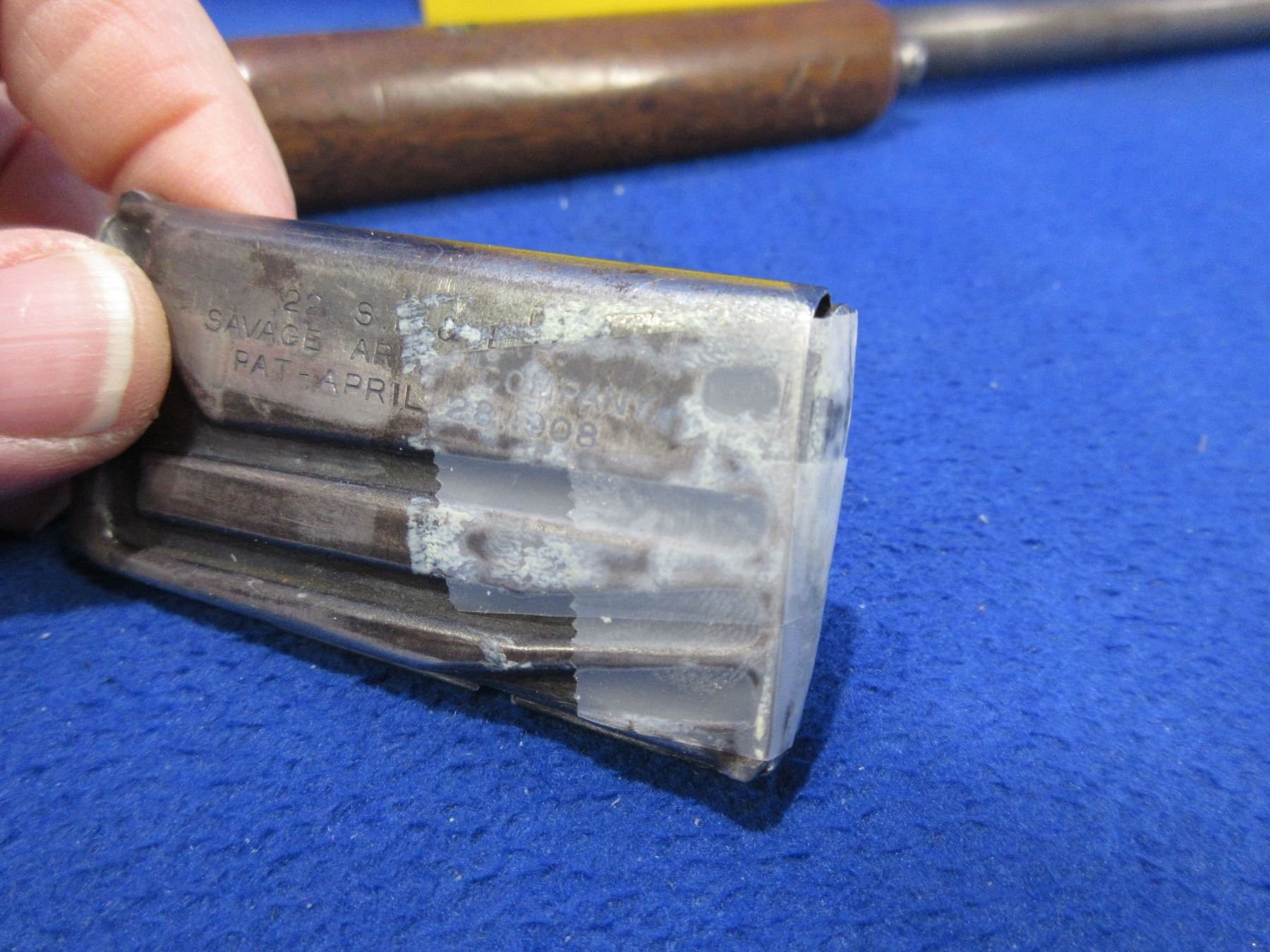 Non-Restricted - Savage 1909 in 22 S/L/LR - This pump action takedown rifle with removable magazine (magazine in need of repair as bottom has been taped on) appears to be in good working order - everything works but is stiff. Barrel is 19 3/4", rifling is good to very good, bluing is mostly gone, has both sights, stock is loose and has a crack behind the top tang and a crack behind the bottom tang, forearm is good to very good, metalbutt plate good. Ser # 108565A