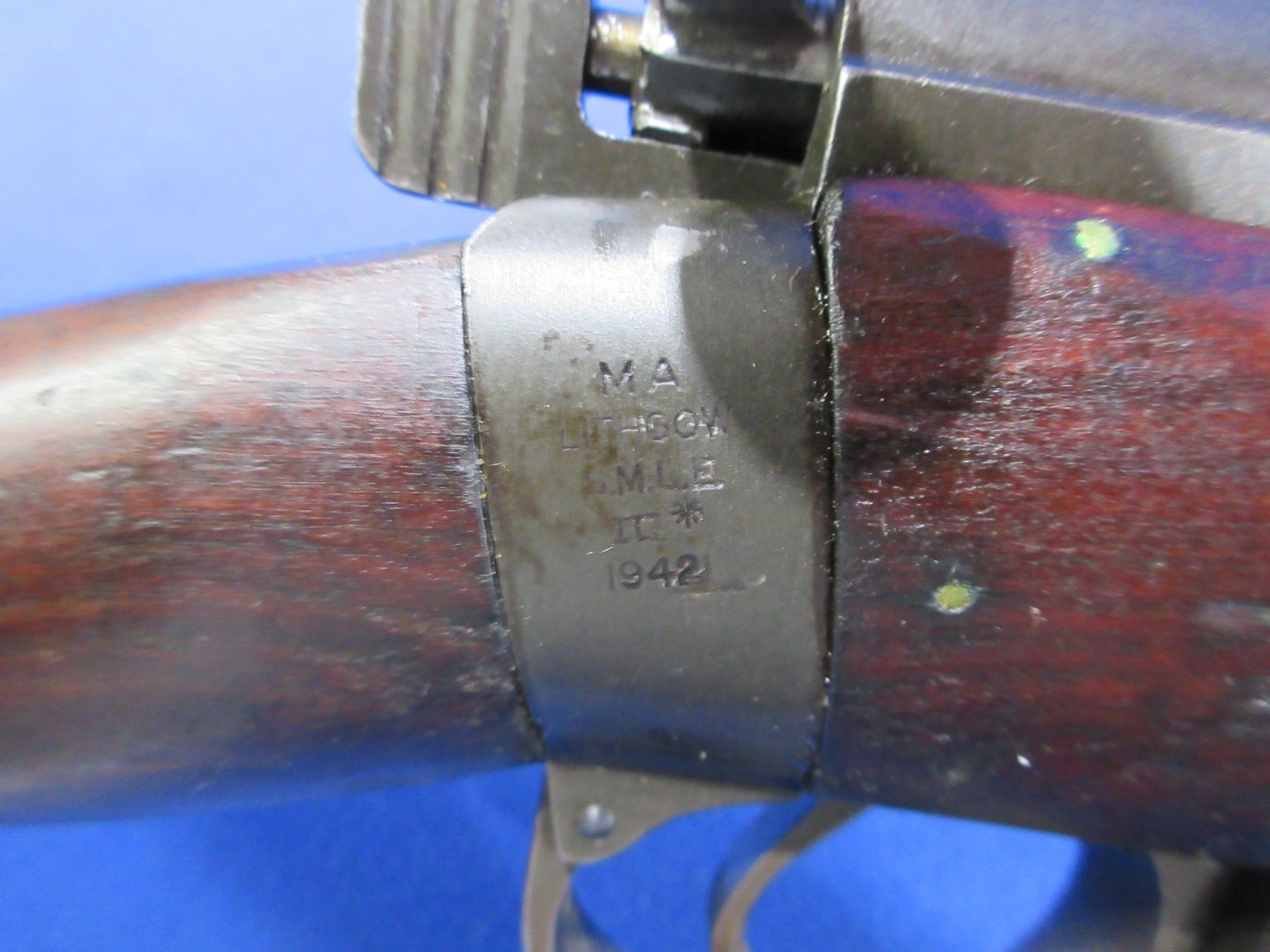 Non-Restricted - Lee Enfield No. 1 Mark III in 303 British - Marked MA Lithgow SMLE III 1942, this bolt action rifle with removable magazine appears to be in good to very good working order. Barrel is 25", rifling is good, bluing is good for age, has both sights, full wood stock is good for age with many usage marks, both handguards have a crack on the back left side, brass butt plate good, comes with swivels. Stock and action are numbers matching. Ser #D80723