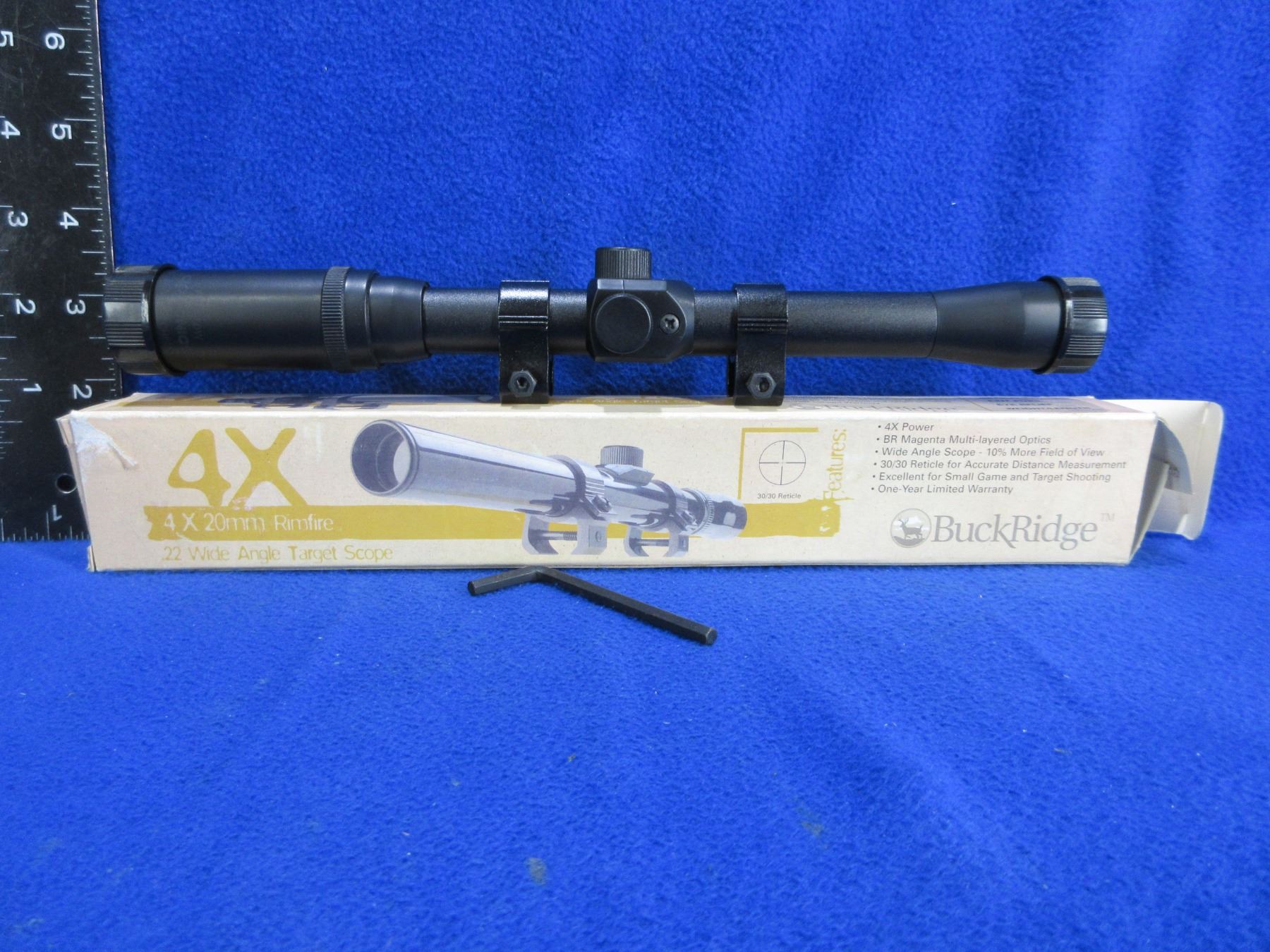 BuckRidge 4x20 Rimfire .22 Wide Angle Target Scope - Appears Clear - Duplex Reticle - Comes with rings and lens covers, appears unused.