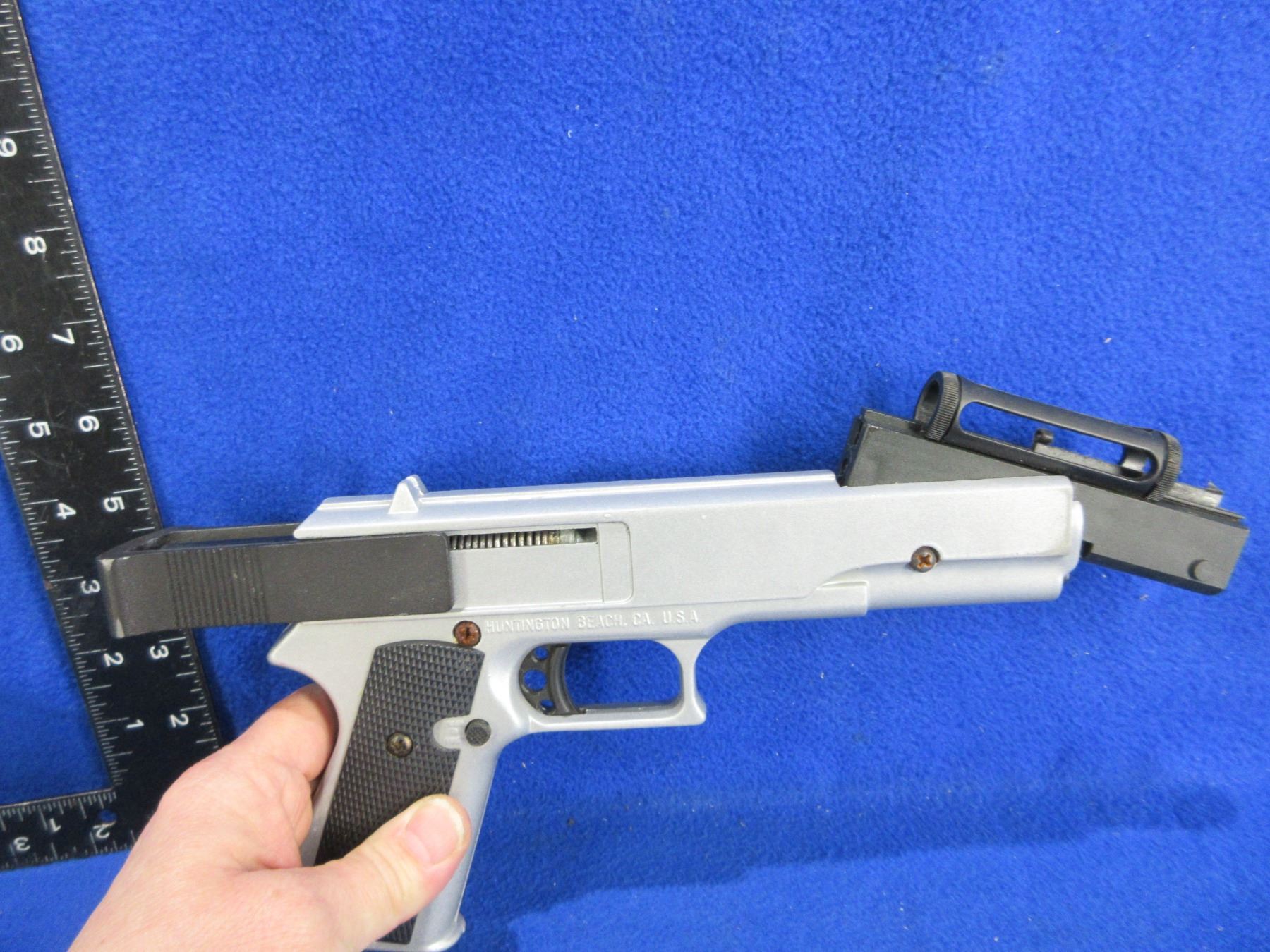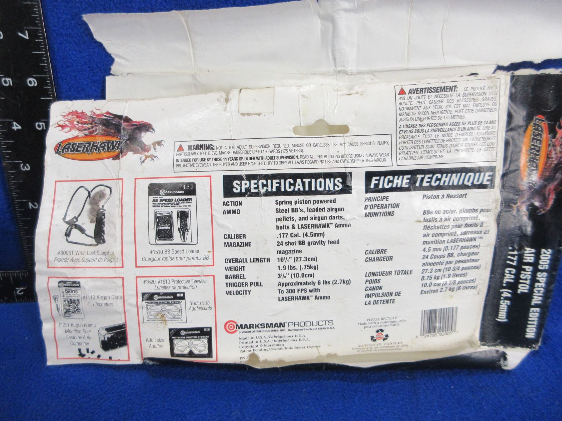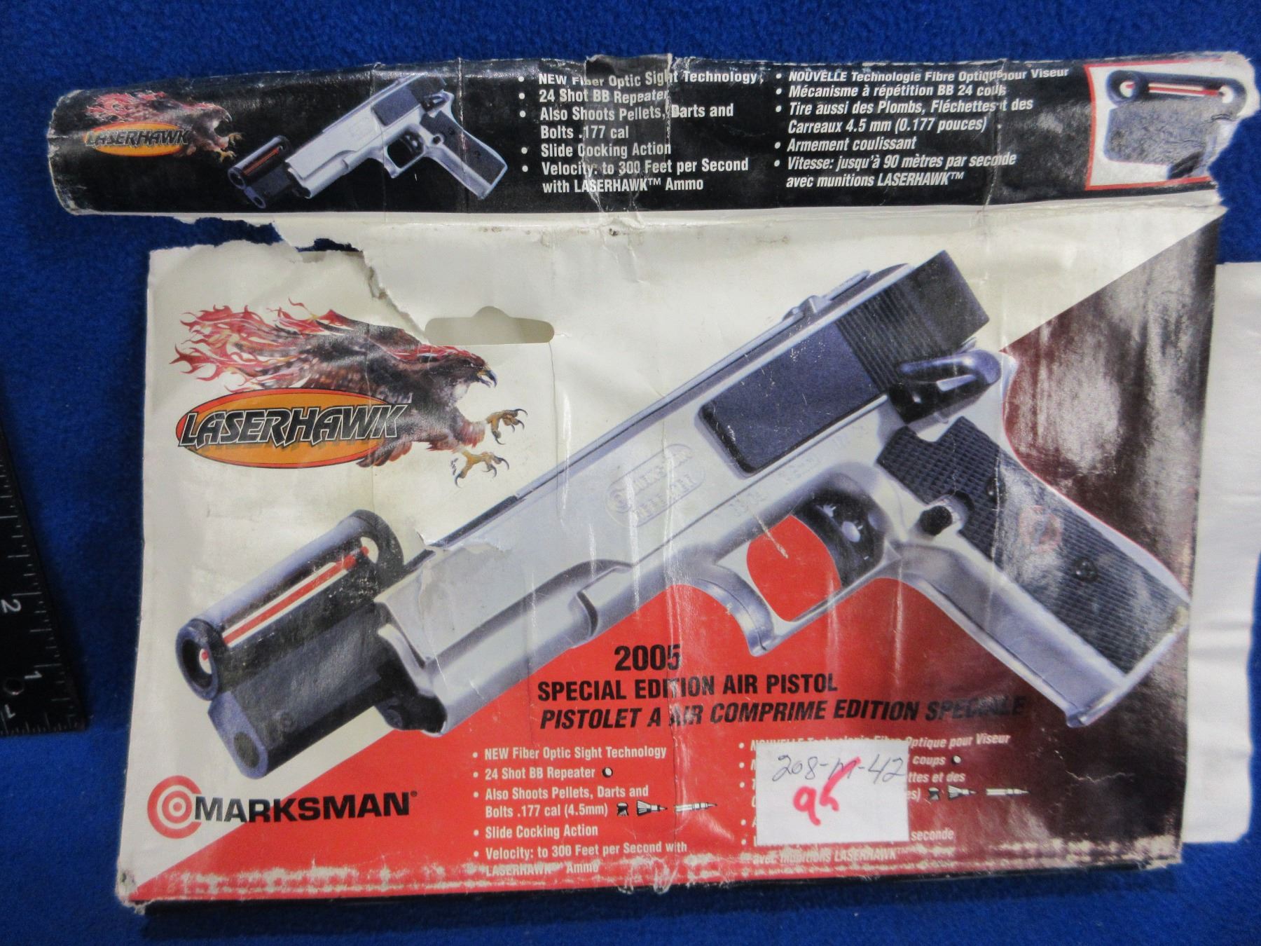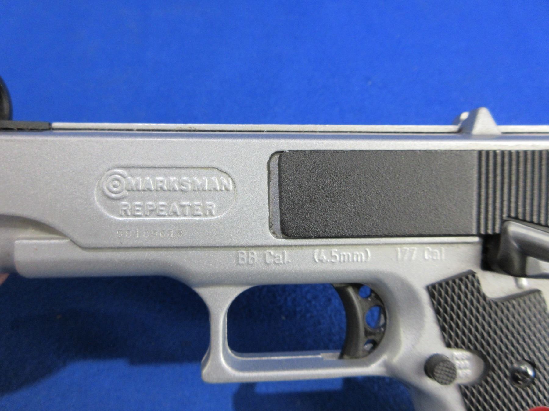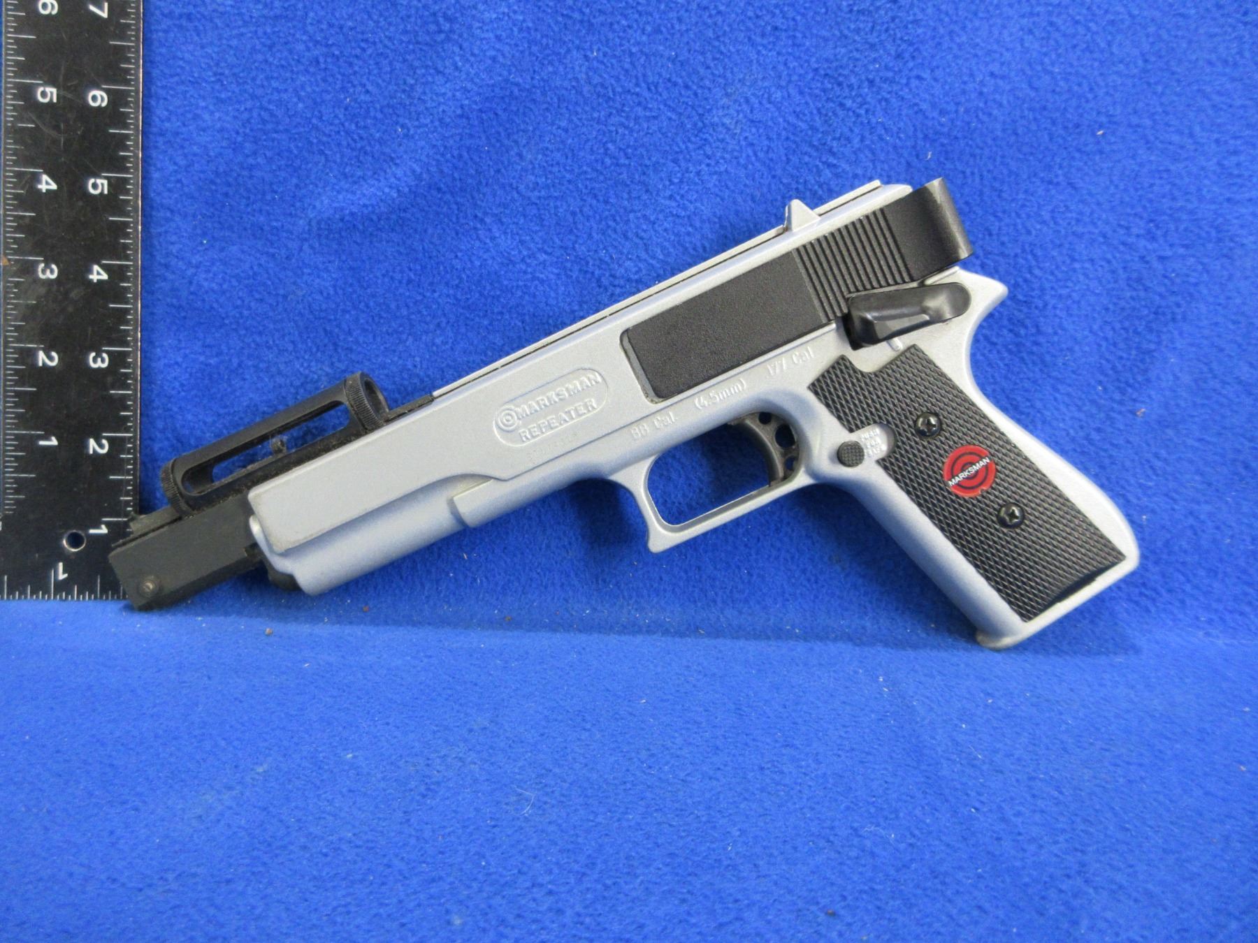 No PAL Required - Crossman Marksman Repeater in 177 Cal. - This slide action repeater air pistol appears to be in working order but safety is not working properly. Fiber optic front sight is broken. Ser # 98189618