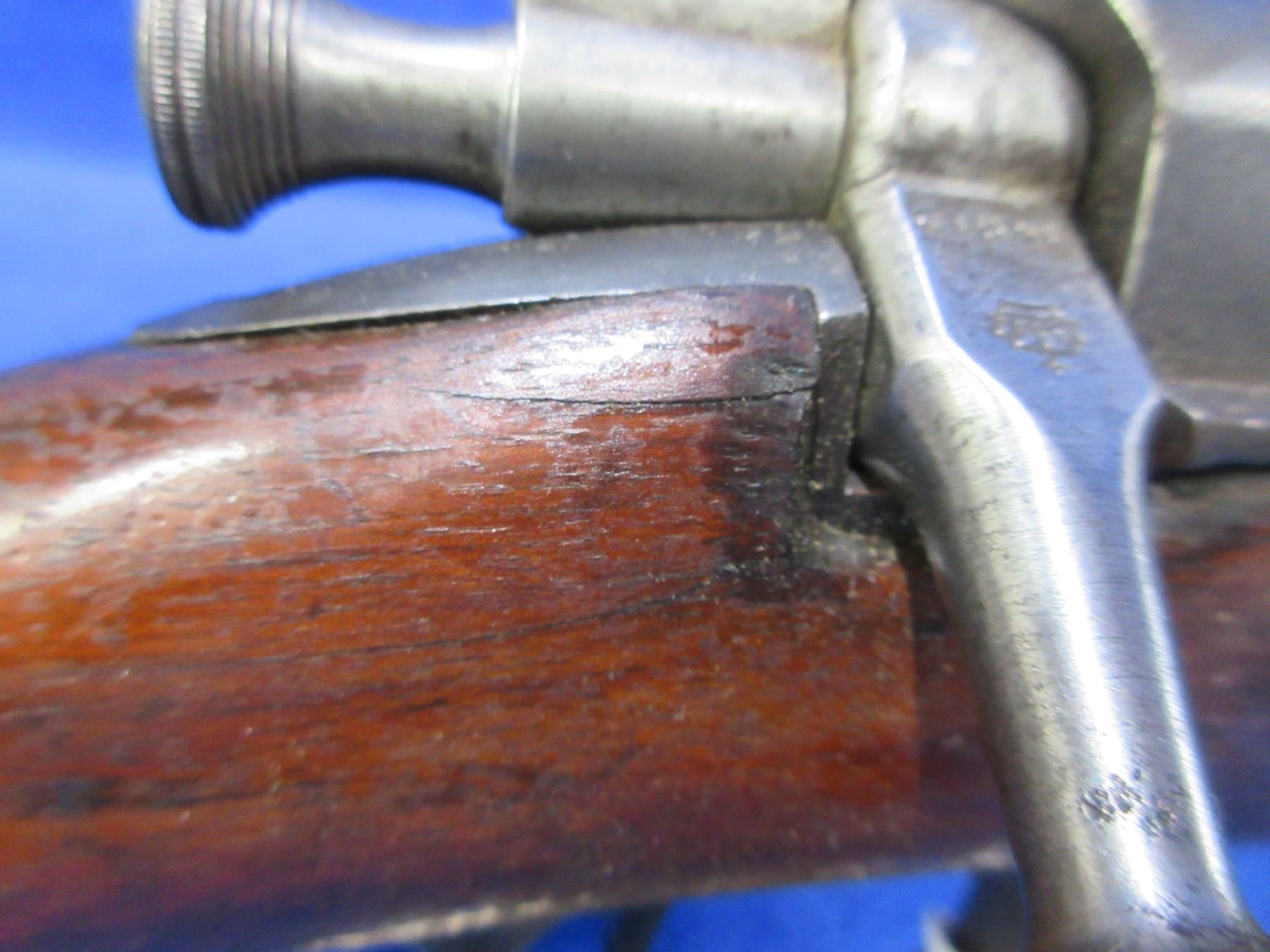 Non-Restricted - Steyr Model 1896 in 30-40 Krag - This bolt action rifle with side load magazine appears to be in good working order. Barrel is 22", rifling is fair to good - may need wet cleaning, bluing is turning grey and has pitting, has both sights, stock has a crack in the toe on both sides and two cracks on right side and one on left side behind action, metal butt plate good, comes with rear swivel stud. Ser #785