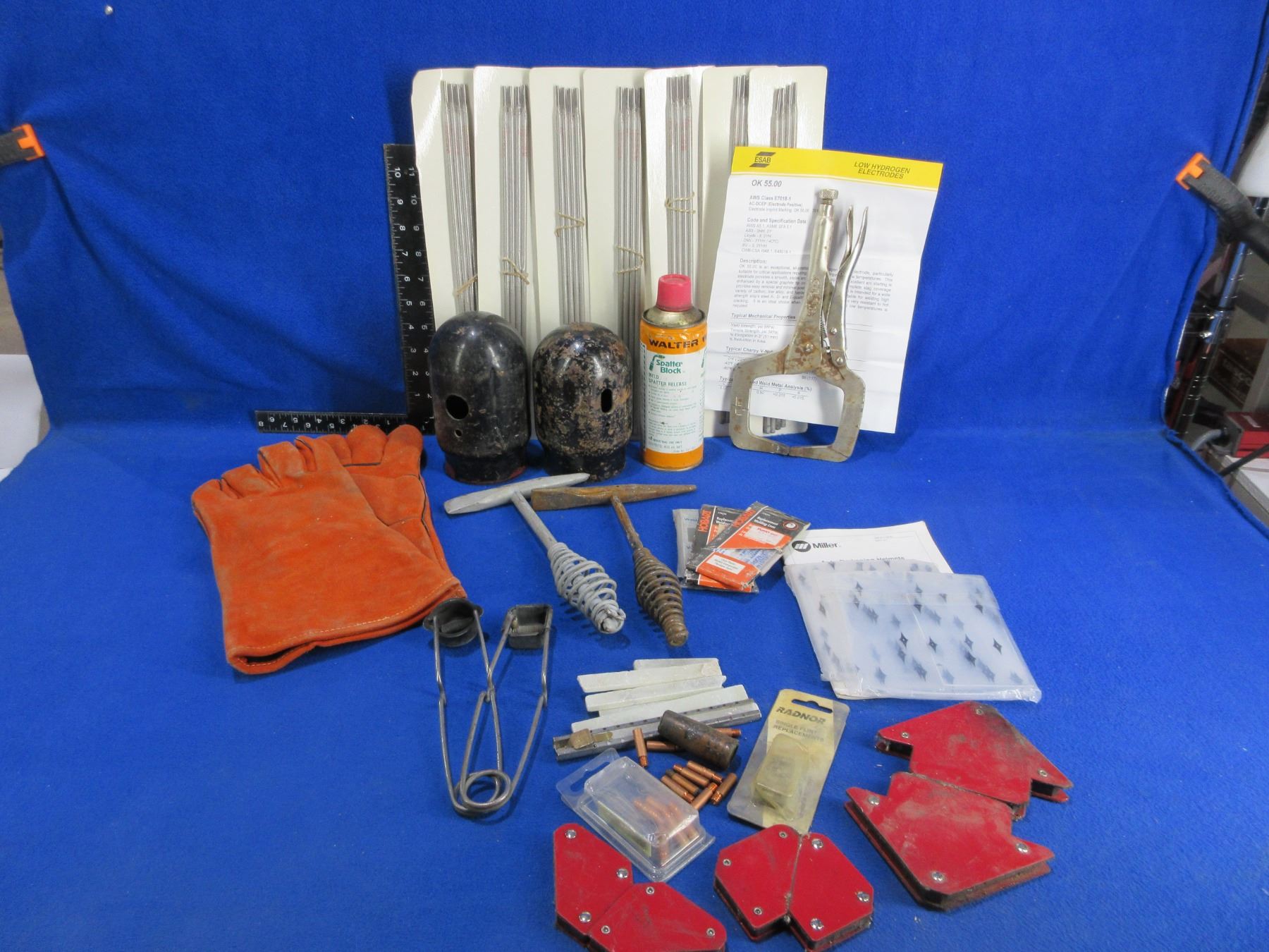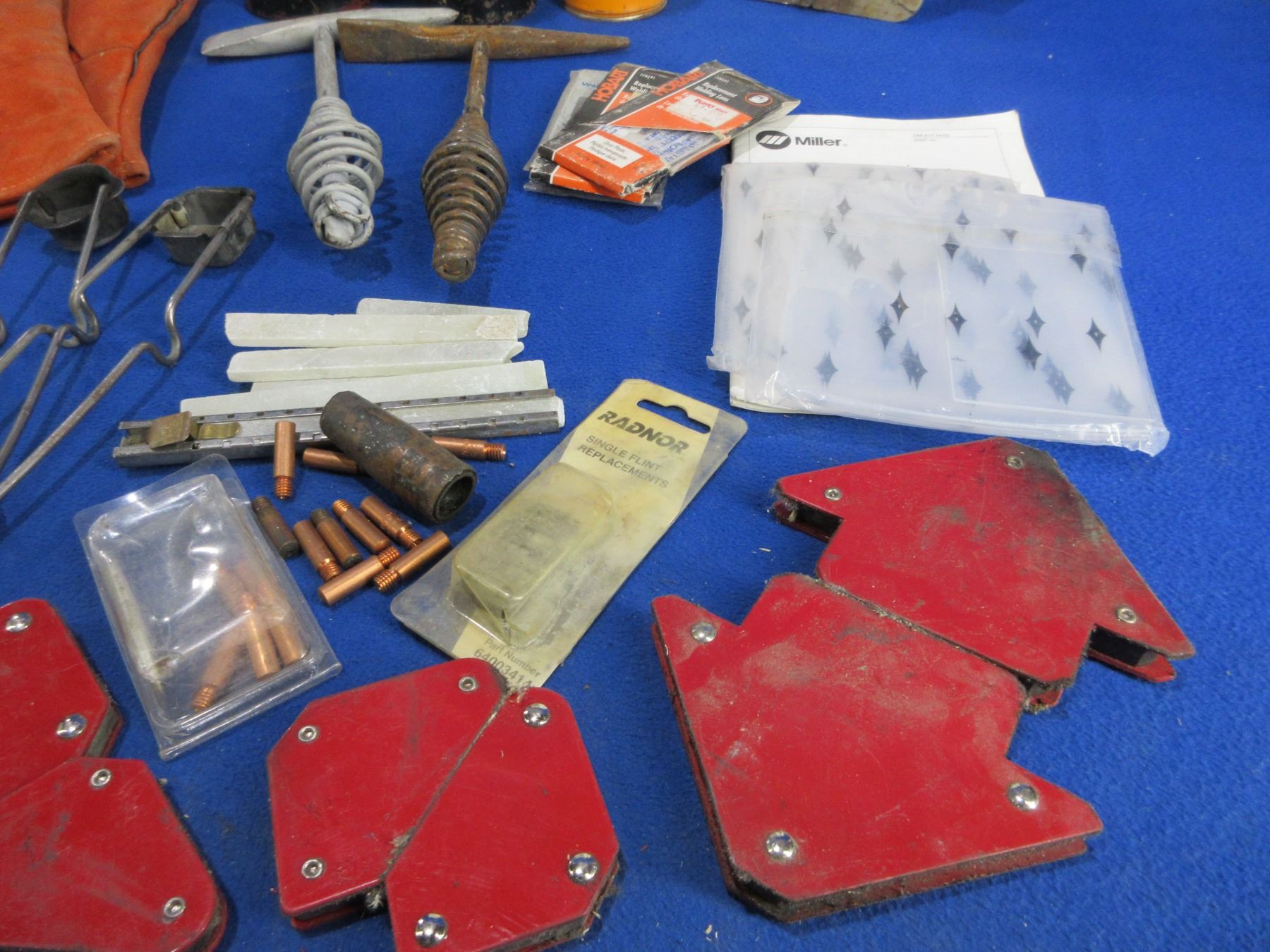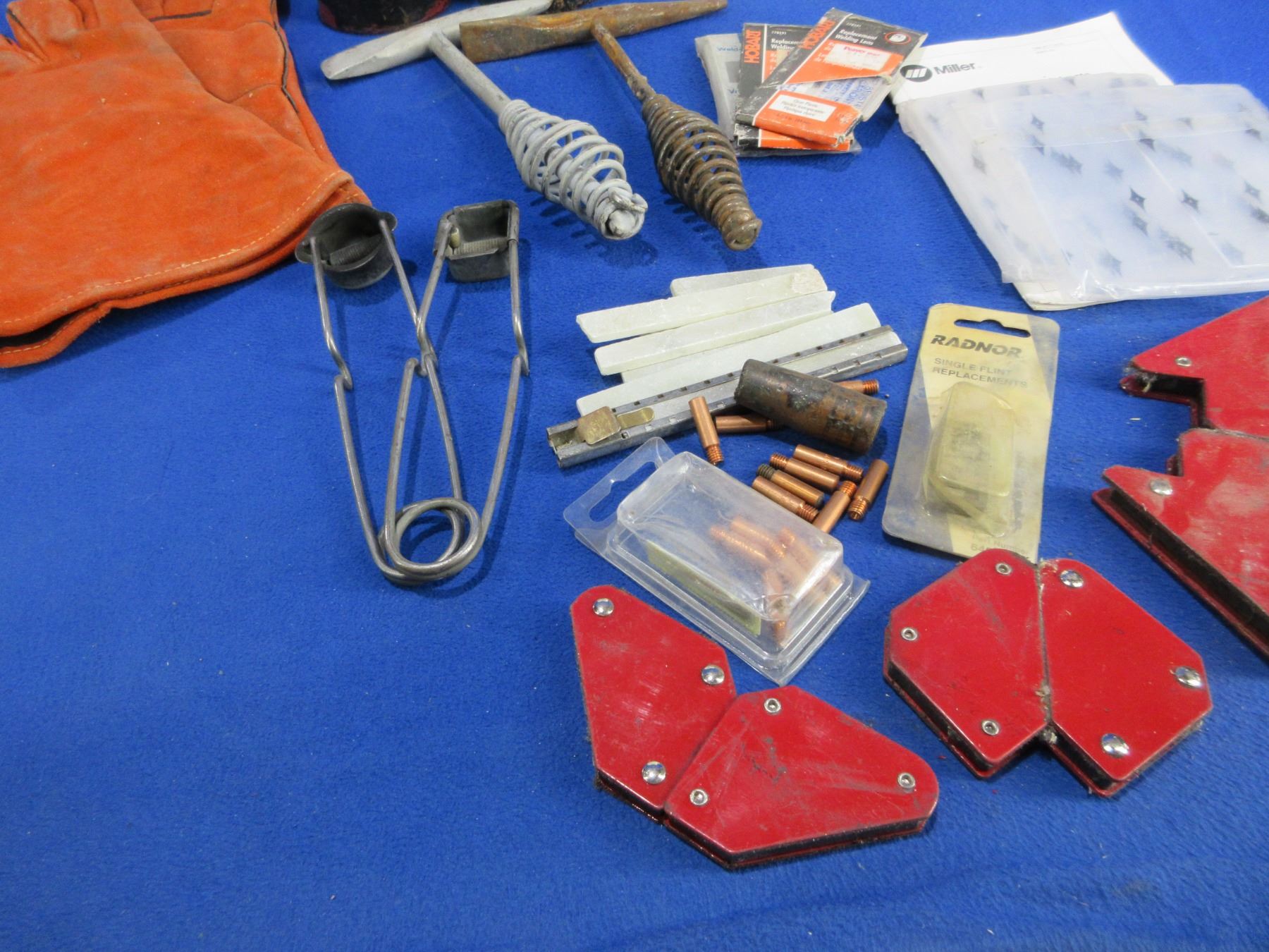 Lot of Misc. Welding Tools and Accessories - 2 welding chipping hammers, 2 cylinder caps, weld markers, vise grips, 2 flint strikers, 7 packs of welding rods, magnets, lens replacements, 15 contact tips, spatter block, etc. PICK UP ONLY (because of Spatter Block, could be removed for shipping)