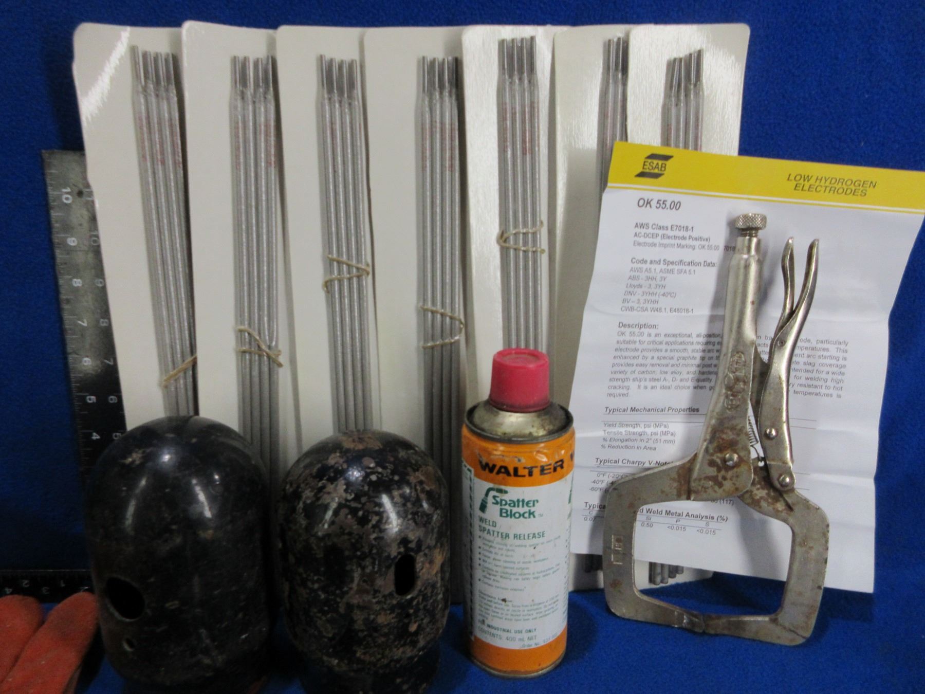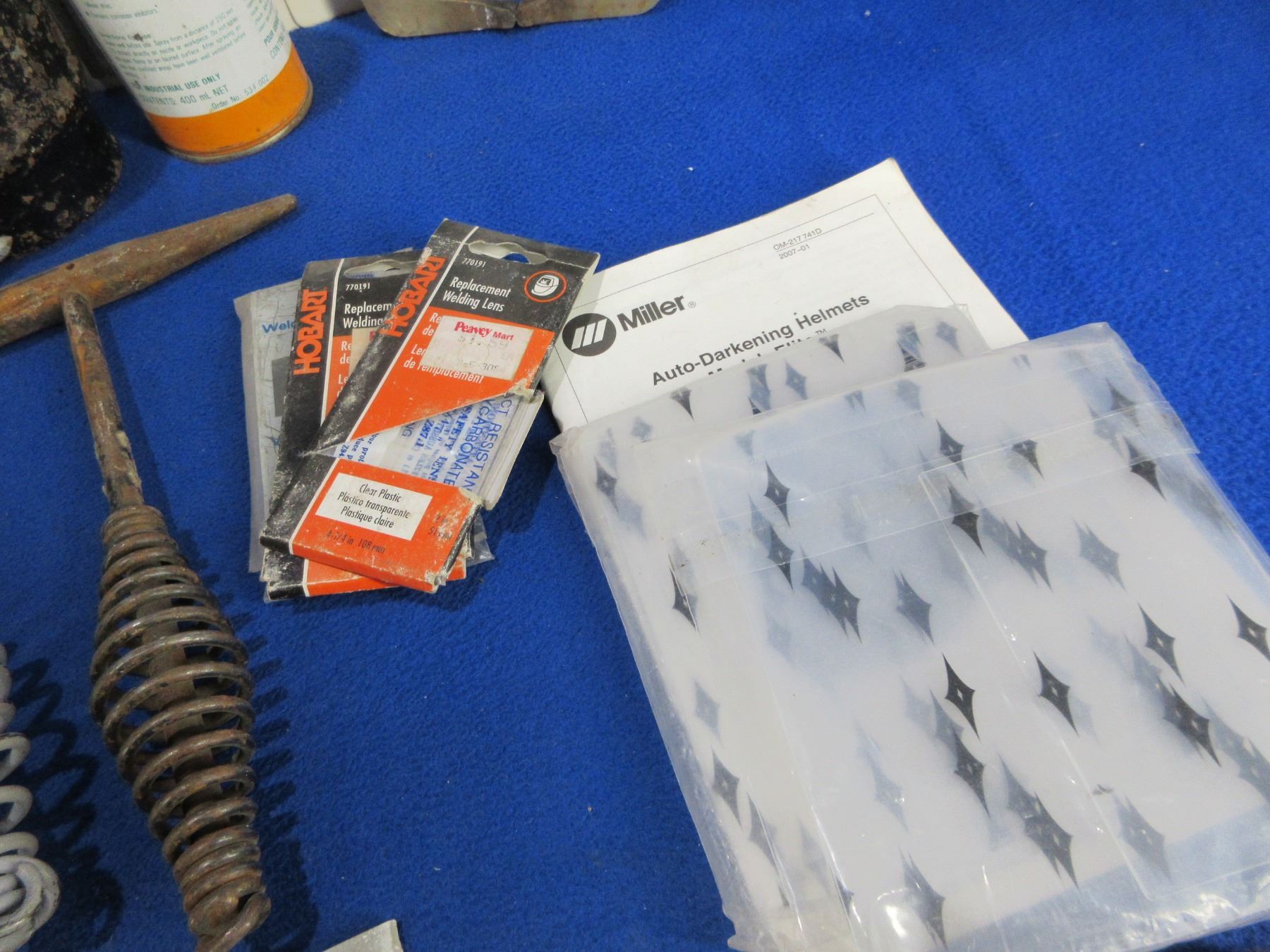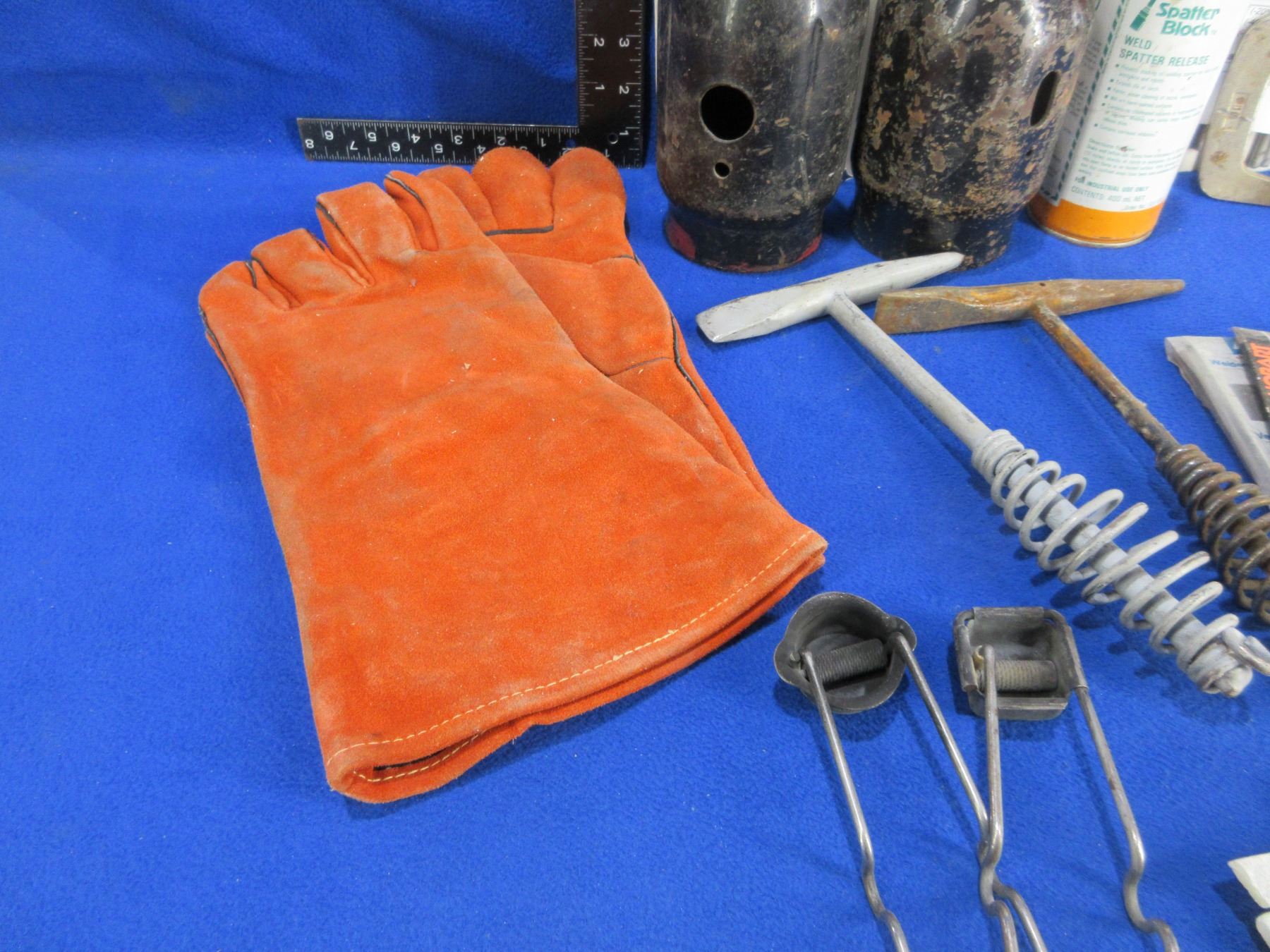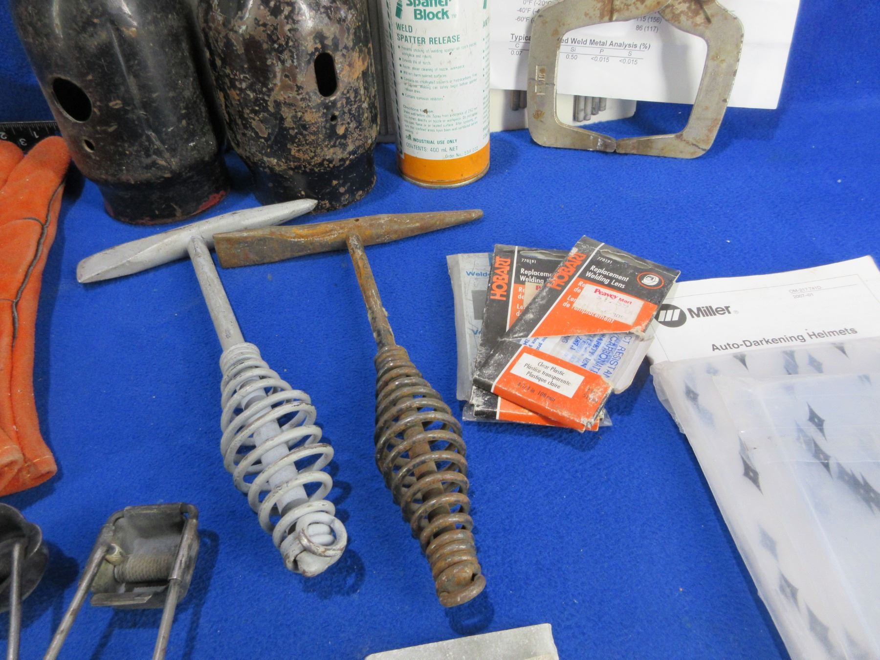 Lot of Misc. Welding Tools and Accessories - 2 welding chipping hammers, 2 cylinder caps, weld markers, vise grips, 2 flint strikers, 7 packs of welding rods, magnets, lens replacements, 15 contact tips, spatter block, etc. PICK UP ONLY (because of Spatter Block, could be removed for shipping)