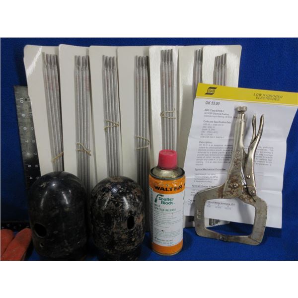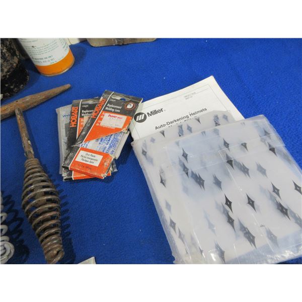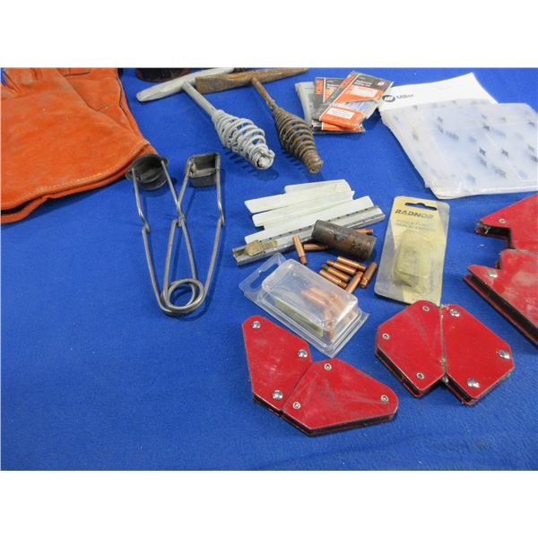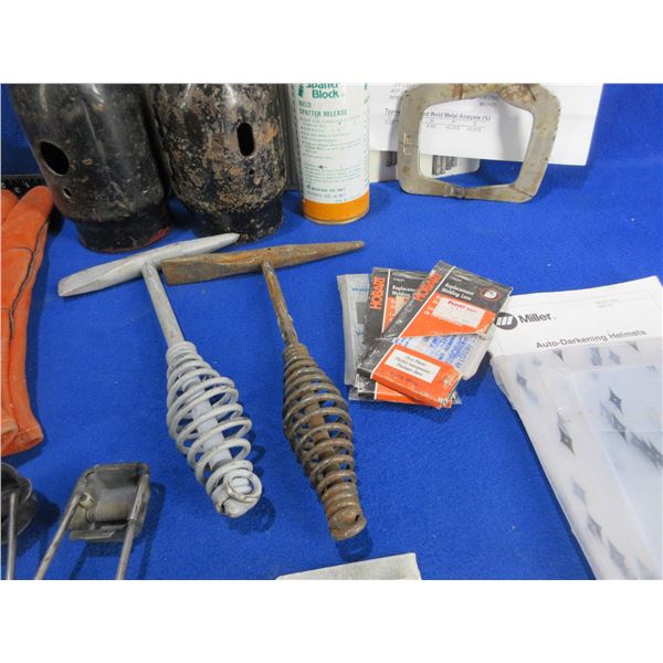 Lot of Misc. Welding Tools and Accessories - 2 welding chipping hammers, 2 cylinder caps, weld markers, vise grips, 2 flint strikers, 7 packs of welding rods, magnets, lens replacements, 15 contact tips, spatter block, etc. PICK UP ONLY (because of Spatter Block, could be removed for shipping)