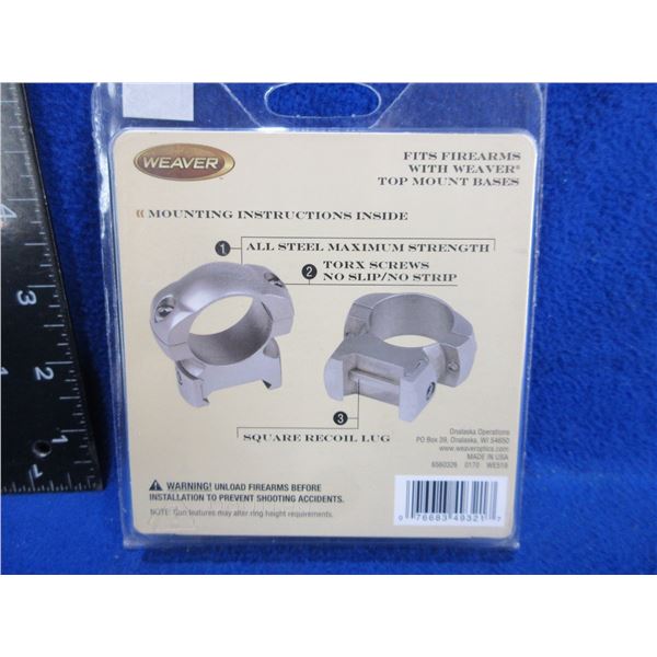 NEW - Weaver Grand Slam 1" Medium Top Mount Rings - Silver, Solid Steel # 49321