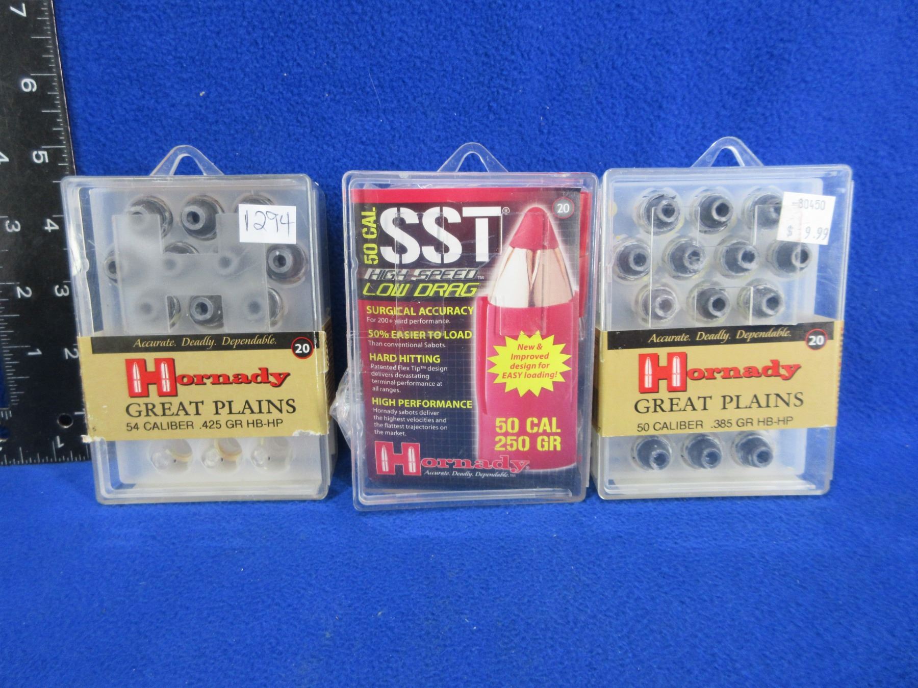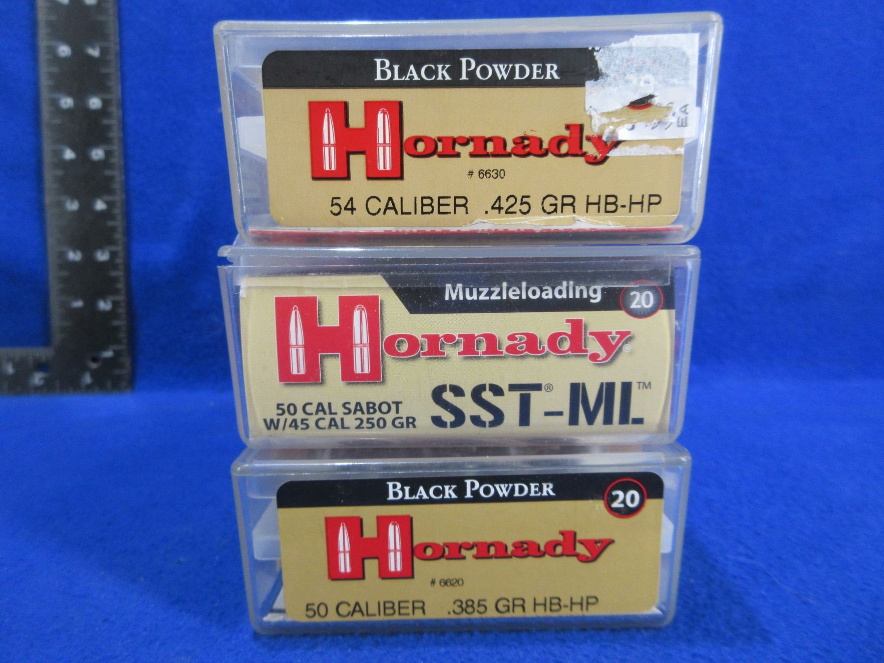 50 Cal. And 54 Cal. Hornady Black Powder Bullets - Box of 20 (50 Cal. 385gr HB-HP), Box of 23 (50 Cal. Sabot w/45 Cal. 250gr SST-ML), Box of 15 (54 Cal. 425gr HB-HP)