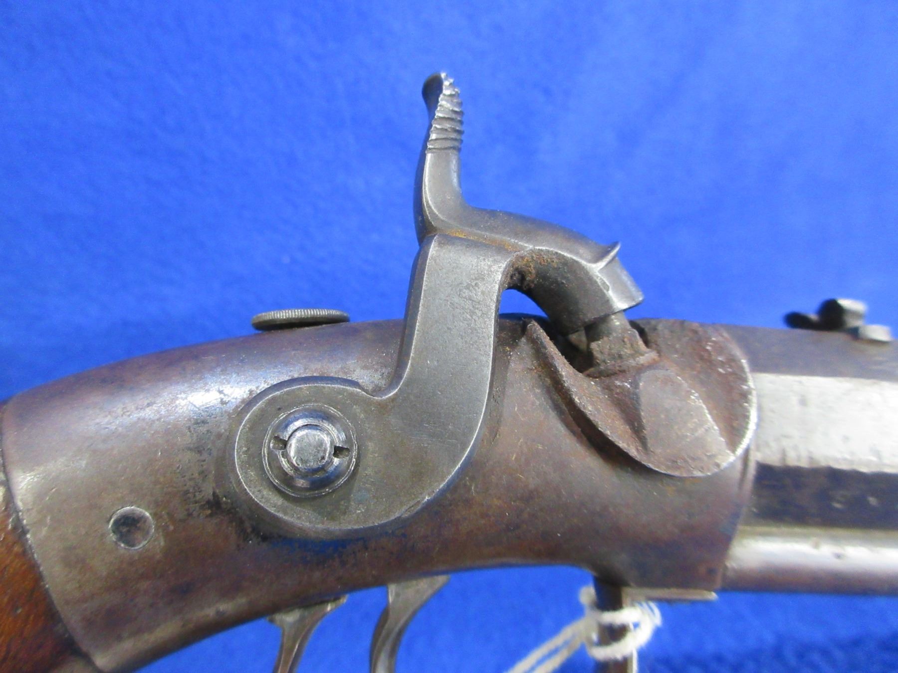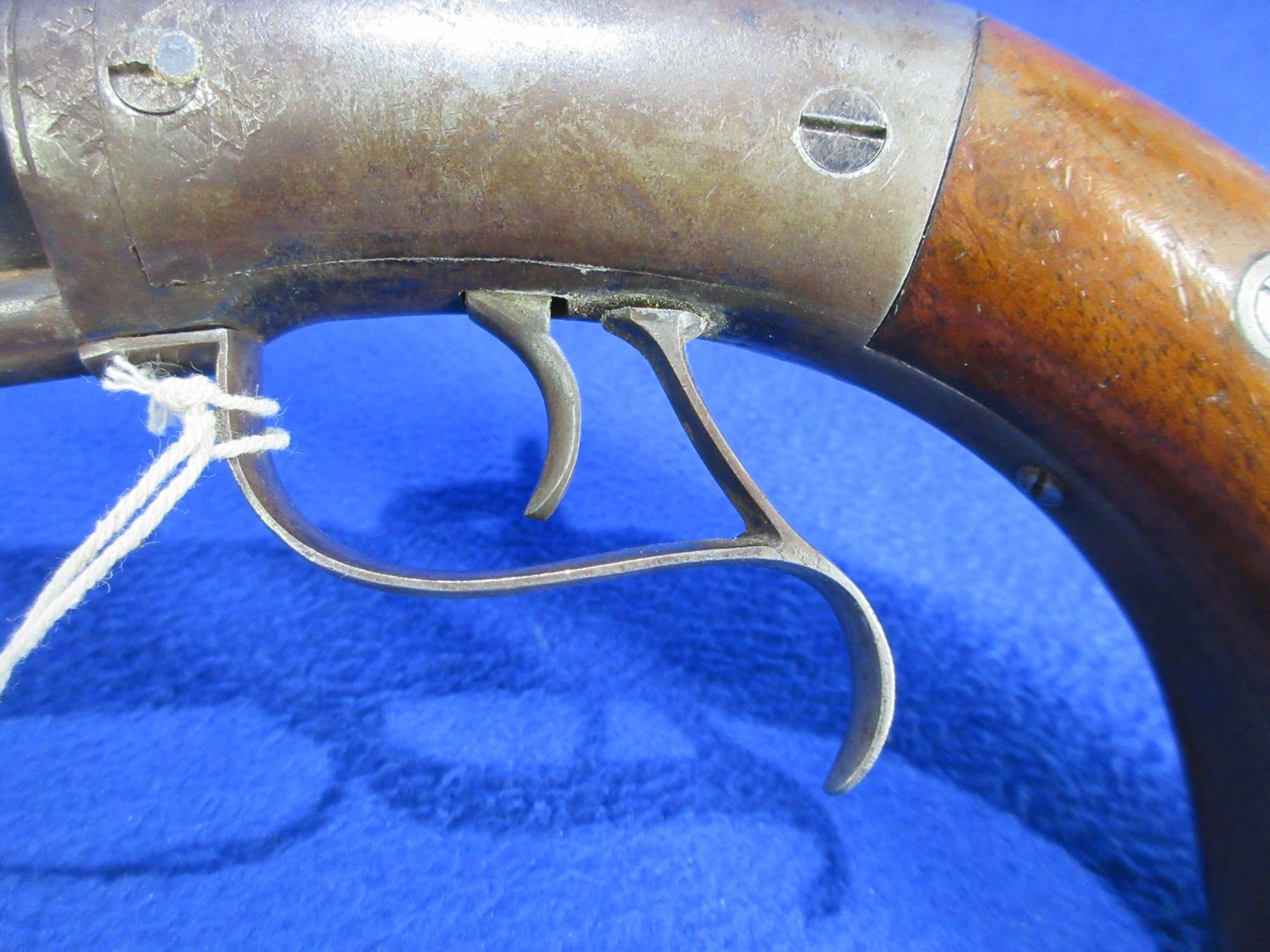 Antique - No PAL Required - Allen & Thurber Cap & Ball Pistol in 45 Cal. - Circa 1850's, rare and desirable, this cap and ball side hammer single-shot target pistol is in non working order as will not cock (hammer spring appears not working). Barrel is approx. 10", cannot see rifling as bore is dirty, wood grips are good for age with usage marks, ram rod is missing. Ser #158