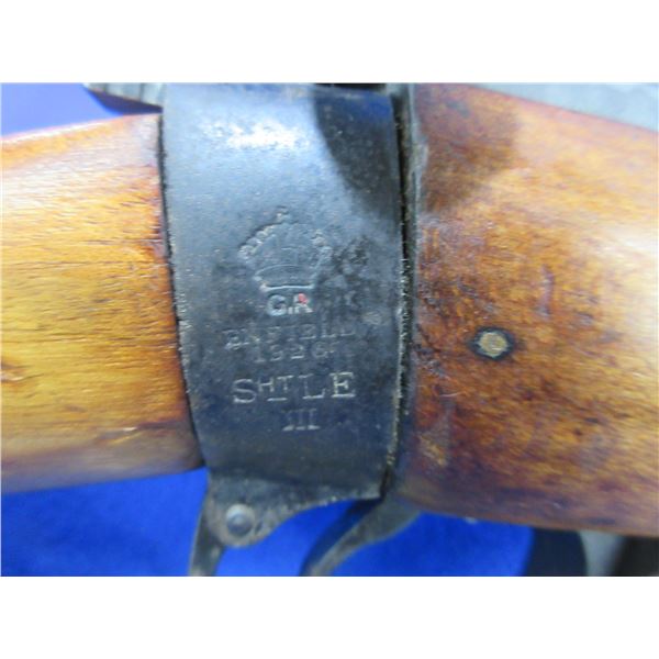 Non-Restricted - Lee Enfield No. 1 Mark III in 303 British - Marked "Enfield 1928 SHTLE III, Crown over G.R". This bolt action rifle with removable magazine appears to be in good to very good working order. Barrel is 23", rifling is good but dark, bluing is very good with light pitting, has both sights, full wood stock is good but has water stains at the butt with many usage marks and front handguard is missing, forearm has a crack on both sides at the muzzle, rear handguard has a crack on the right side, brass butt plate good, comes with rear swivel. Ser #C88701