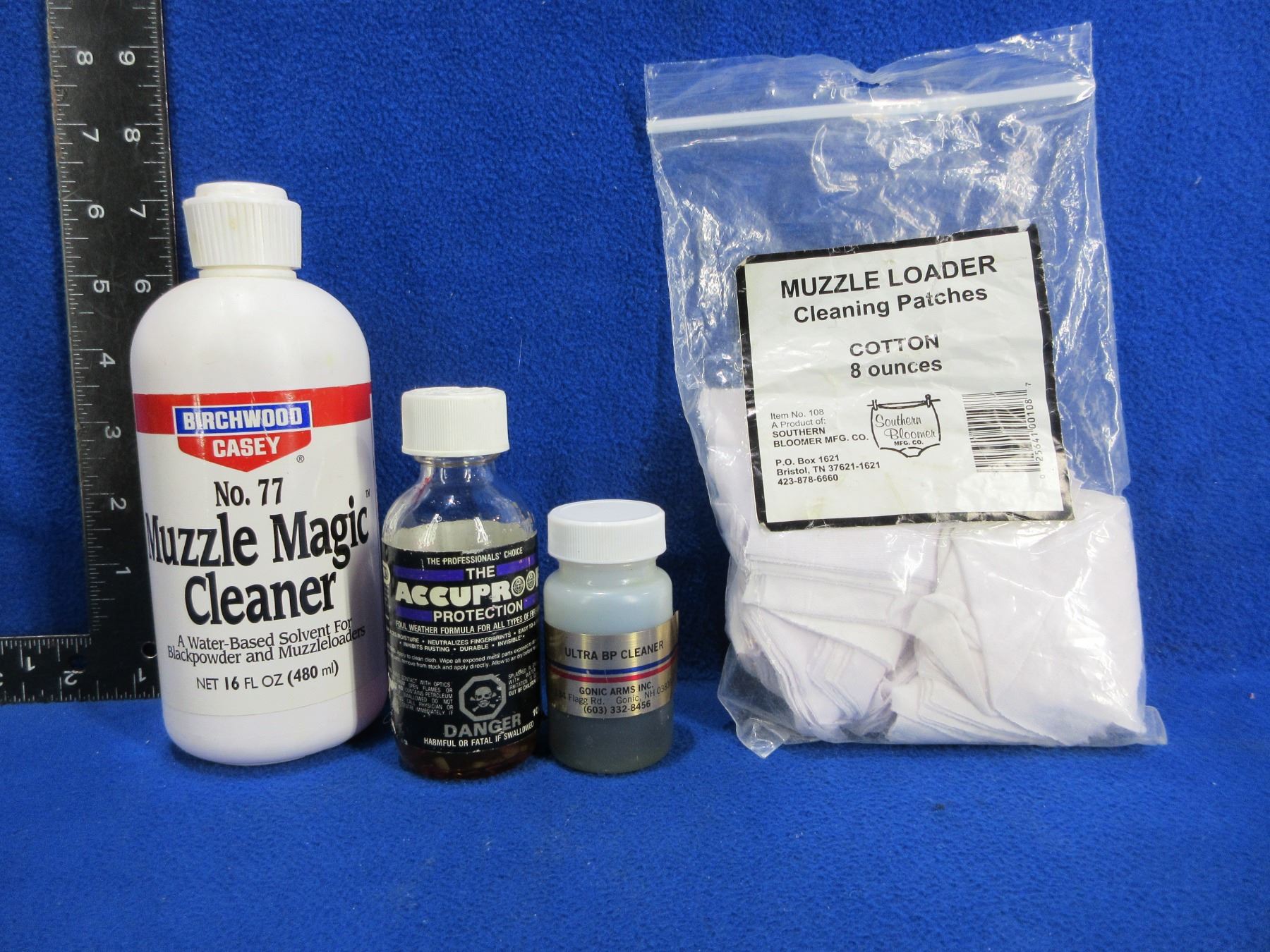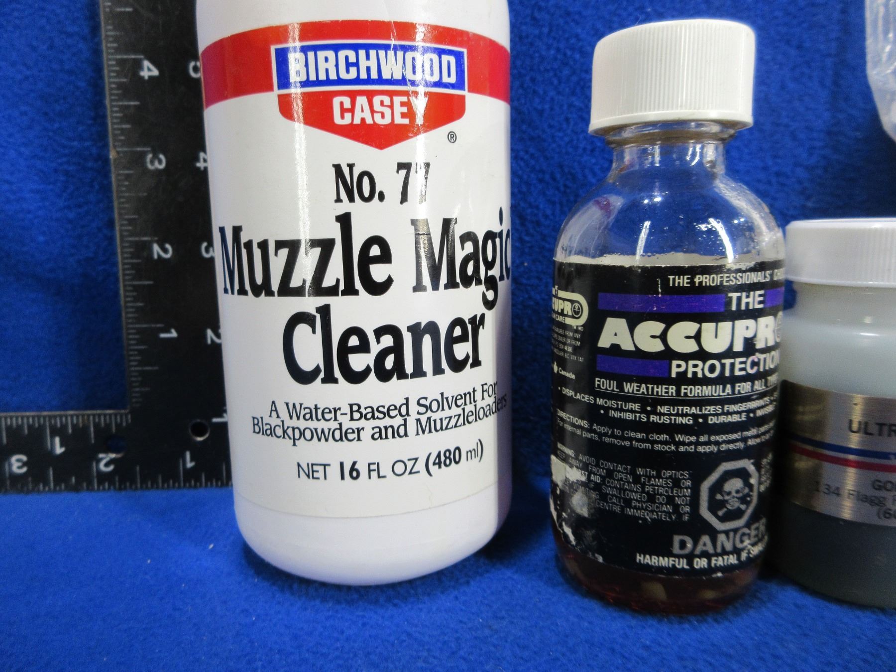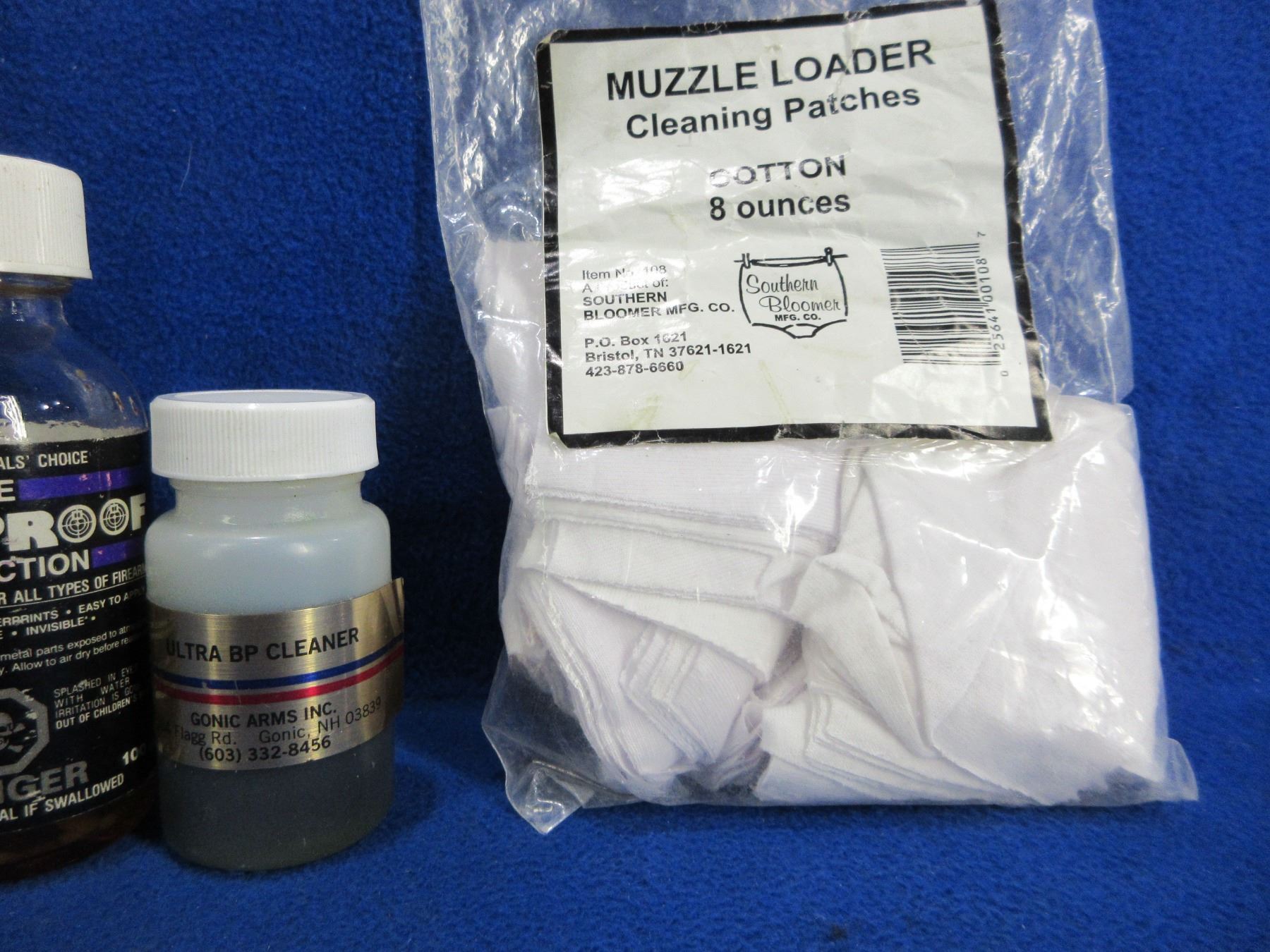 Lot of Misc. Gun Cleaning Oils, Solvents and Patches - Muzzle Magic Cleaner, Accuproof, Ultra BP Cleaner and Cleaning Patches - PICKUP ONLY