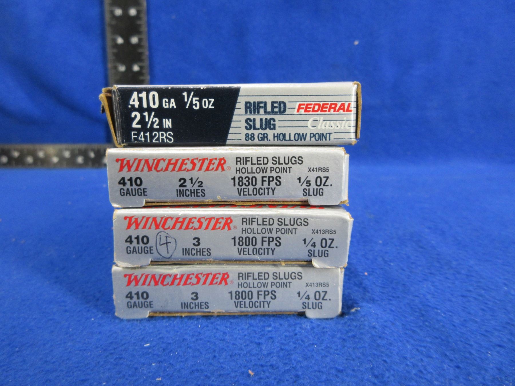 .410 Ga. Federal & Winchester Cartridges - Federal 2 1/2" Rifled Slugs (box of 5), Winchester 3" 1/4oz slugs (1 box of 5, 1 box of 4), Winchester 2 1/2" Rifled Slugs (box of 5) - PICK UP ONLY