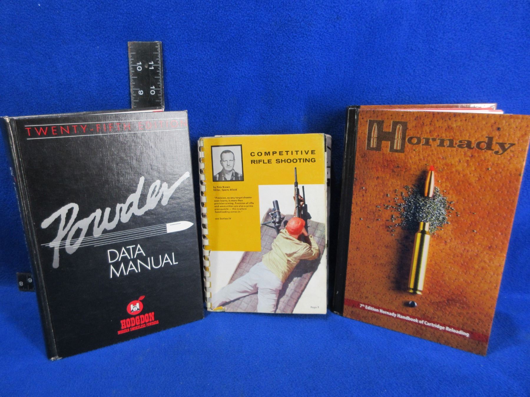 3 Books - Lyman Reloading Handbook (Cover Missing), Hodgdon Powder Data Manual 25th Edition, Hornady Handbook of Cartridge Reloading 7th Edition