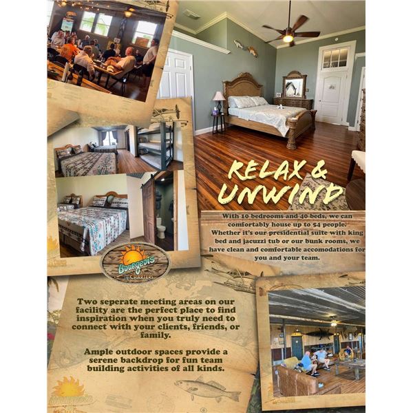 • 2 Nights Lodging, Meals and drinks for 3 Anglers