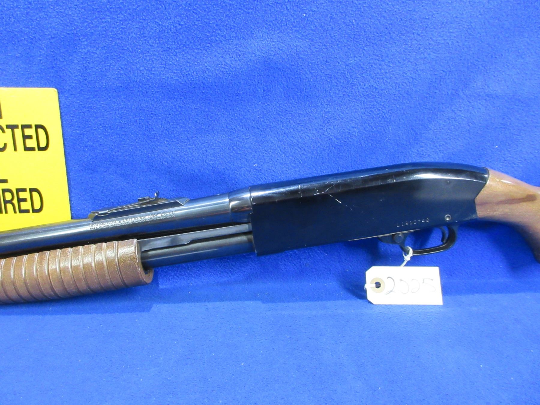 Non-Restricted - Winchester Defender in 12 Ga. 2 3/4" / 3" - This pump action shotgun is in nice clean condition and appears to be in good to very good working order. Barrel is 18 1/2", bore is good to very good, bluing is good with light scratches, has blade front sight, has rear sight, stock is good with usage marks, forearm is good with usage marks, rubber recoil pad good, comes with front stud and rear swivel. Ser #L1910748