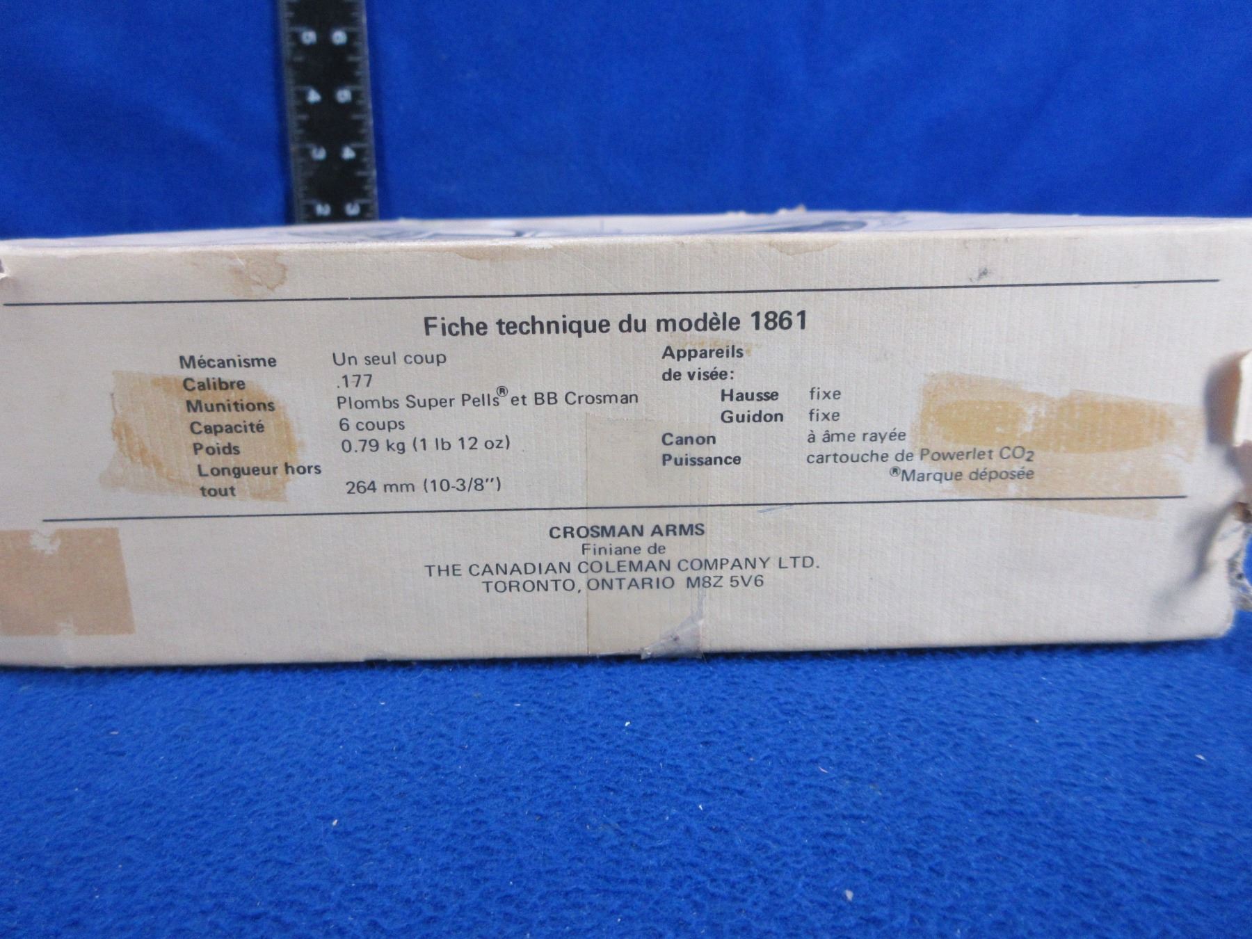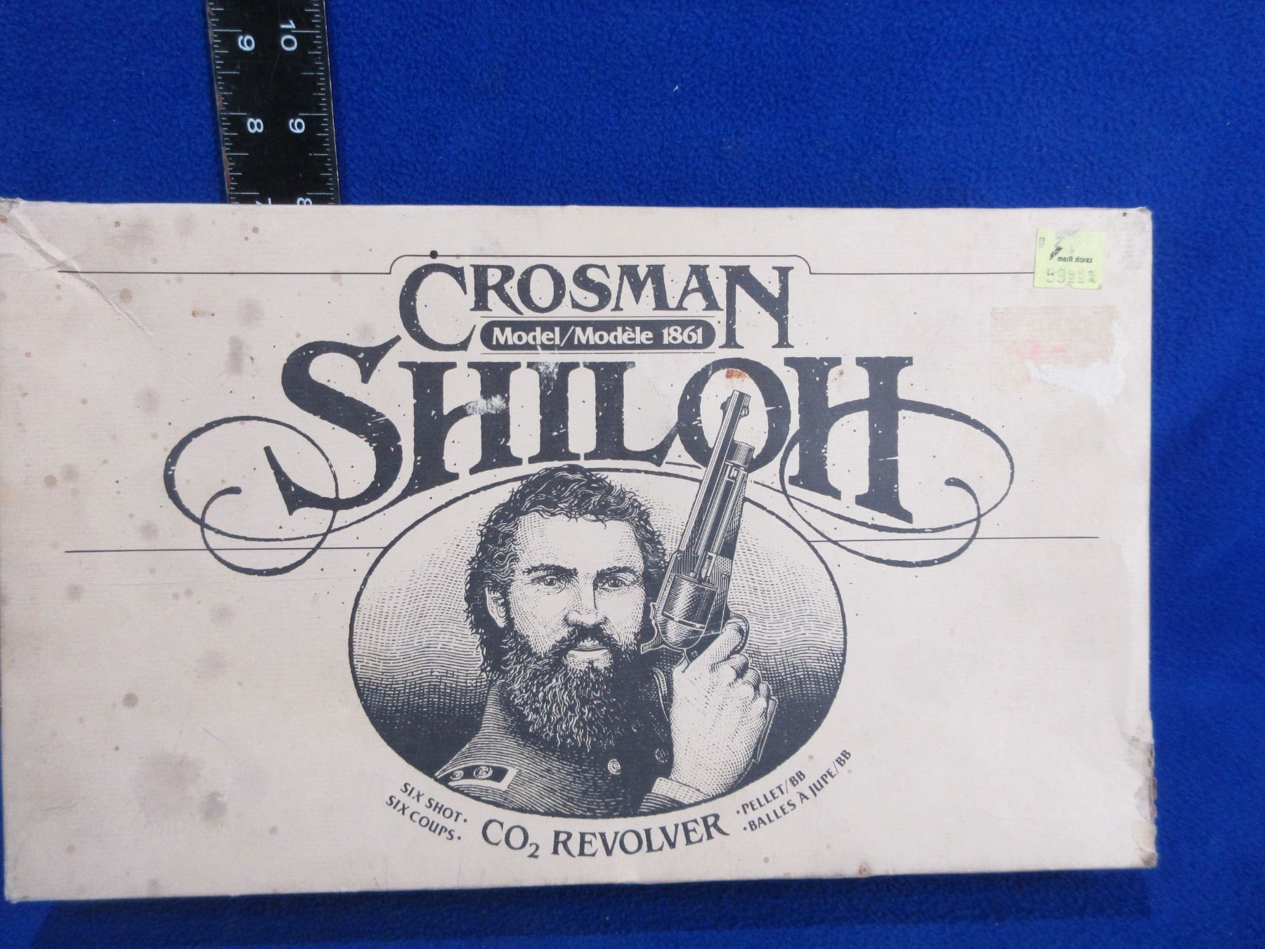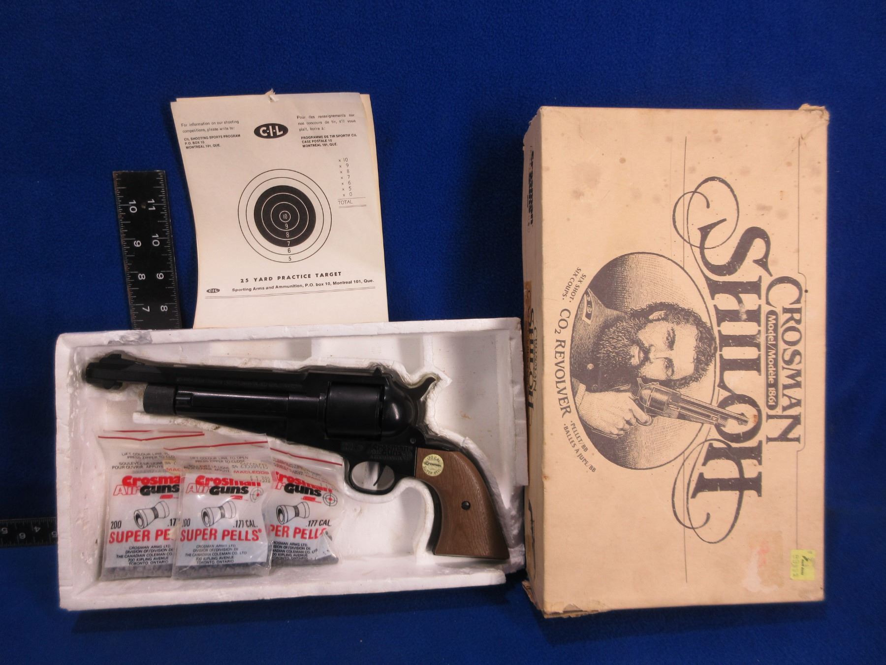 No PAL Required - Crossman Model 1861 Shiloh CO2 Revolver in 177 Cal. - This single action 6 shot CO2 revolver appears to be in good working order but has not been tested. Black finish is good, grips are good. Comes with pellets and original box (box has damage). Ser # D97871