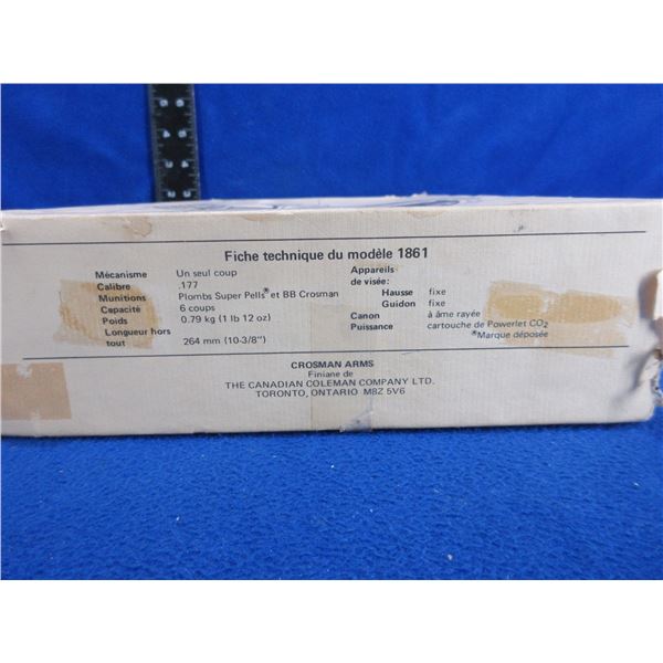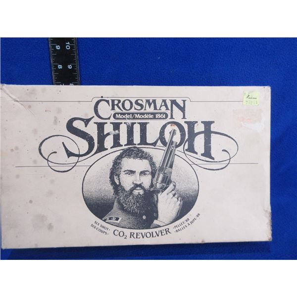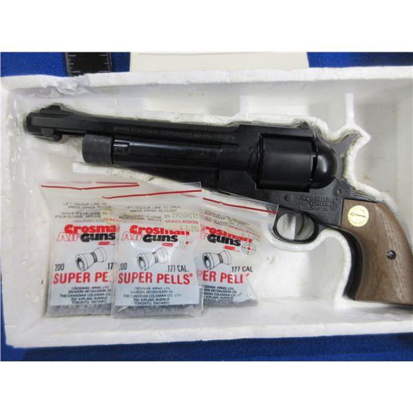 No PAL Required - Crossman Model 1861 Shiloh CO2 Revolver in 177 Cal. - This single action 6 shot CO2 revolver appears to be in good working order but has not been tested. Black finish is good, grips are good. Comes with pellets and original box (box has damage). Ser # D97871