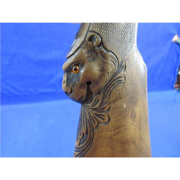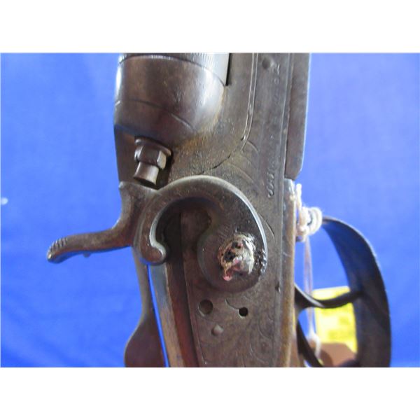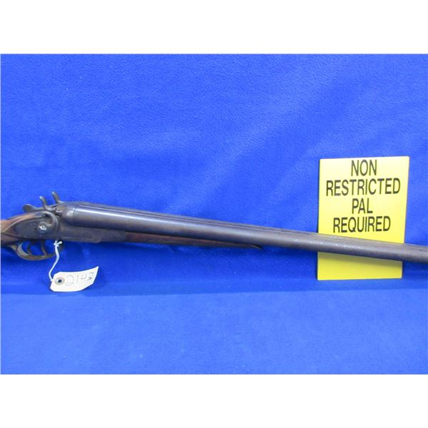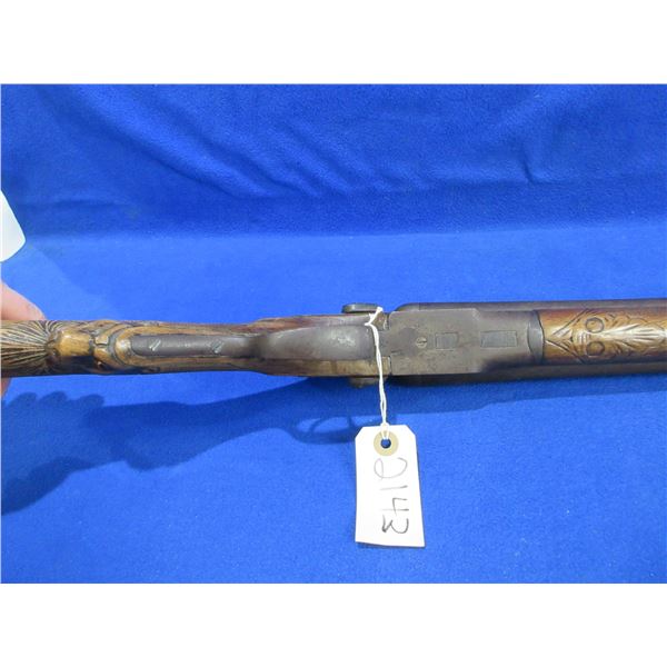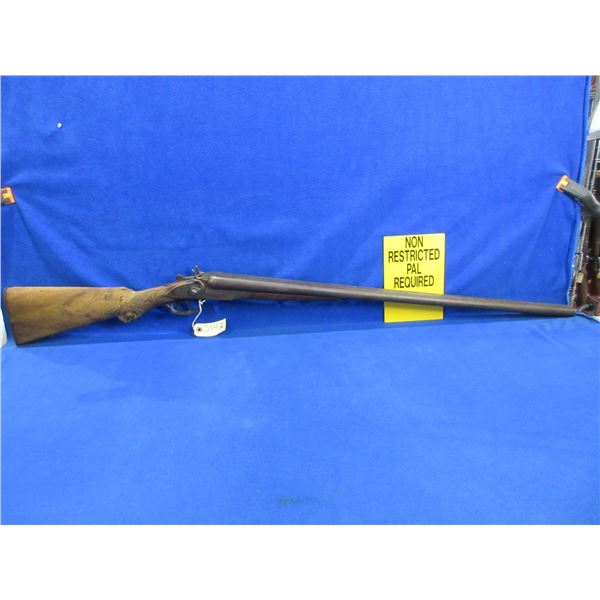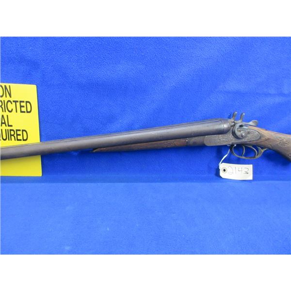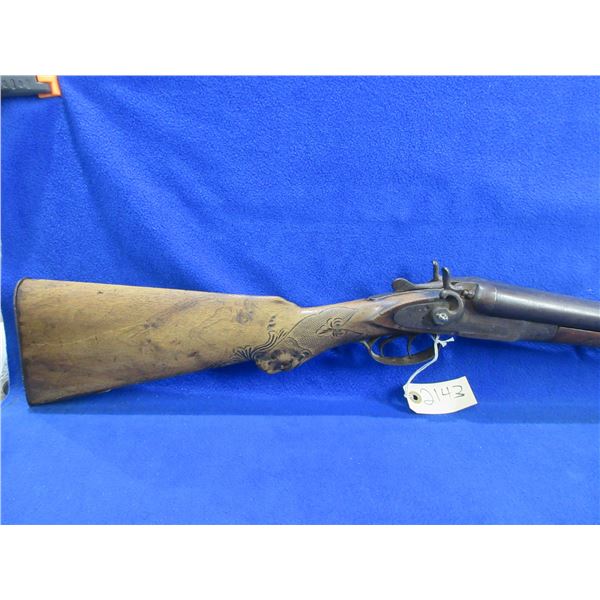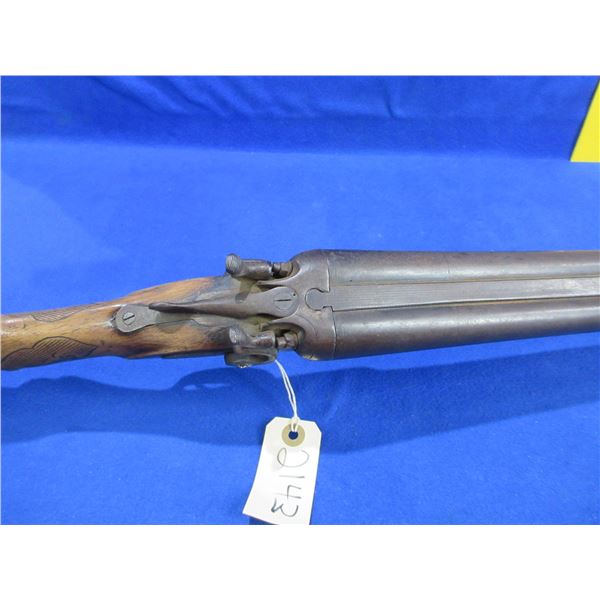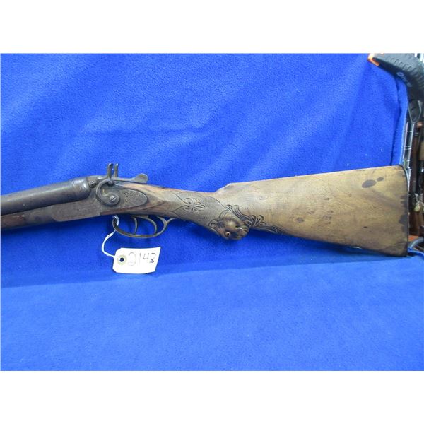 Non-Restricted - Janssen Sons & Co. SxS in 12 Ga. 2 1/2" - Interesting carving on the stock at the wrist area. This tip up hammer SXS shotgun appears to be in working order but should not be fired as the action has play and right hammer will not hold cock (hammer screw is poorly repaired). Damascus barrels are 30", bores are good, bluing is gone with rust and pitting, has bead front sight, stock is good with usage marks and some water stains on the butt, forearm has a chip on the front, metal butt plate. Ser # 15427