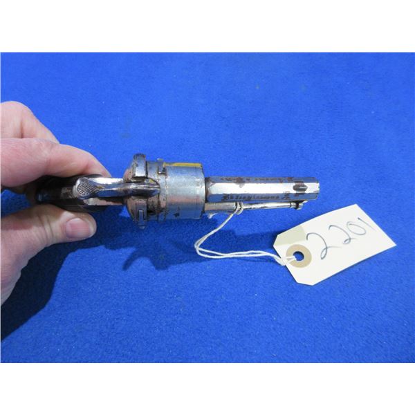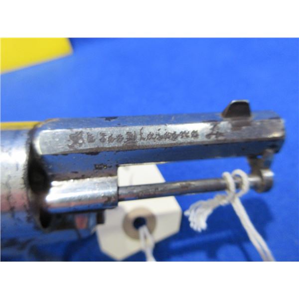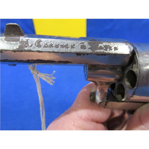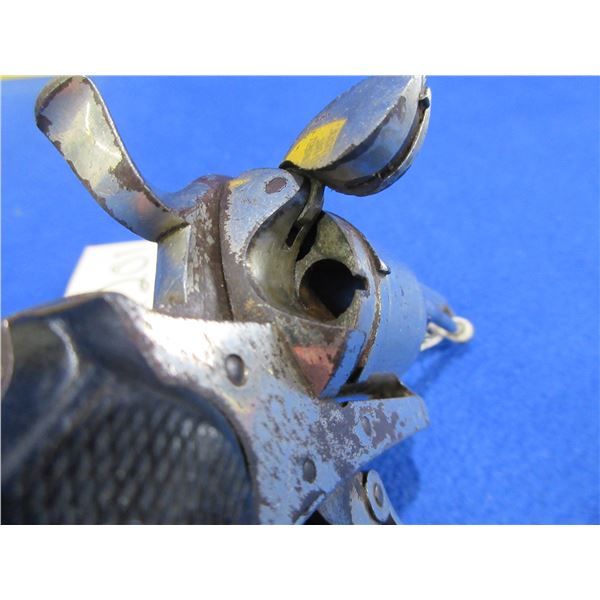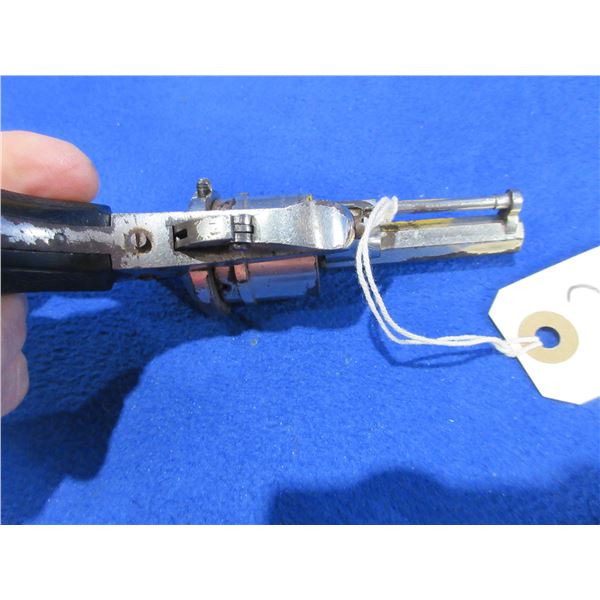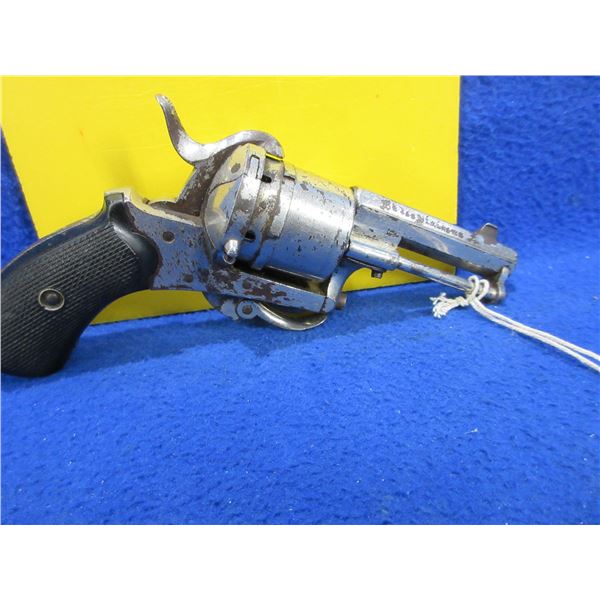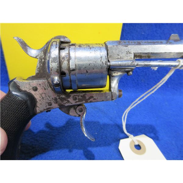 Antique - No PAL Required - St. Etienne in 7mm Pinfire - Anyone can own this antique revolver. This six shot double action revolver with folding trigger appears to be in good working order. Barrel is 2 1/4". rifling is good for age, silver finish has some light pitting, has both sights, grips are good. Ser # None
