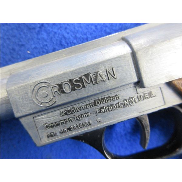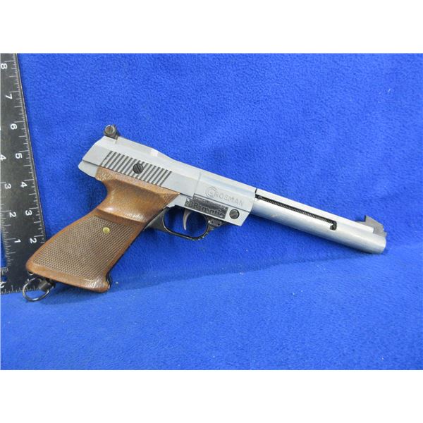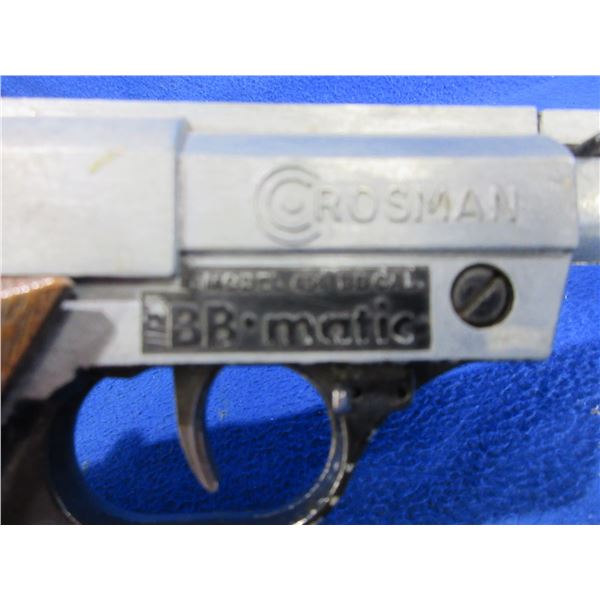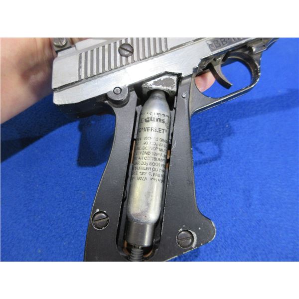 No PAL Required - Crossman 454 BB-Matic Pistol in BB Cal. - This semi-auto CO2 air pistol appears to be in good working order. 16 shot magazine, appears to have been painted silver, has front sight and adjustable rear sight, grips are good but 1 screw is missing. Ser #