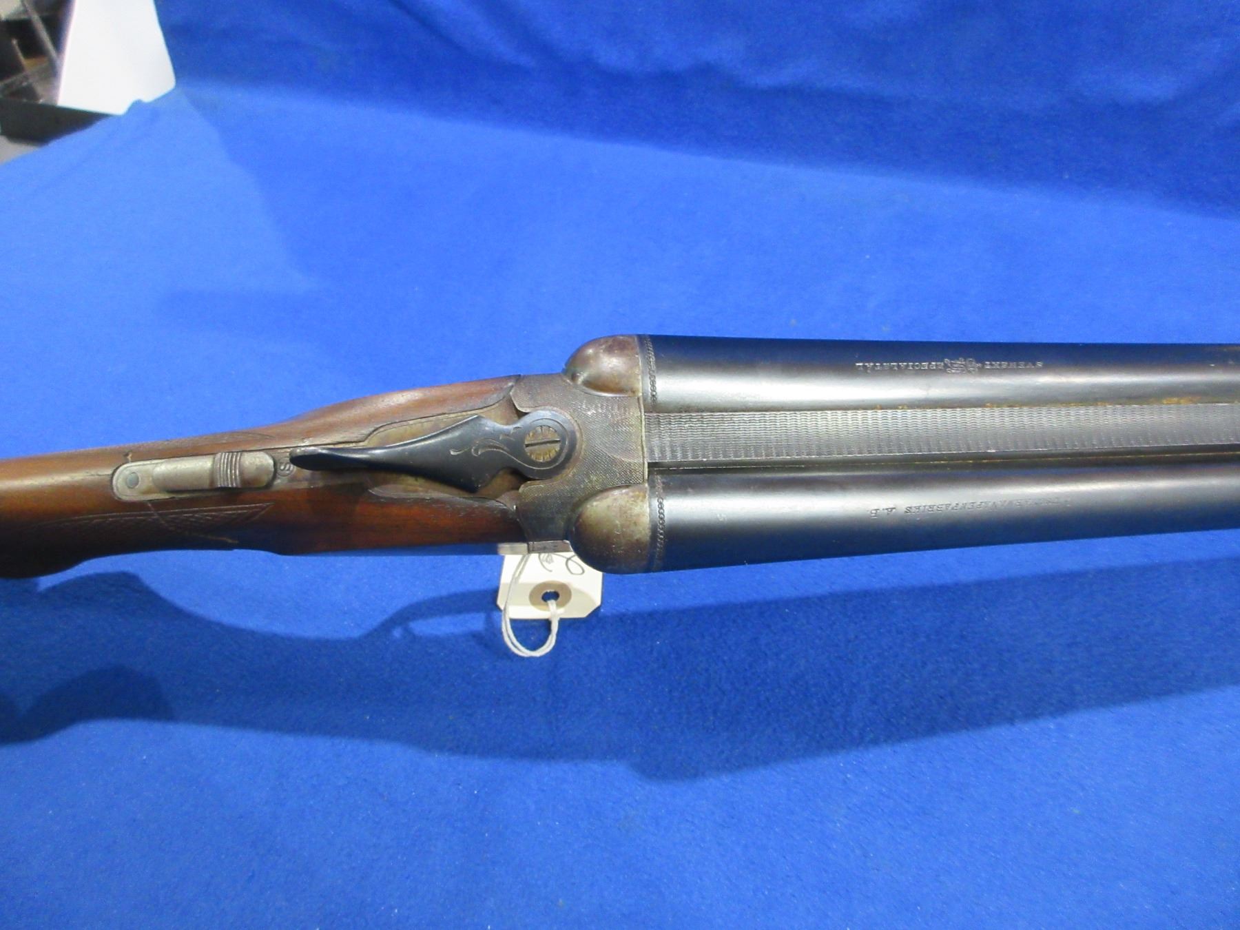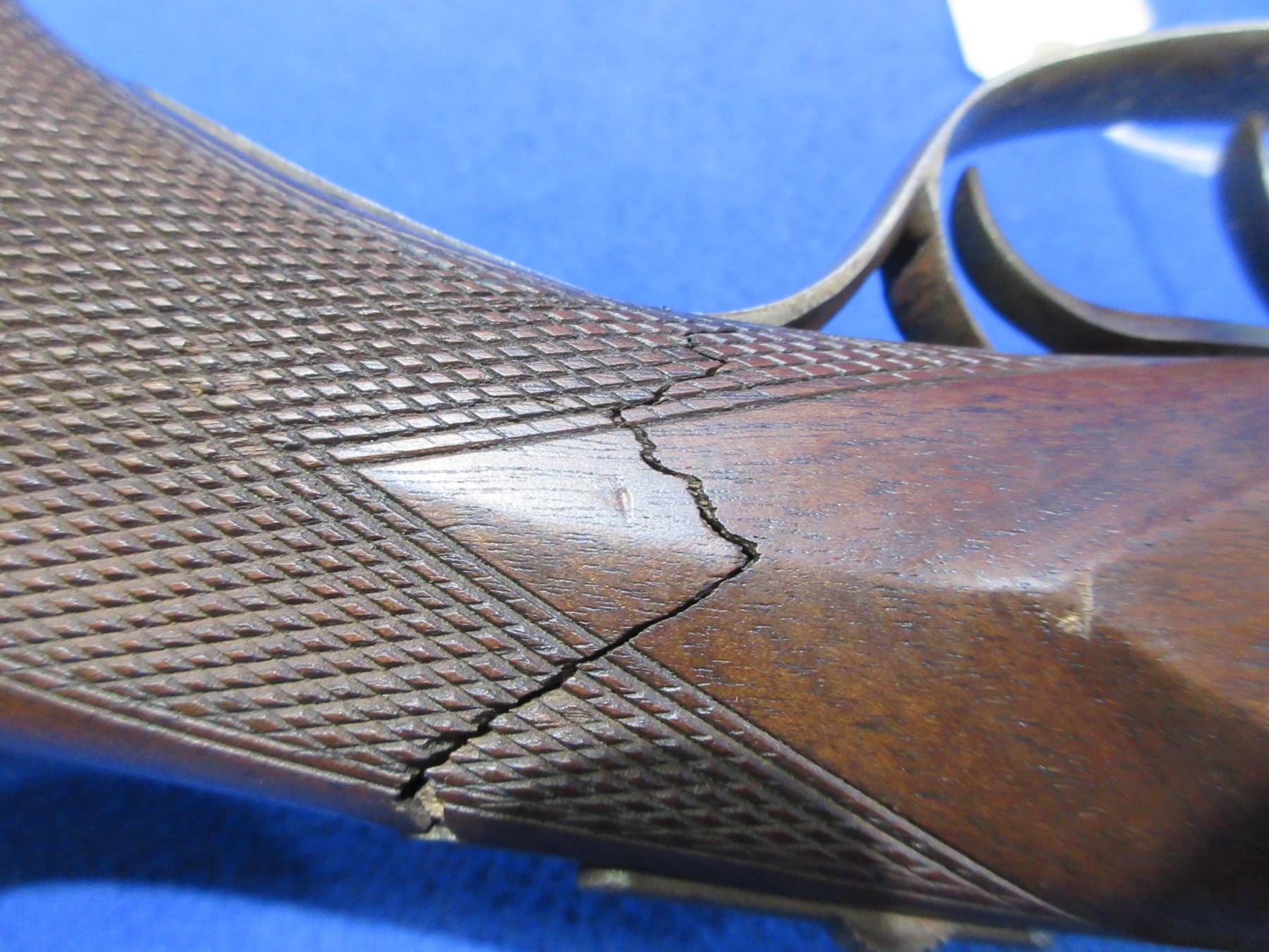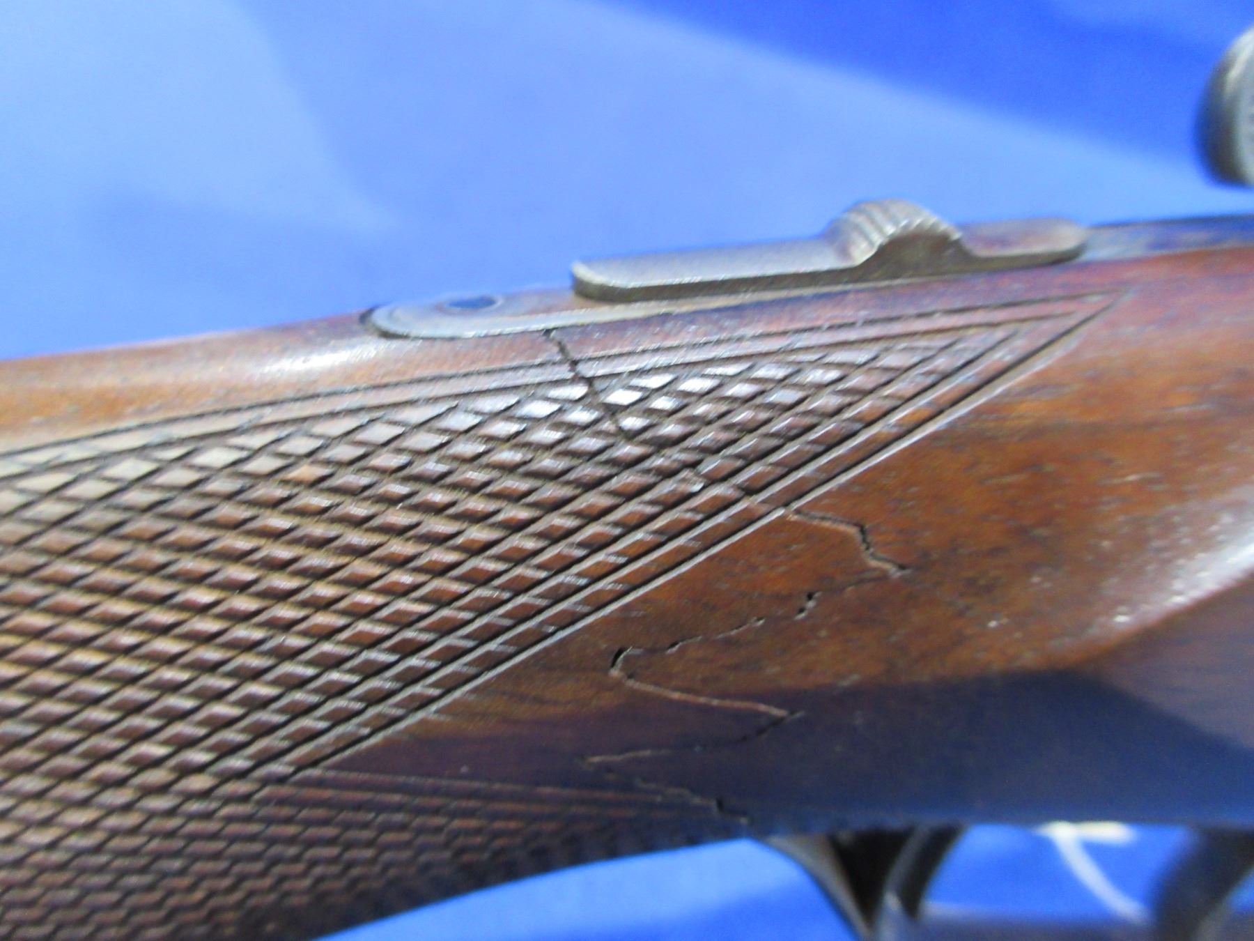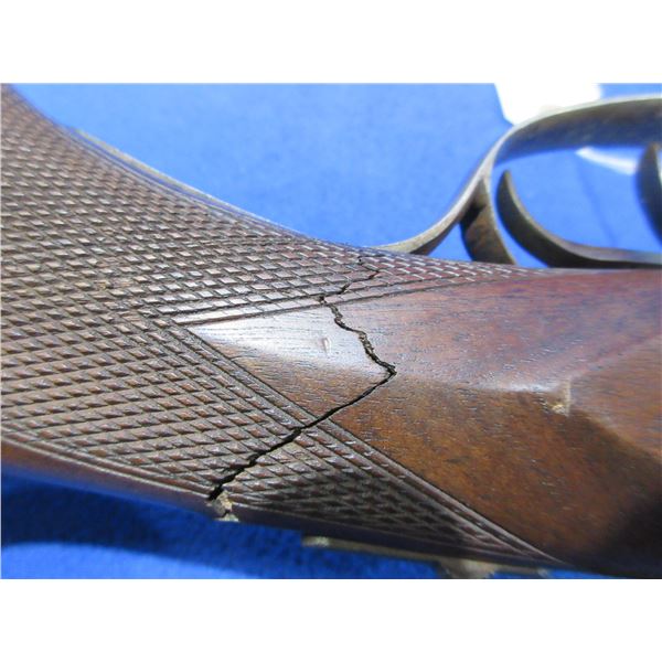 Non-Restricted - Husqvarna Model 1310 in 12 Ga. 2 3/4" - This tip up SXS shotgun appears to be in working order but should not be fired as the stock is broken in the wrist area, action is tight. Barrels are 27 1/2", bores are good to very good, bluing is good with some light pitting, has bead front sight, stock is broken in the wrist area, forearm is good but has a chip at the back on the right side, butt plate good, comes with swivels. Ser # 242324