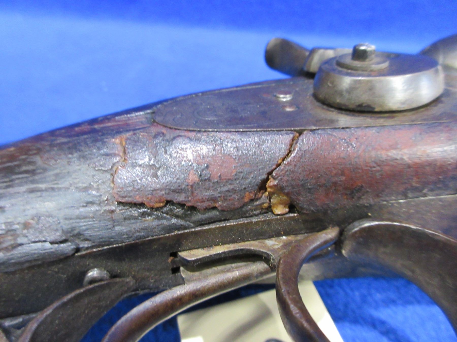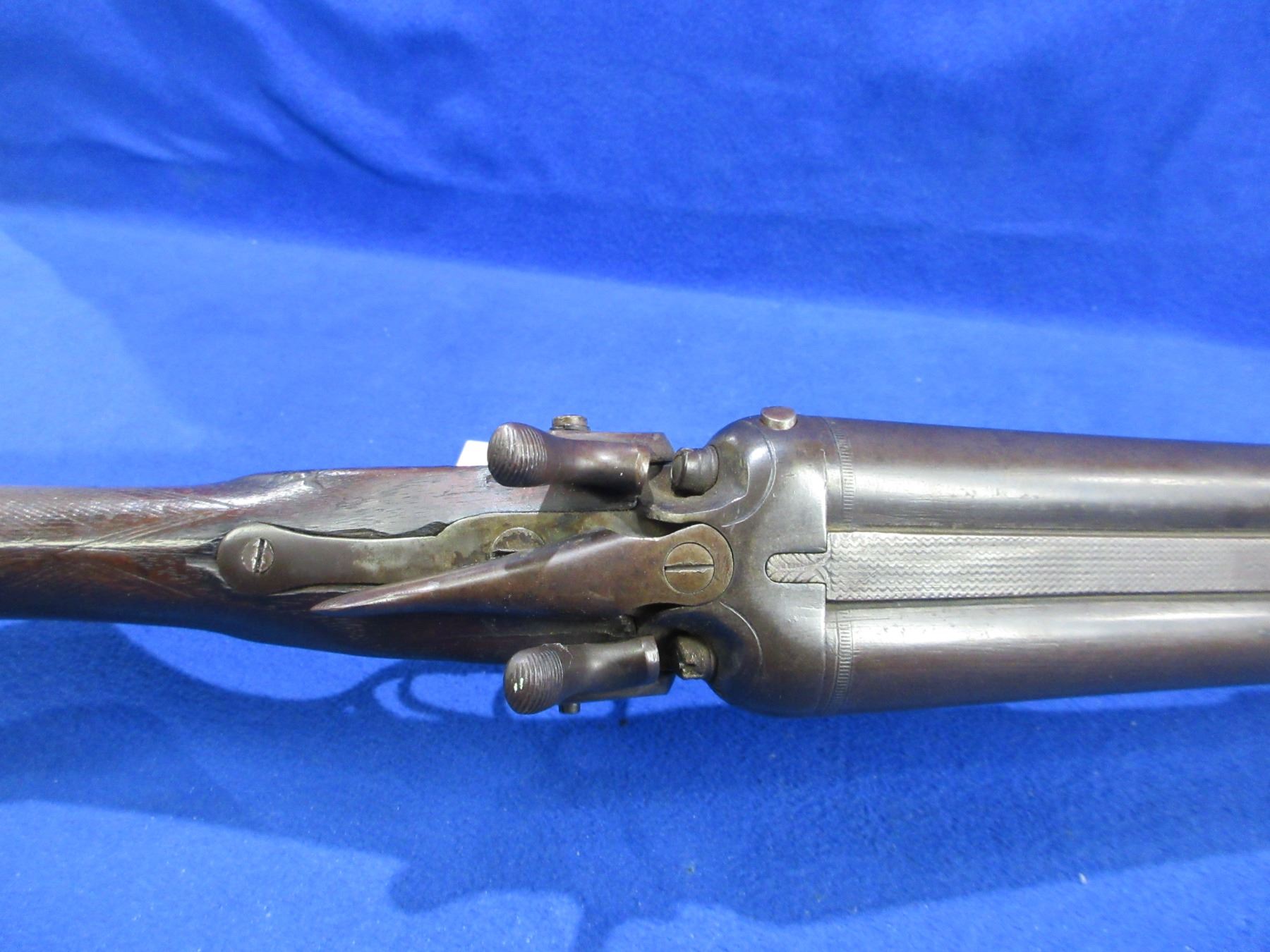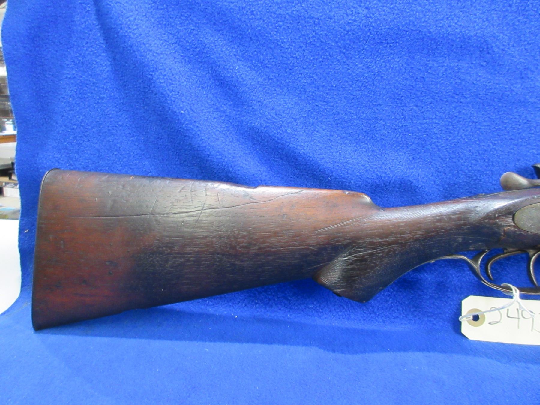 Non-Restricted - H. Spencer & Co. SxS in 12 Ga. 2 3/4" - This tip up SXS hammer shotgun appears to be in working order but should not be fired as stock is cracked in the wrist area, action is tight. Barrels are 30", bores are good, bluing is turning brown, bead front sight missing, stock is cracked on right side in the wrist area, forearm is poor, metal butt plate, swivels are missing, wrist cap missing. Ser # 10418
