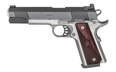 Springfield, Ronin, 1911, Single Action Only, Semi-automatic, Full Size, 9MM, 5" Match Grade Barrel, Steel, Blued Slide, Stainless Frame, Wood Grips, Fiber Optic Front Sight, Tactical Rack White Dot Rear Sight, Manual Thumb Safety, 9 Rounds, 1 Magazines