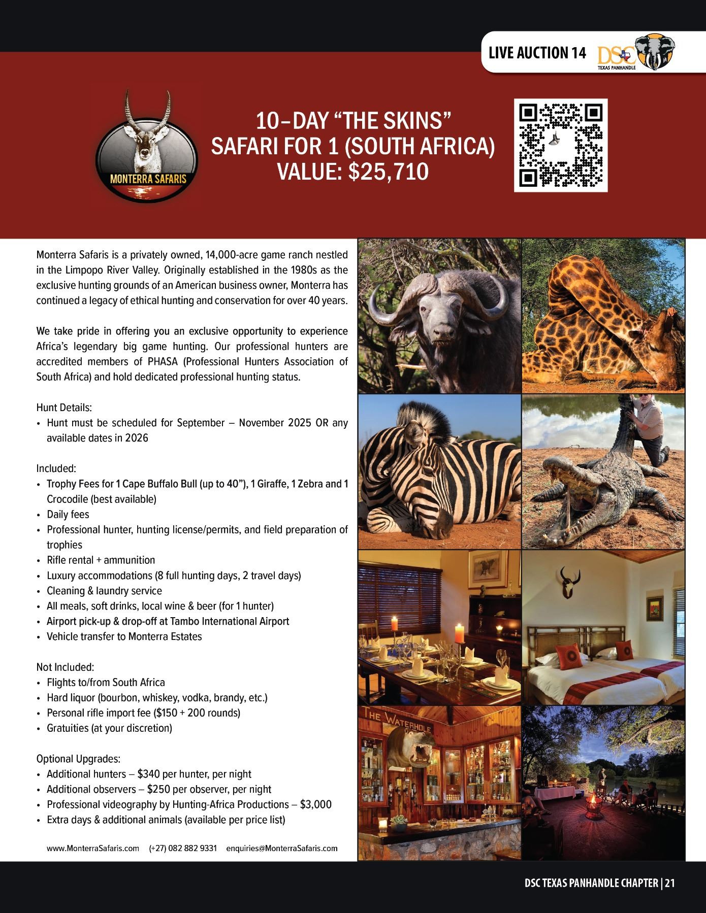 Lot 14 "THE SKINS" SAFARI PACKAGE FOR 1 (SOUTH AFRICA) W/ MONTERRA SAFARIS (BUFFALO, GIRAFFE, ZEBRA