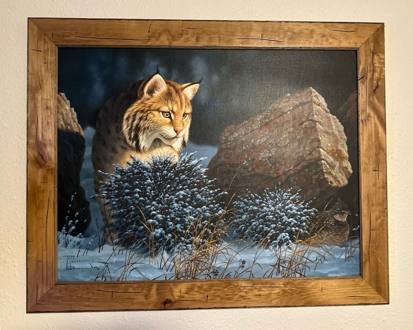 A prowling bobcat has been alerted to the presence of a hiding grouse. Tom Mansanarez signed print number 83/95. 24.5"x30.5" framed print.