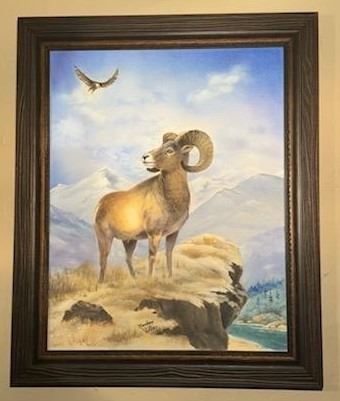 This is an original framed oil painting by local artist Marlene Wiles, of a bighorn ram and an eagle in a beautiful mountain scene. Size is 20x28”.