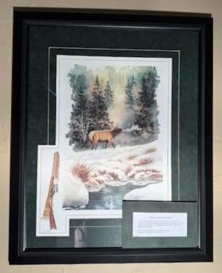 This painting is by award-winning watercolor artist Gene Sherman. It is a watercolor of a Bull Elk wandering along fresh snowy morning with the sun starting to break through. The original was a commission for the Rocky Mountain Elk Foundation.