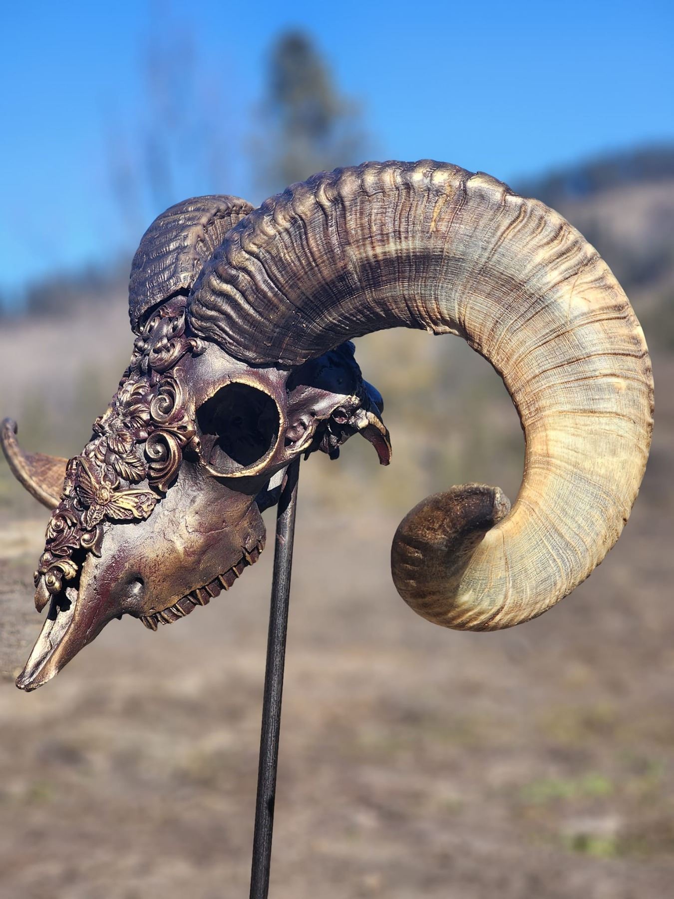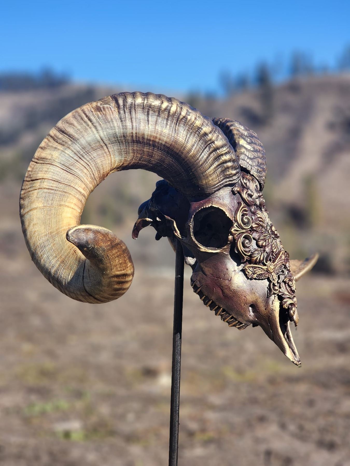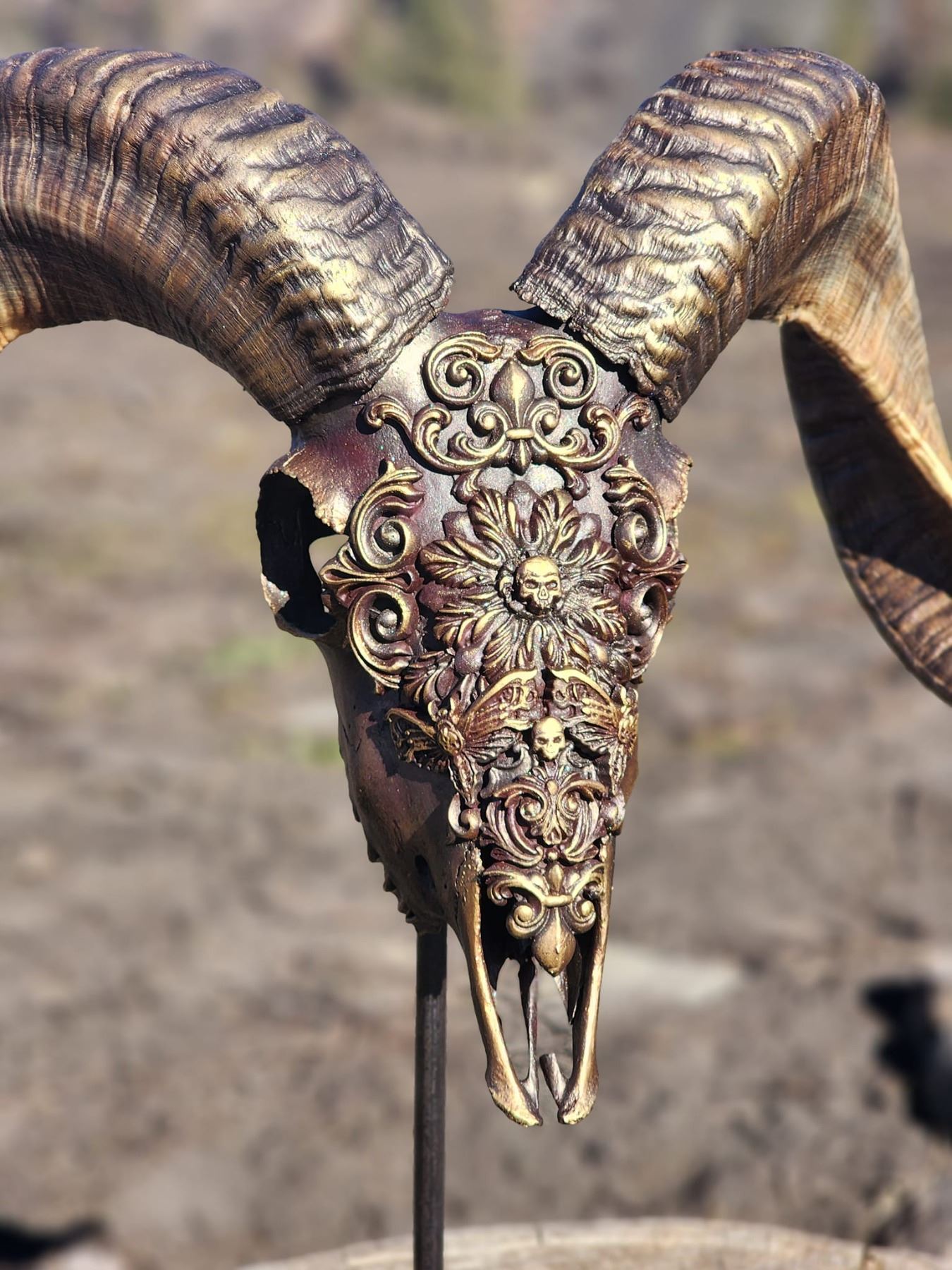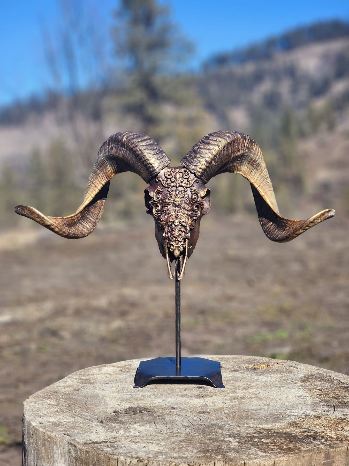 This full curl Ram is awesome. We added scrolling molds and intermixed skulls and skull moths into the layout for a truly unique look. A custom paint color was added to reflect the tones in the horns while wax and mica powders were used for dark shading and gold highlighting popping all the design work and complimenting the coloring of the powerful horns. This ram comes with a very metal stand that has been cemented into the skull.