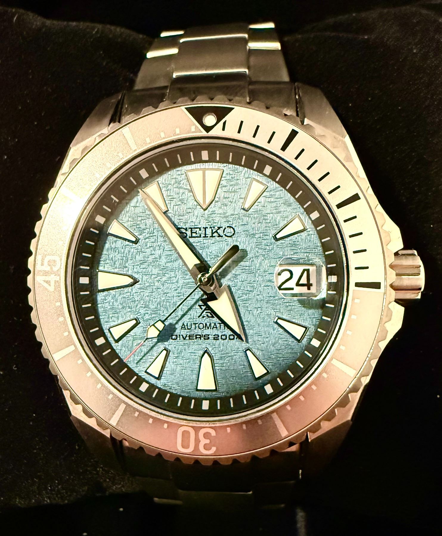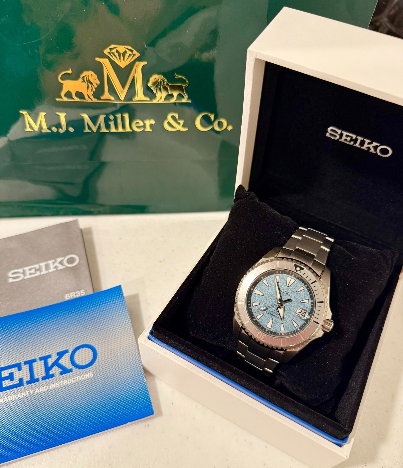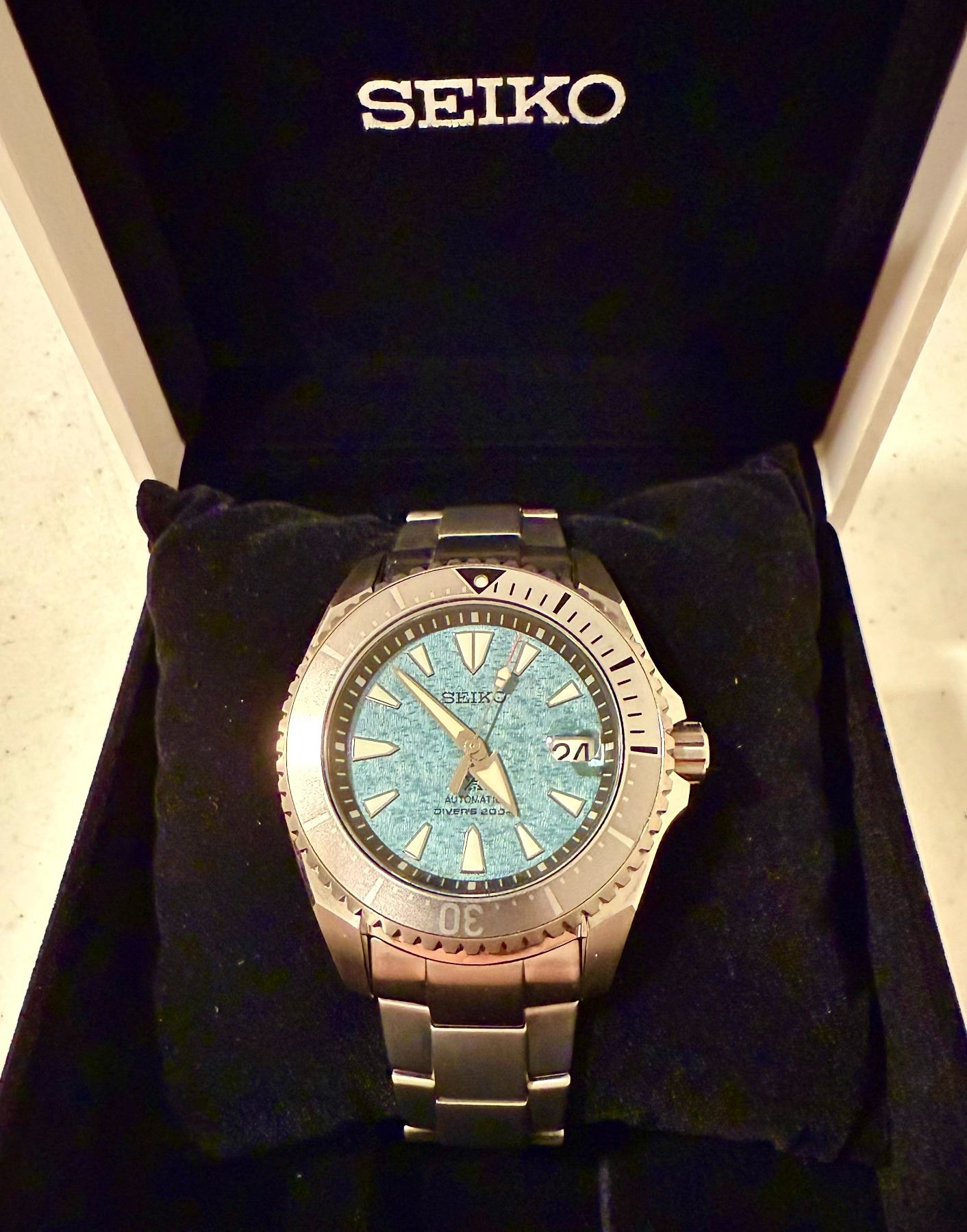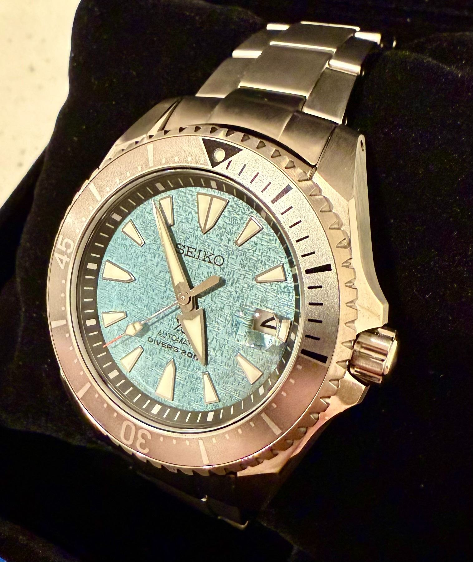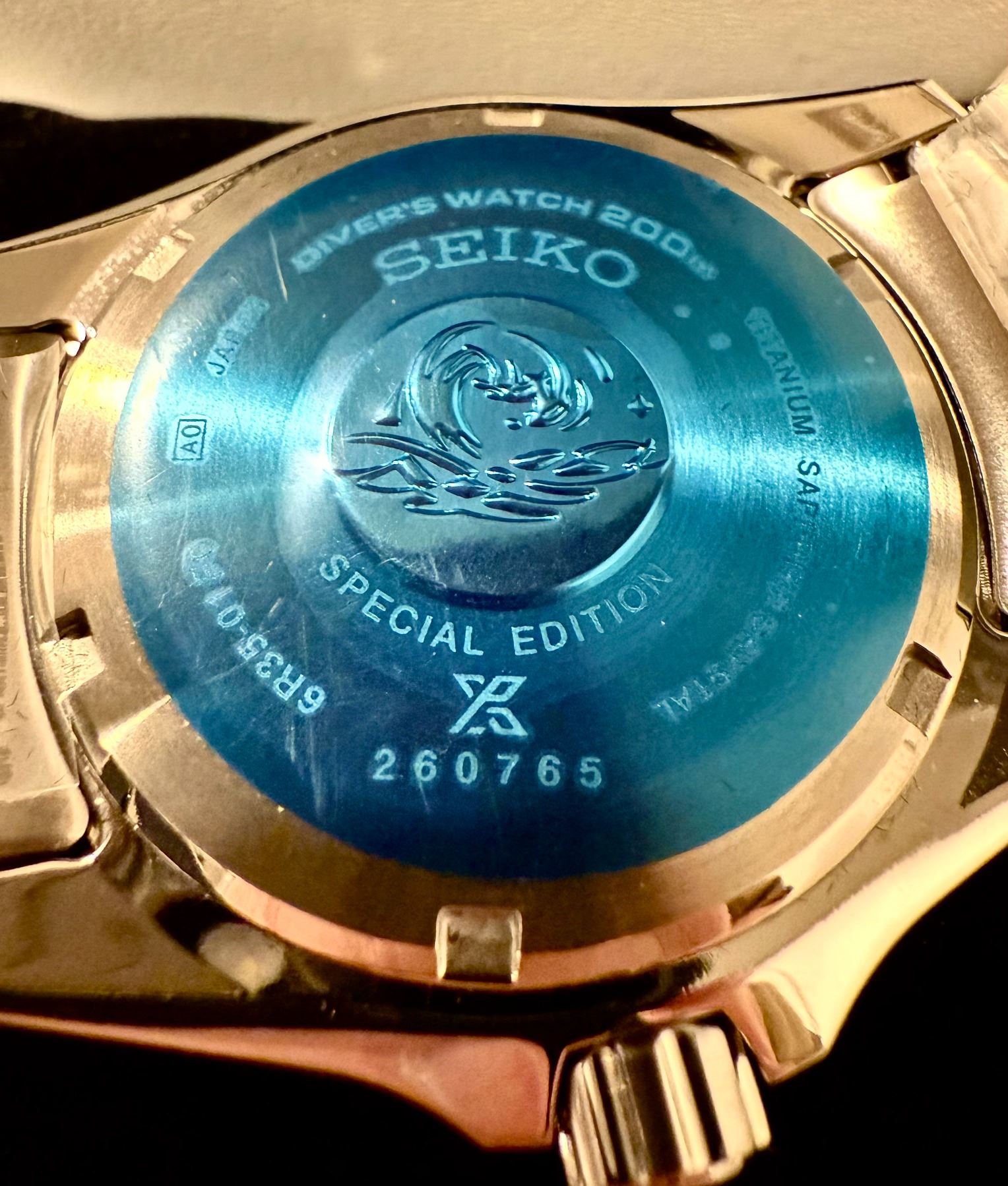 Seiko Prospex watches challenge every limit, for hunters, sports lovers and adventure seekers whether in the water, in the sky or on land. This watch is a Prospex U.S. Special Edition, designed for those who treat life as the ultimate adventure. This extraordinary design features a textured blue-green dial. It has a uni-directional rotating elapsed timing bezel in a subtle two-tone. Crafted of lightweight, durable titanium, with a scratch resistant super-hard coating, the distinctive case and bracelet are sharply angled, with the precise links creating an arrow shape. The dial includes a date calendar and LumiBrite hands and markers. It is topped by a sapphire crystal with anti-reflective coating on the inner surface. The screwdown crown and caseback, and tri-fold push button release clasp with secure lock and extender provide secure wear. Following ISO standards for scuba diving to depths of up to 200 meters, this exceptional timepiece offers manual winding capability and includes a 24-jewel automatic movement with a frequency of 21,600 vibrations per hour and a power reserve of approximately 70 hours. This watch includes a certified appraisal document for insurance purposes.