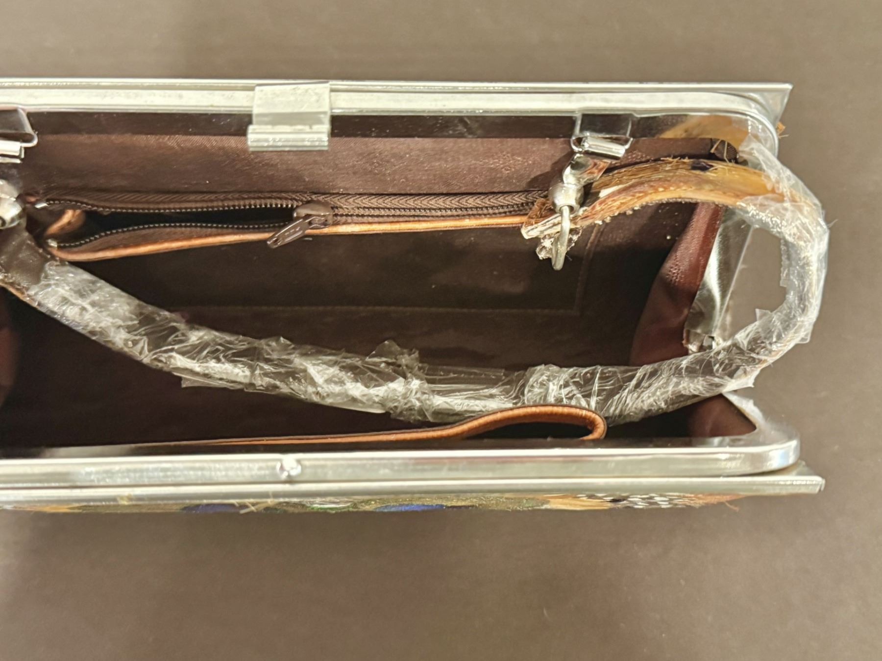This rare and vintage evening clutch or funky boho bag is decorated by hand with peacock and pheasant feathers. The meticulous handiwork required to create such a purse makes this a very special bag that you won't see anywhere else. This unique, eye-catching purse measures approximately 5"H x 9"L x 2-1/4"D, with feather covered strap, and trim also in feathers. It features a kiss-lock clasp closure. The inside is fully lined with a functional zip pocket on one side and an open pocket on the opposite side. This purse has the added benefit of entering you into the drawing for a 1-in-4 chance to win a Kimber Micro9 Sapphire Special Edition 9mm pistol.