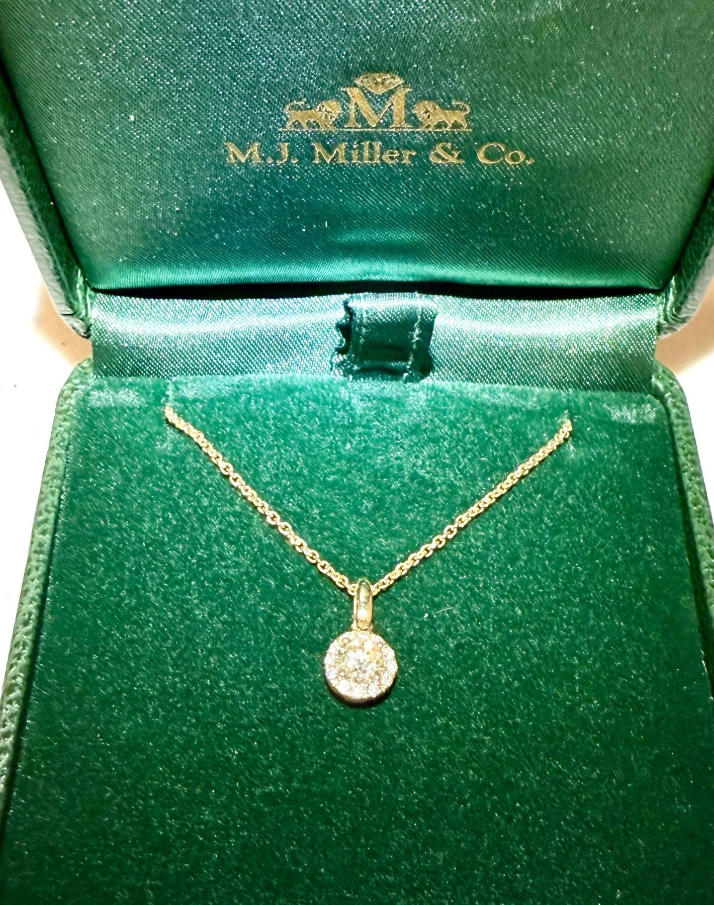 The brilliant sparkle of this diamond pendant is guaranteed to put a twinkle in her eye! The diamond is VS2 clarity with excellent cut and polish, with a weight over .41 carats. The centerpiece diamond is surrounded by 12 smaller round cut diamonds whose combined weight is .50 carats. This arrangement multiplies the flashes of brilliant eye-catching sparkles from this necklace. The setting is 14K yellow gold with a highly polished finish. The 18 inch chain is secured with a lobster claw clasp. This diamond necklace will be worn with pride and will attract attention and envy from women who value fine jewelry. Included is a certified appraisal document for insurance purposes. We thank Michael J. Miller for this 100% donation.