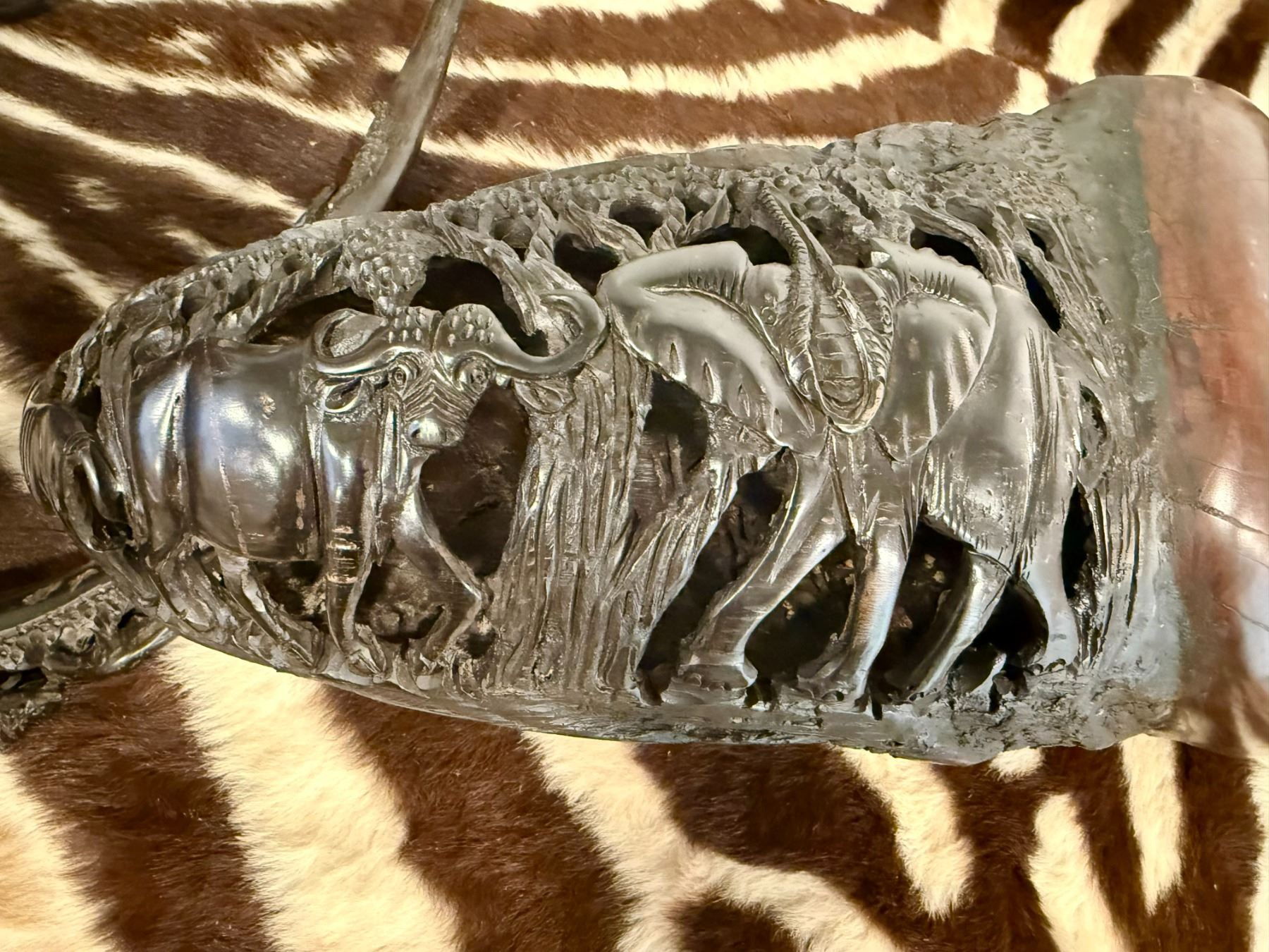 This is a matched pair of hand-carved Cape buffalo horns. You never see Cape buffalo horns used in artwork or crafts because they are so expensive and dangerous to hunt, and a matched pair is rarer still. These horns have been meticulously hand-carved by a tribal craftsman in Africa. The carvings depict the African "Big 5" on each of the horns. The wooden end caps, made from local African hardwood, have also been hand-carved and carefully hand-fitted by the craftsman. These one-of-a-kind horns would look great as a fascinating conversation piece in any home, office, or trophy room. These carved horns have become such a unique and extremely rare find that they can no longer be found even at the legendary SCI annual convention. They are only two places you can find these - here at our fundraiser, or somewhere in a small un-named village in the heart of Africa. Value: Practically Priceless!
