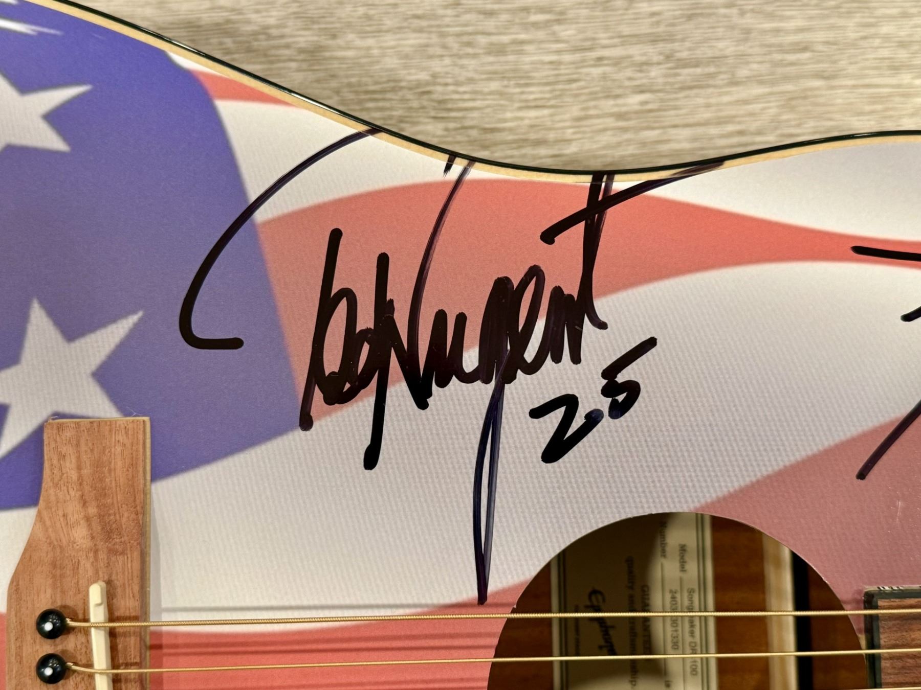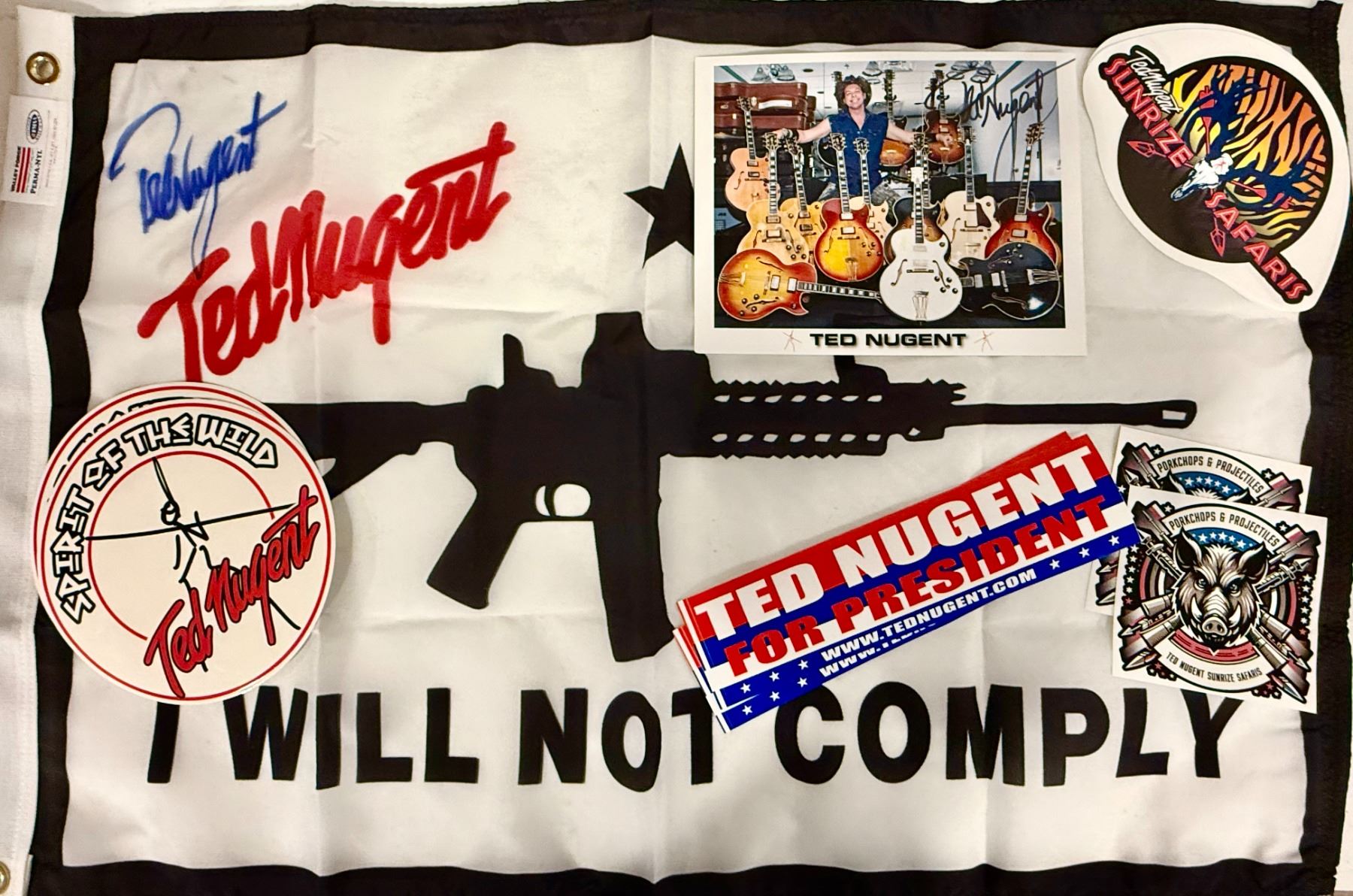 This Red, White, and Blue guitar is autographed by The Motor City Madman himself, Ted Nugent. Ted is an prominent advocate of our right to bear arms, having served on the board of the NRA. Ted has long been a supporter of hunters' rights as well as many conservative causes. This Epiphone acoustic guitar sports Ted's signature along with his famous Spirit of the Wild figure. This guitar is a great addition to any Man Cave and comes with a limited lifetime warranty through Gibson Brands. Also included is a signed 3' x 2' "I Will Not Comply" flag, a signed 8x10 photograph, and several Ted Nugent bumper stickers and decals. We thank Ted Nugent for this very generous donation.