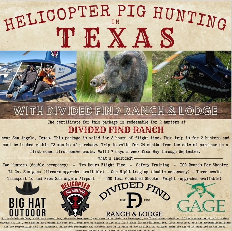 This helicopter hog hunt is for 2 hunters in an R-44 helicopter (double occupancy) with 2 hours of helicopter flight time included. One night's lodging (double occupancy) with all three meals prepared by an on-site chef. Includes use of 12 gauge shotguns, with upgrades to modern sporting rifles available. Includes 100 rounds of base ammunition and upgrade to unlimited ammo is available. Airport transportation to and from San Angelo Airport as well as transportation to helicopter take-off. Exotics Ranch Tour with side-by-side UTVs with an Exotics Guide/Biologist. Includes safety and shooting training in learning to clear the gun in flight as well as access to Sporting Clays shooting course and 1600-yard-long rifle range. Hanger entertainment - TV, Ping Pong, Big Buck Hunter, Corn Hole, Cards and non alcoholic drinks. Not included: additional ammo, alcoholic beverages (guests may bring their own), staff and house gratuities, additional flight time, firearm upgrades, weight upgrades, additional nights lodging. Additional hunter can be added if space is available. If the combined weight of 2 hunters exceeds 430 lbs each hunter must either fly solo for 1 hour or upgrade to fly solo for 2 hours for an additional fee. Costs associated with all of the aforementioned items are the responsibility of the purchaser. Helicopter passengers must be 18 years of age, no children under 12 permitted on the ranch. Value: $5,980