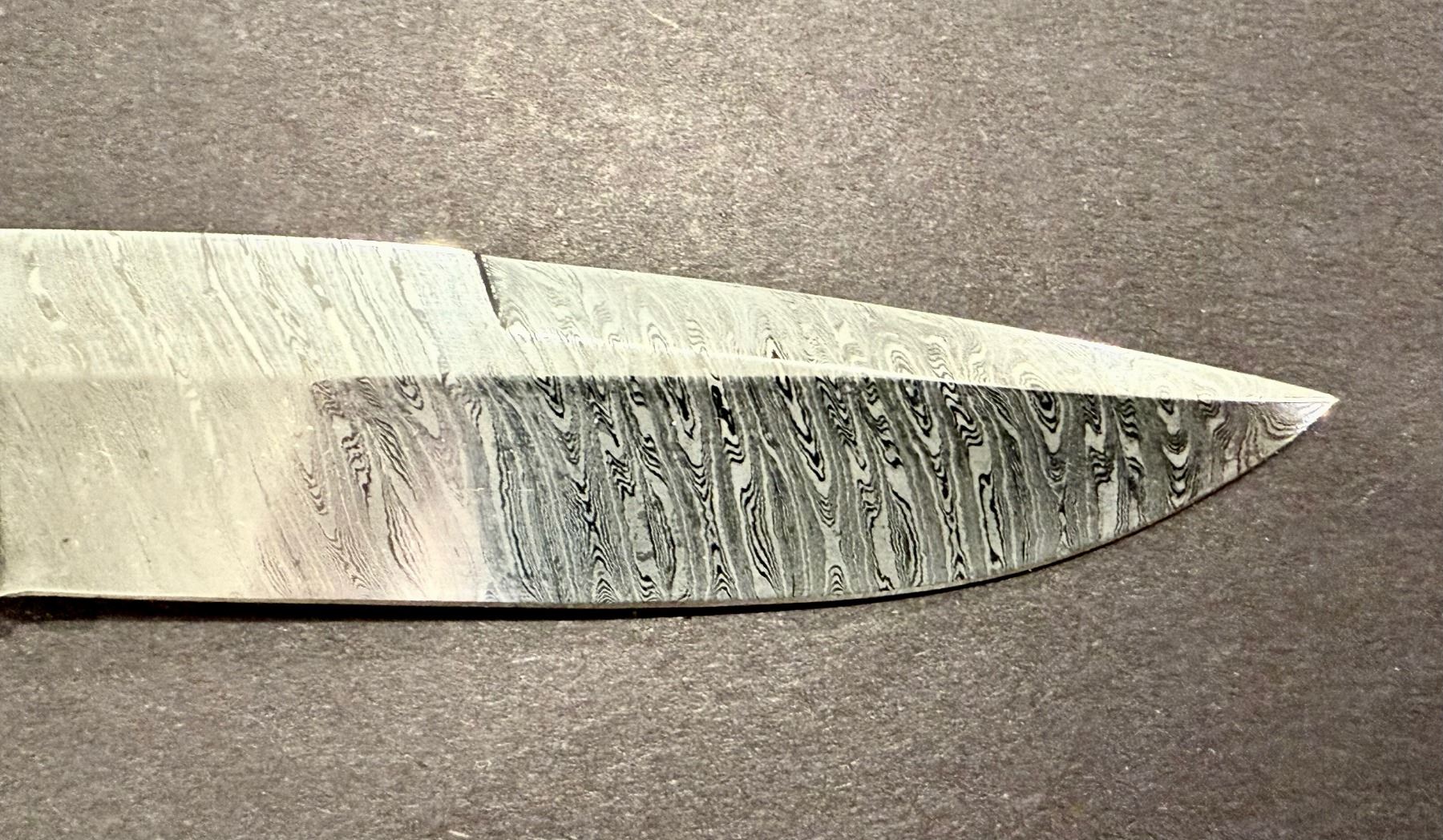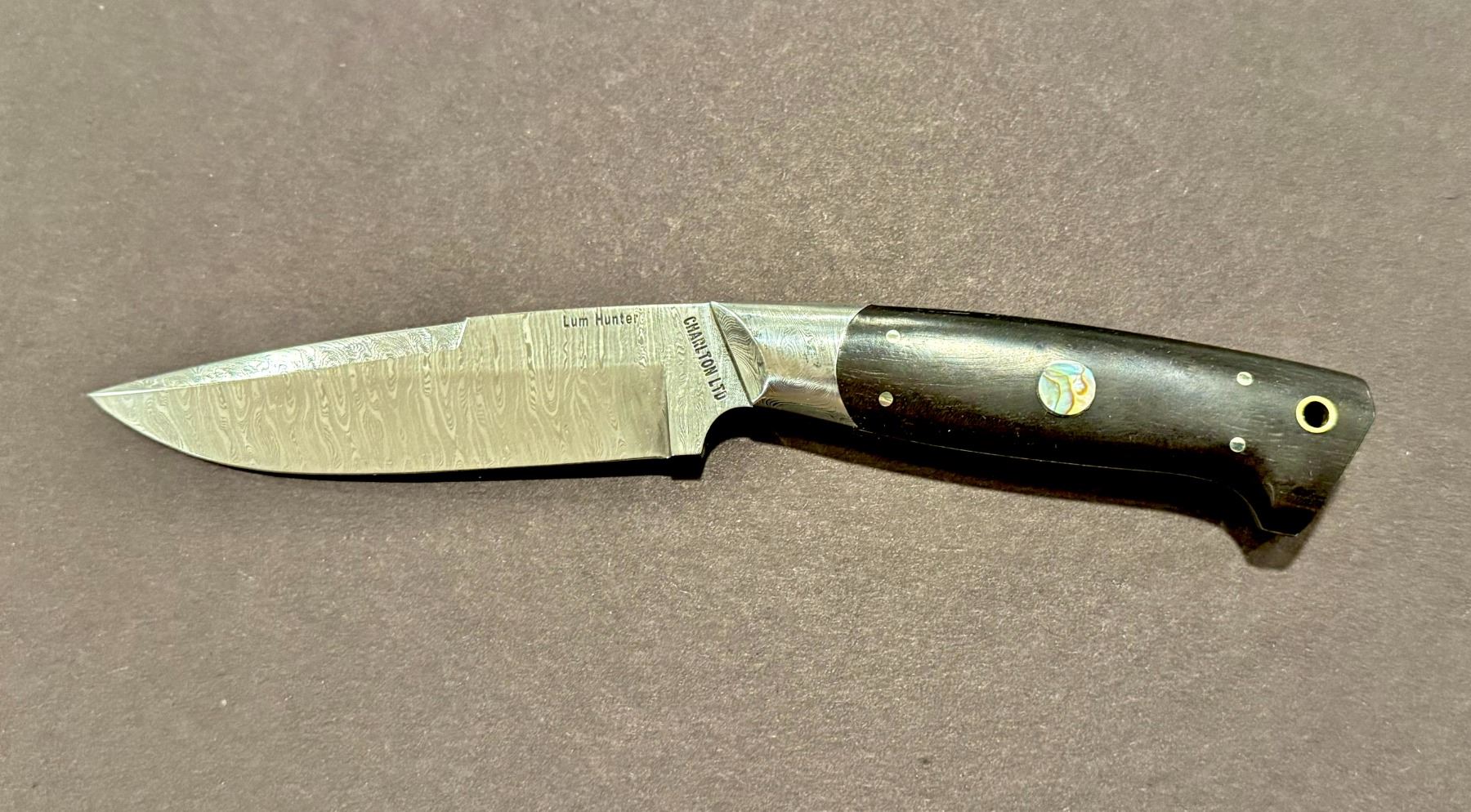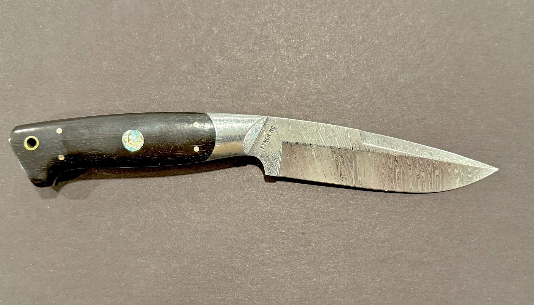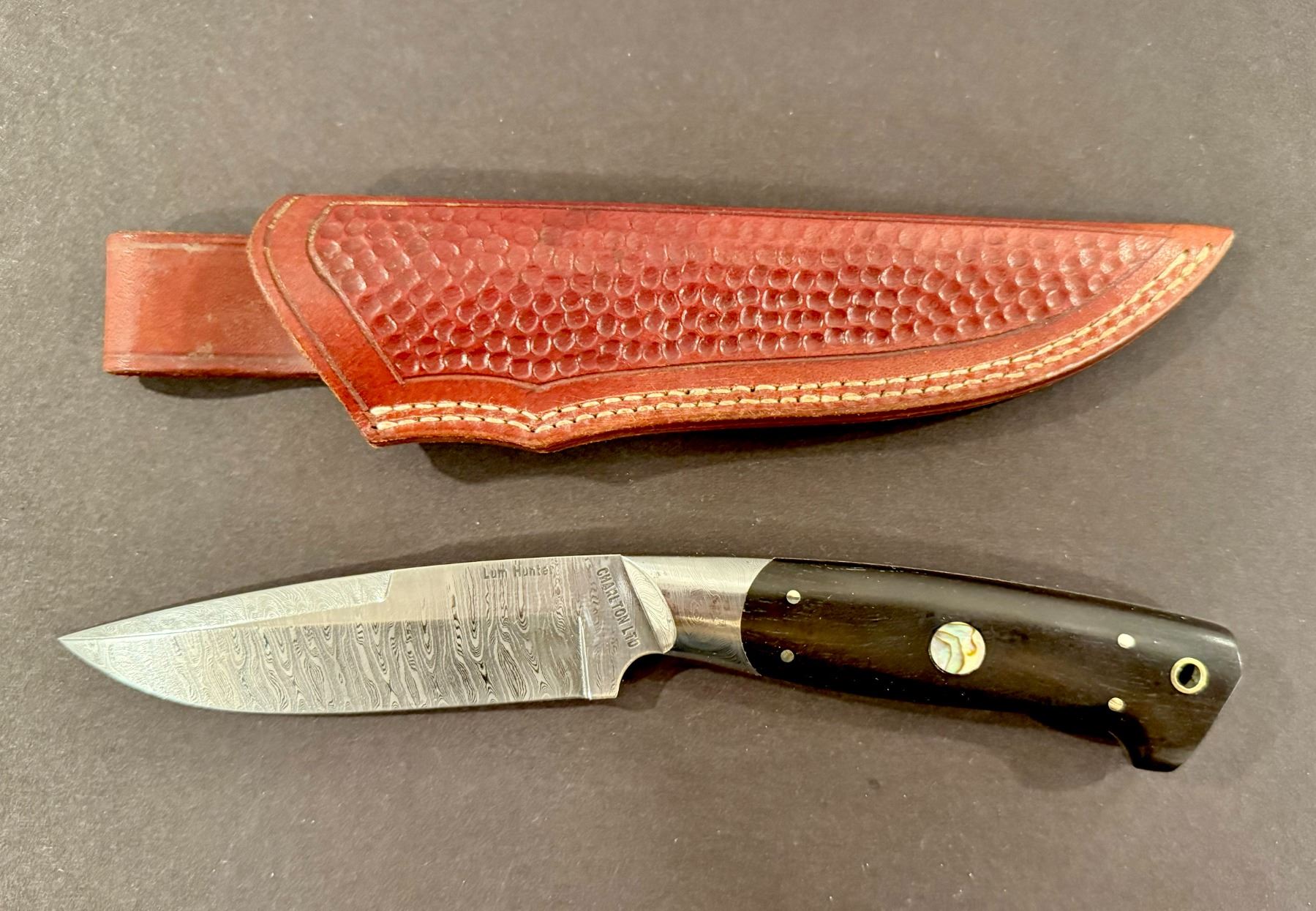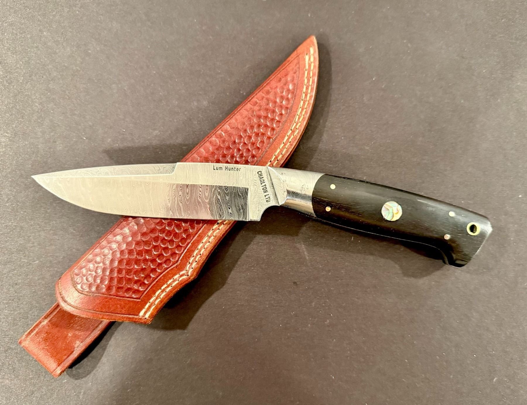 Never run out of edge on a hunt. This is a hand-forged Damascus hunting knife in the unique style of the renowned knife maker, the late Bob Lum. Every knowledgeable knife aficionado should have a Lum style knife, and certainly one or more Damascus steel knives in their collection. The blade on this knife is not just a pretty face. The 100% hand-forged blade uses a premium 1080/15n20 mix, heated and folded into hundreds of layers to create great stress resistance and superior cutting ability. The full-length tapered tang and Damascus bolster also show off the Damascus steel. The scales (handles) are an exquisite South African ebony wood, one of the world’s most expensive woods, causing it to be known as “Black Gold.” These scales, with the colorful mother-of-pearl insert, complement the beauty of the blade. Throughout history Damascus blades were often restricted in possession to those of noble birth. This is truly the ultimate for those desiring only the absolute finest in classic cutlery steel. This knife has a 4.5-inch blade and overall length of 9.0 inches. Includes a custom-fitted heavy-duty double-stitched hand-tooled leather sheath.