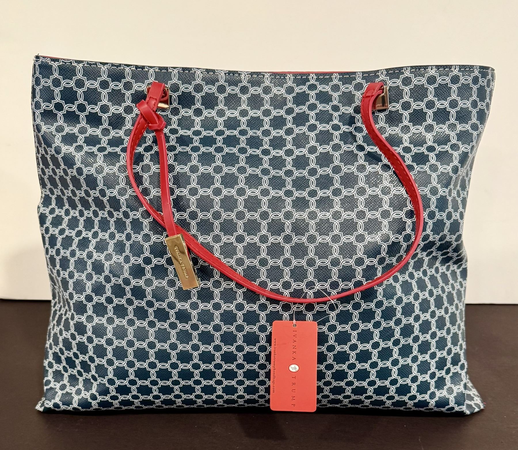Ivanka Trump is the epitome of class and elegance. Add stylish flair to any look with the Ivanka Trump Julia shopper tote. This handbag is a perfect blend of fashion, flair and function and is perfect for day or night! Faux leather tote in a beautiful navy blue and red with top snap closure. It features flat handles with 10" drop and logo keychain included. Fabric lining with zip pocket and three slip pockets Dimensions 19" x 4½" x 10½". This purse has the added benefit of entering you into the drawing for a 1-in-4 chance to win a Kimber Micro9 Sapphire Special Edition 9mm pistol.