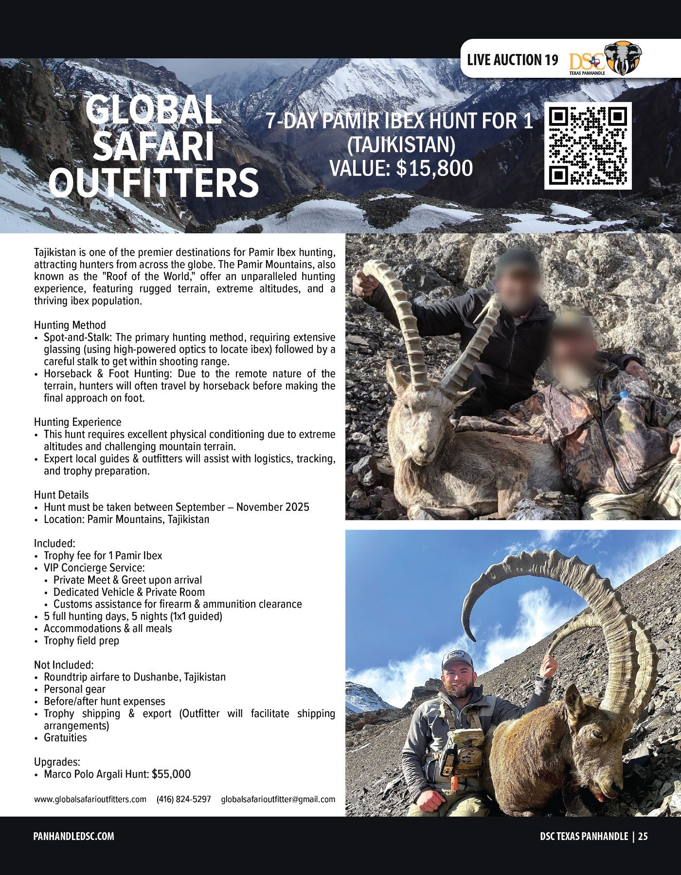 Lot 19 PAMIR IBEX HUNT FOR 1 (TAJIKISTAN) W/ GLOBAL SAFARI OUTFITTERS