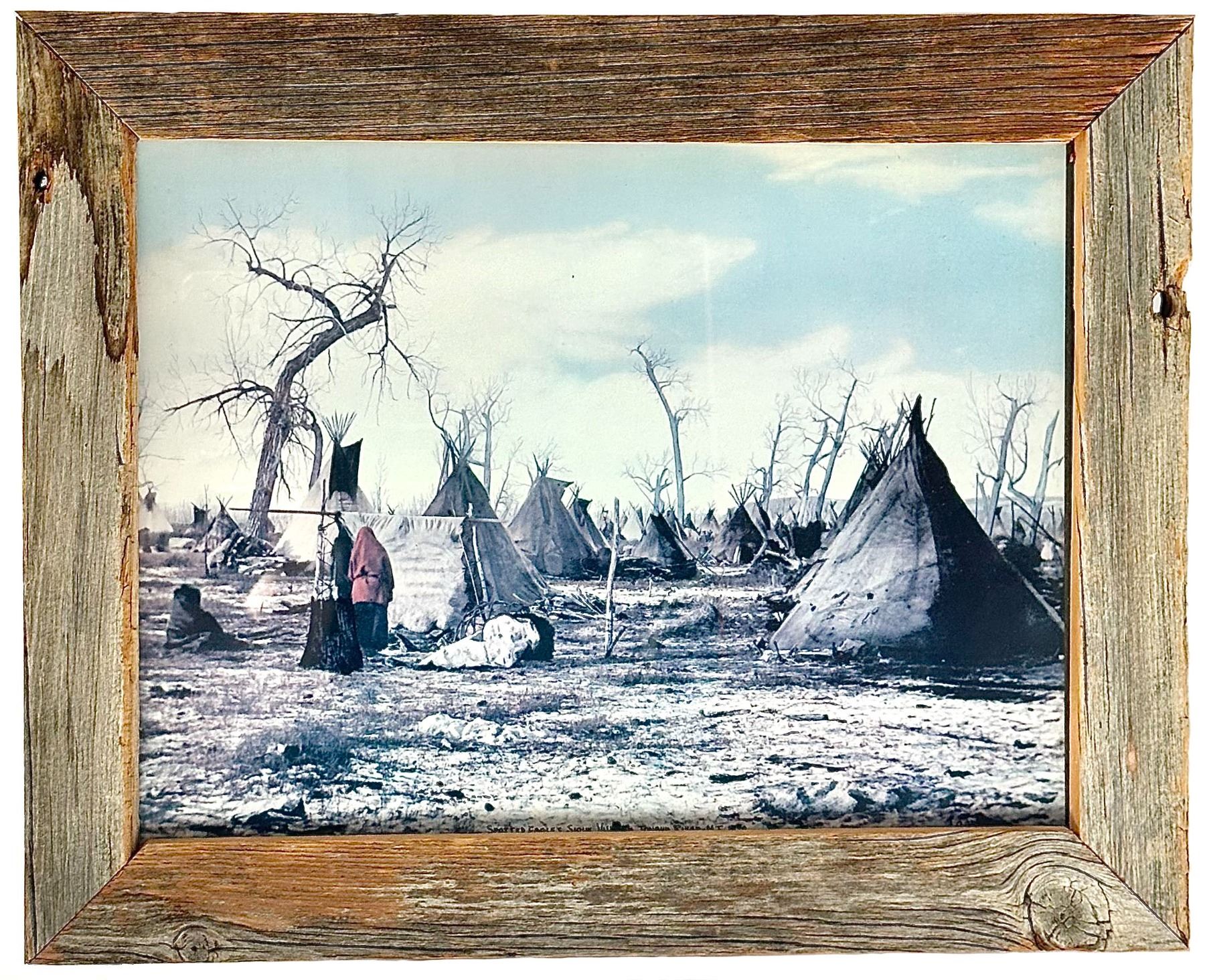Barn wood frame, 17 x 13" photo stamped 'Spotted Eagle's Sioux Village, Tongue River, MI, 1879.