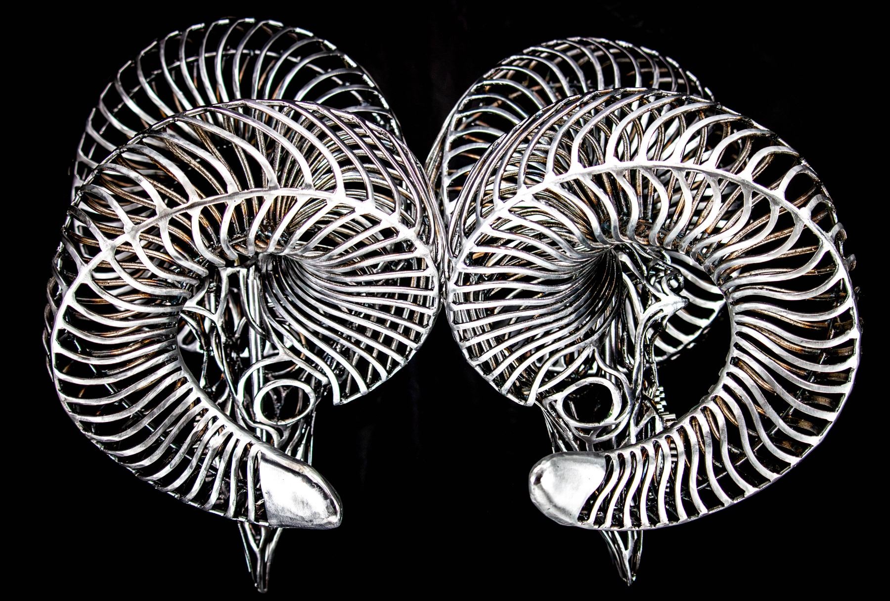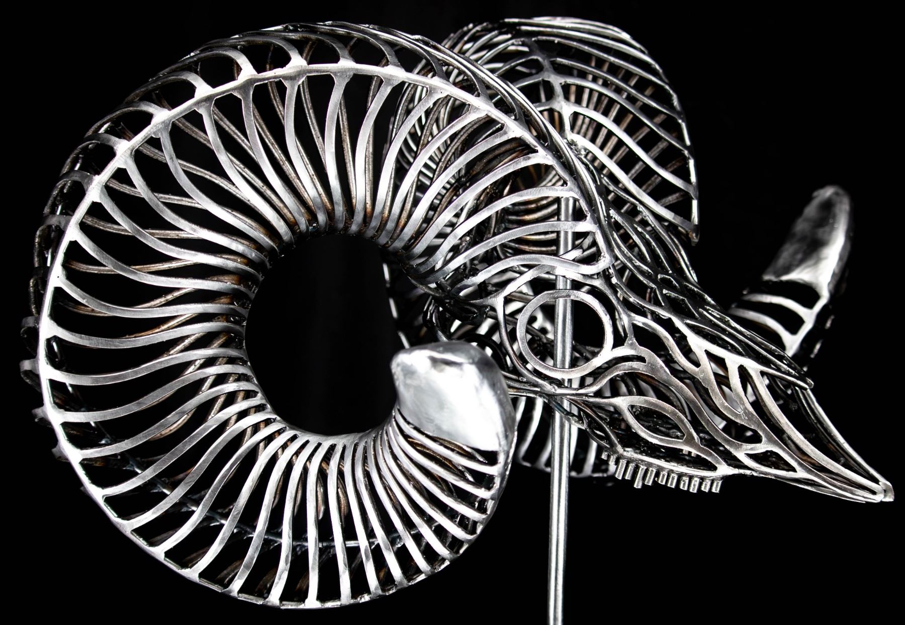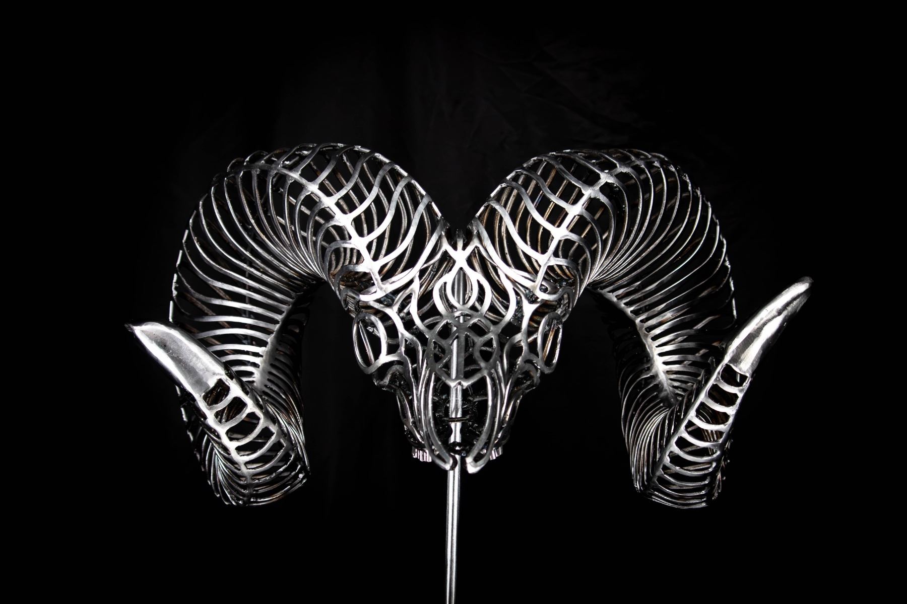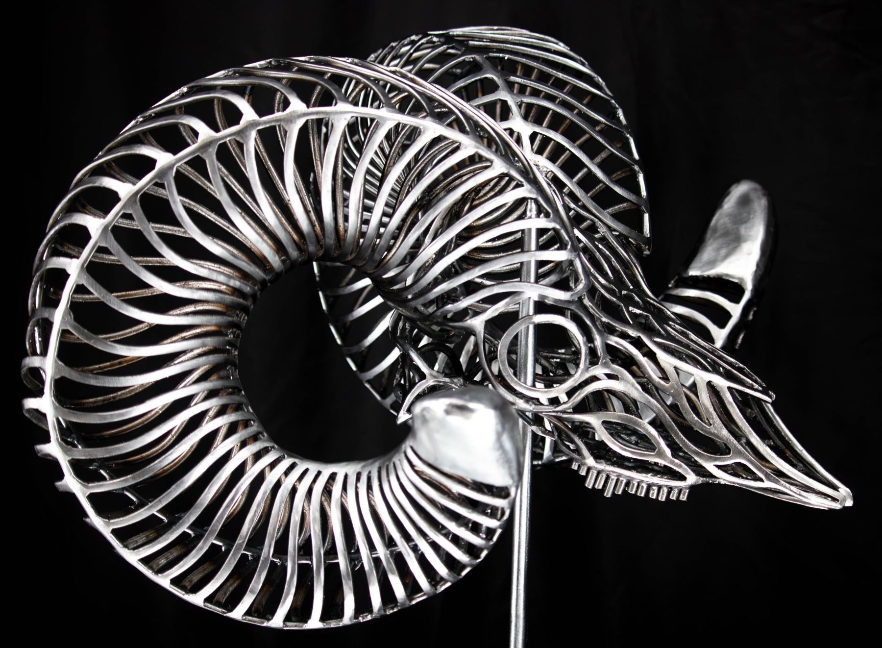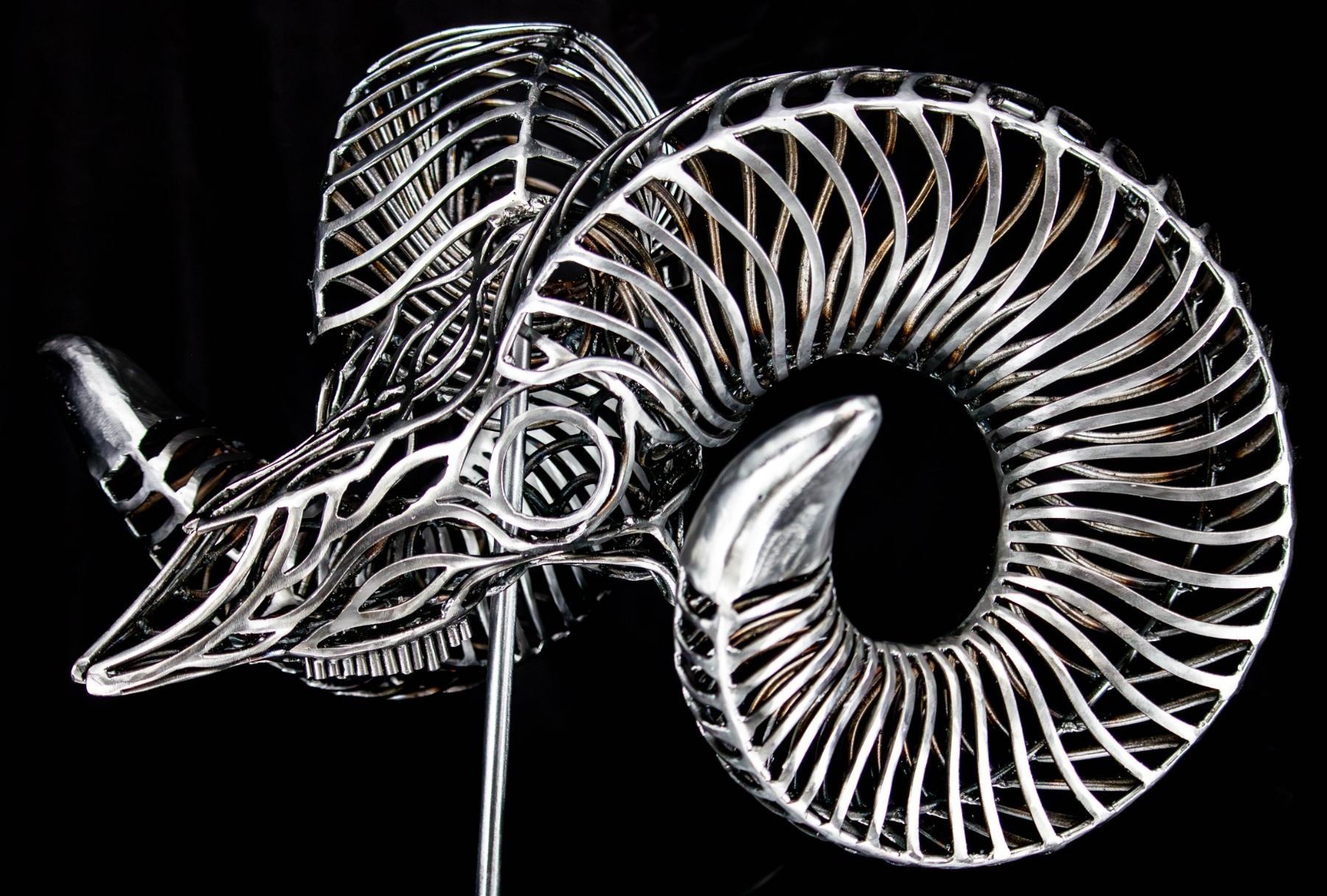 In my sculptures, I meticulously sculpt these intricately adorned ram skulls, paying close attention to every detail. By strategically placing the bent metal pieces, I achieve a harmonious fusion of abstract aesthetics and lifelike representation, ensuring an authentic portrayal of the bighorn sheep.