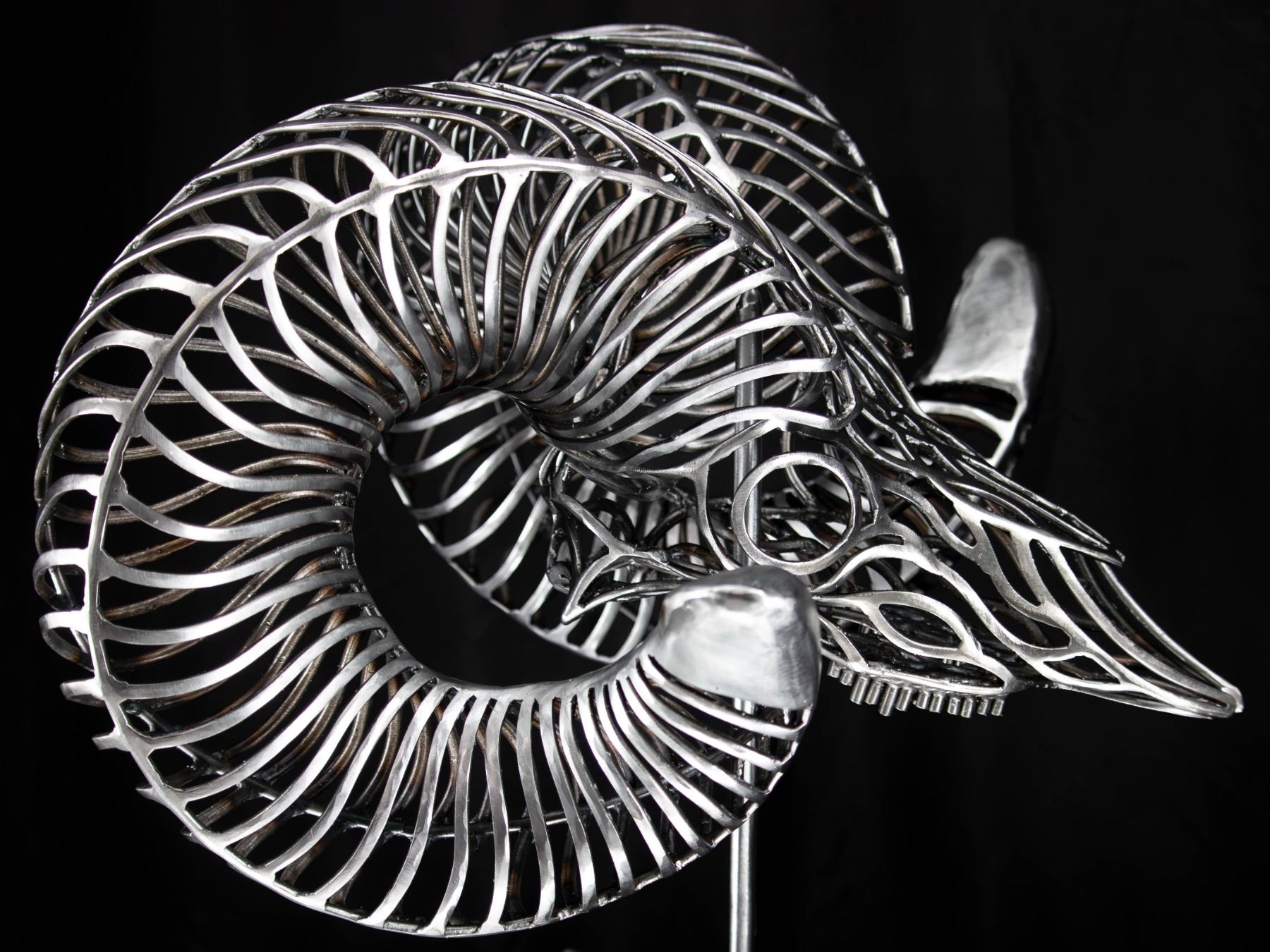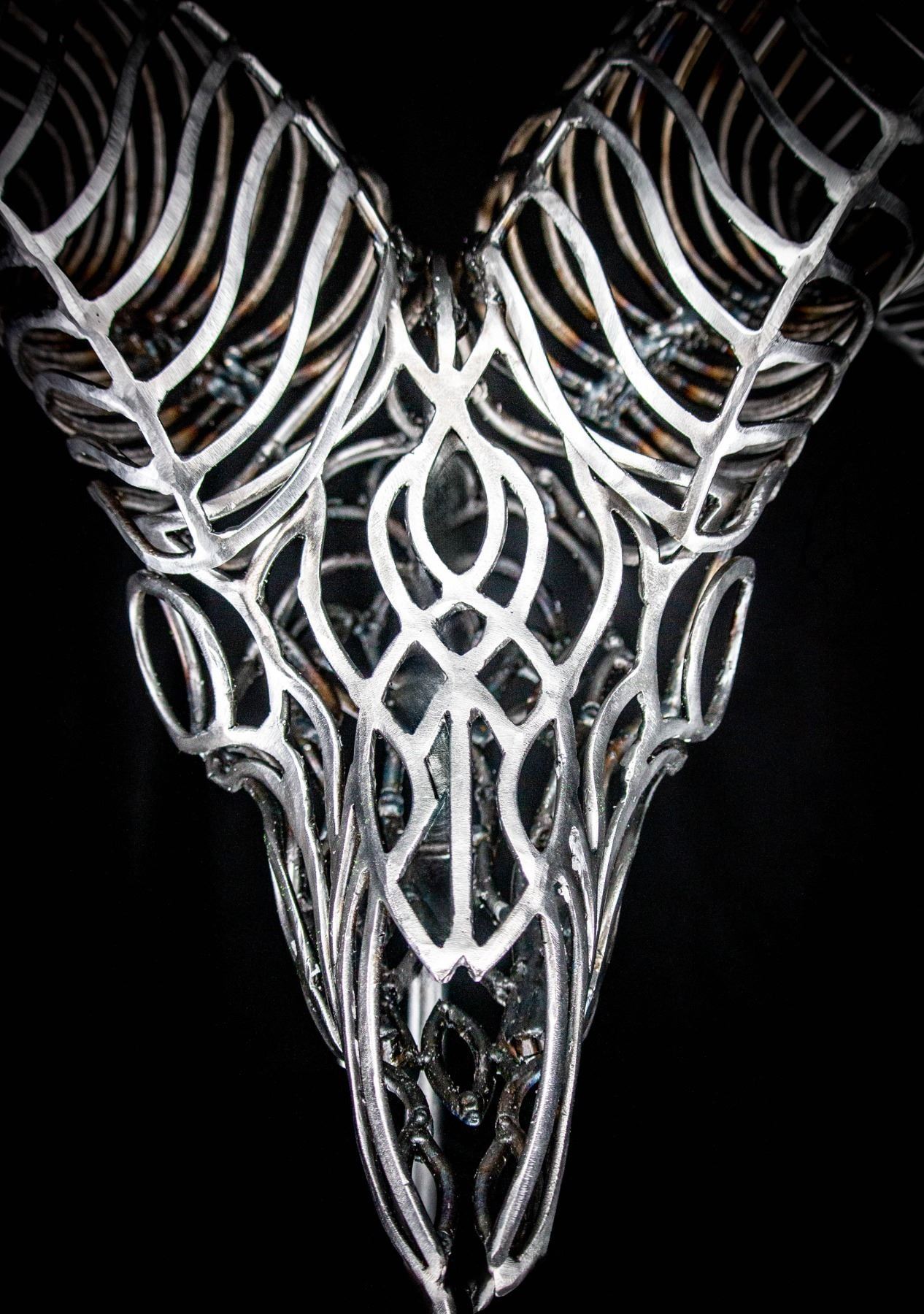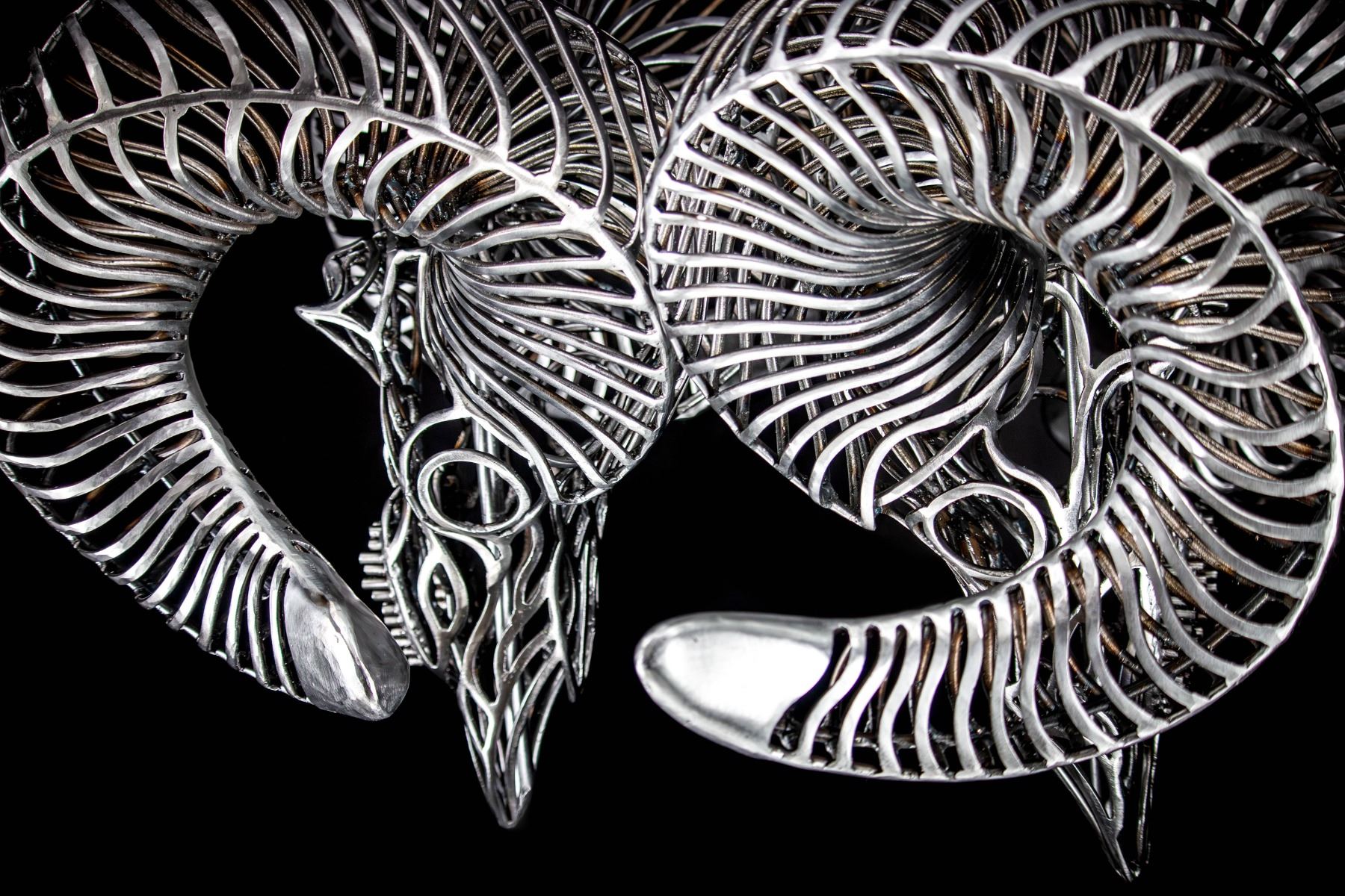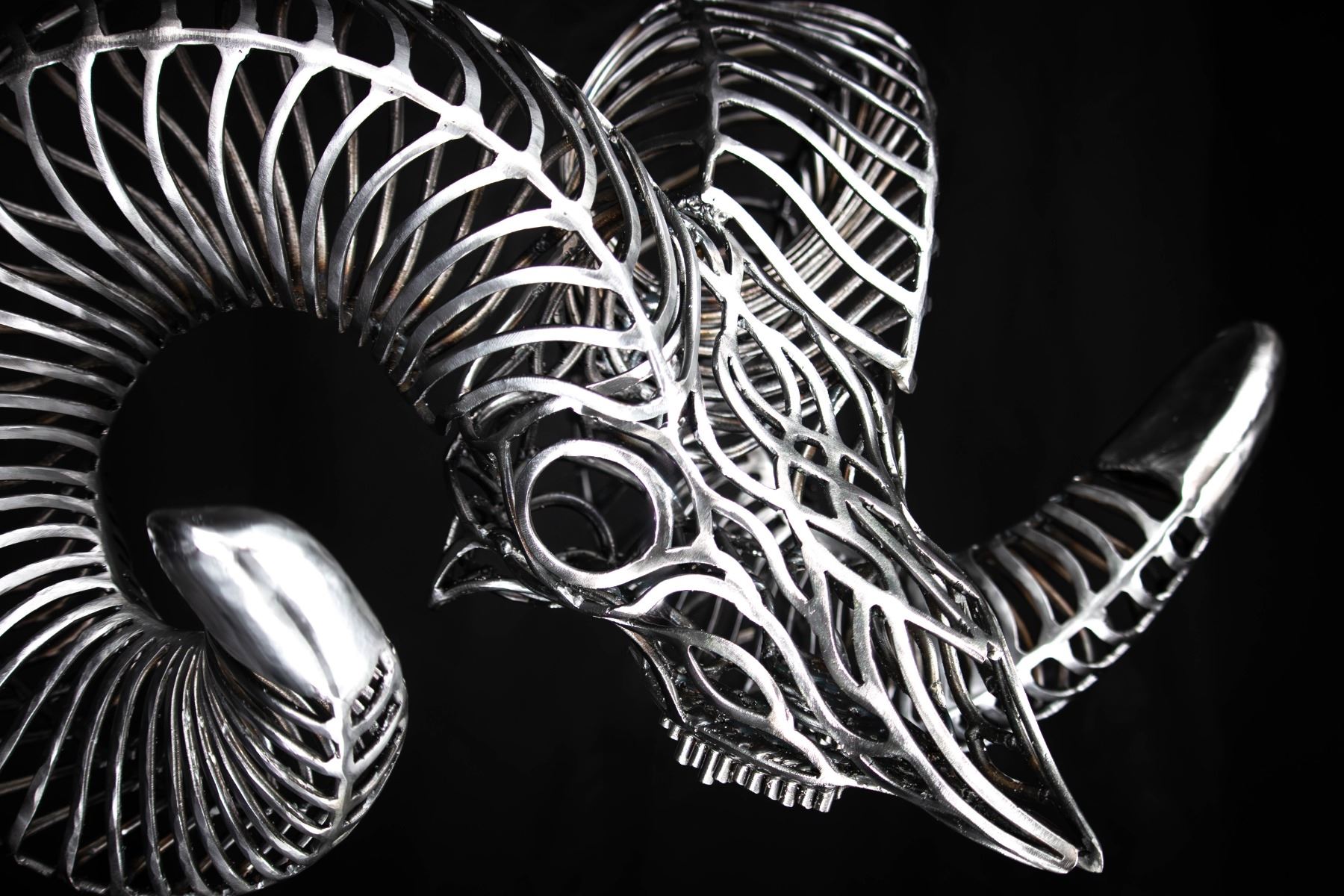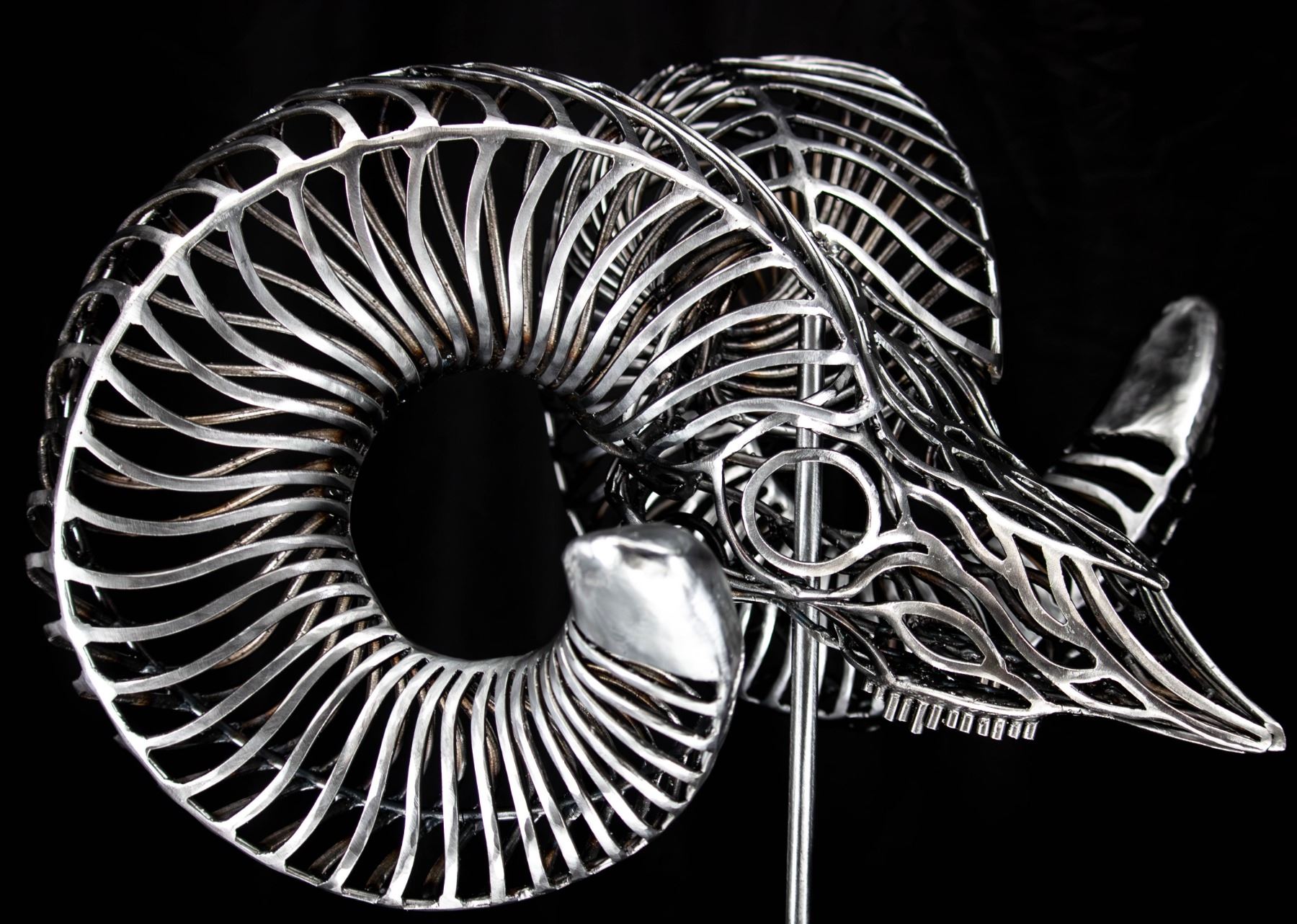 In my sculptures, I meticulously sculpt these intricately adorned ram skulls, paying close attention to every detail. By strategically placing the bent metal pieces, I achieve a harmonious fusion of abstract aesthetics and lifelike representation, ensuring an authentic portrayal of the bighorn sheep.