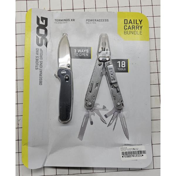 Includes folding knife and multi-tool. Lightly damaged Packaging.
